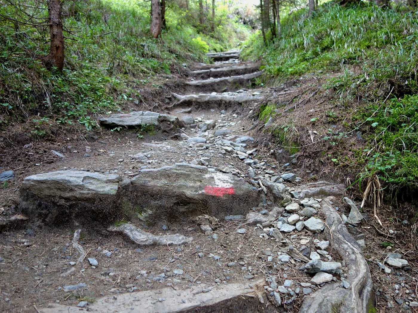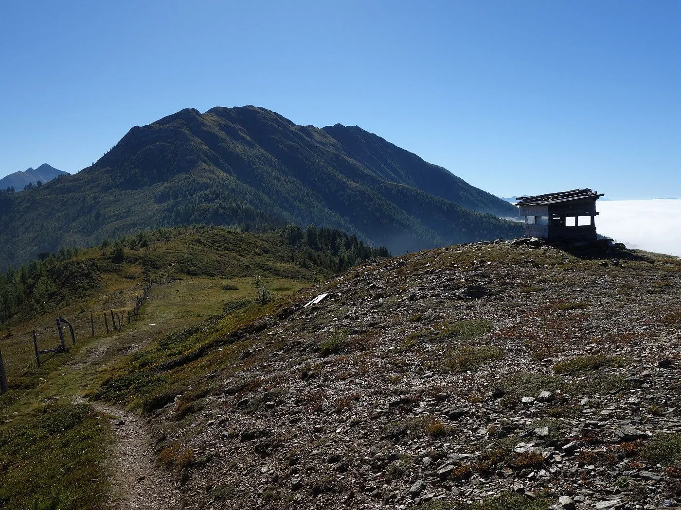 Über den bekannten Steig zurück zum Loneskopf (2248m) und bergab über den steilen Kammaufschwung bis zum Wegweiser "Ederplan - Rundwanderung klein" (2060m). Links über den Steig durch bewaldetes Gebiet zur ersten großen Lichtung und von dort nordwestwärts zu den Almen (1935m) unterhalb des Anna-Schutzhauses. Von dort über den bekannten Steig zurück zum Ausgangspunkt am Zwischenberger Sattel (1460m).