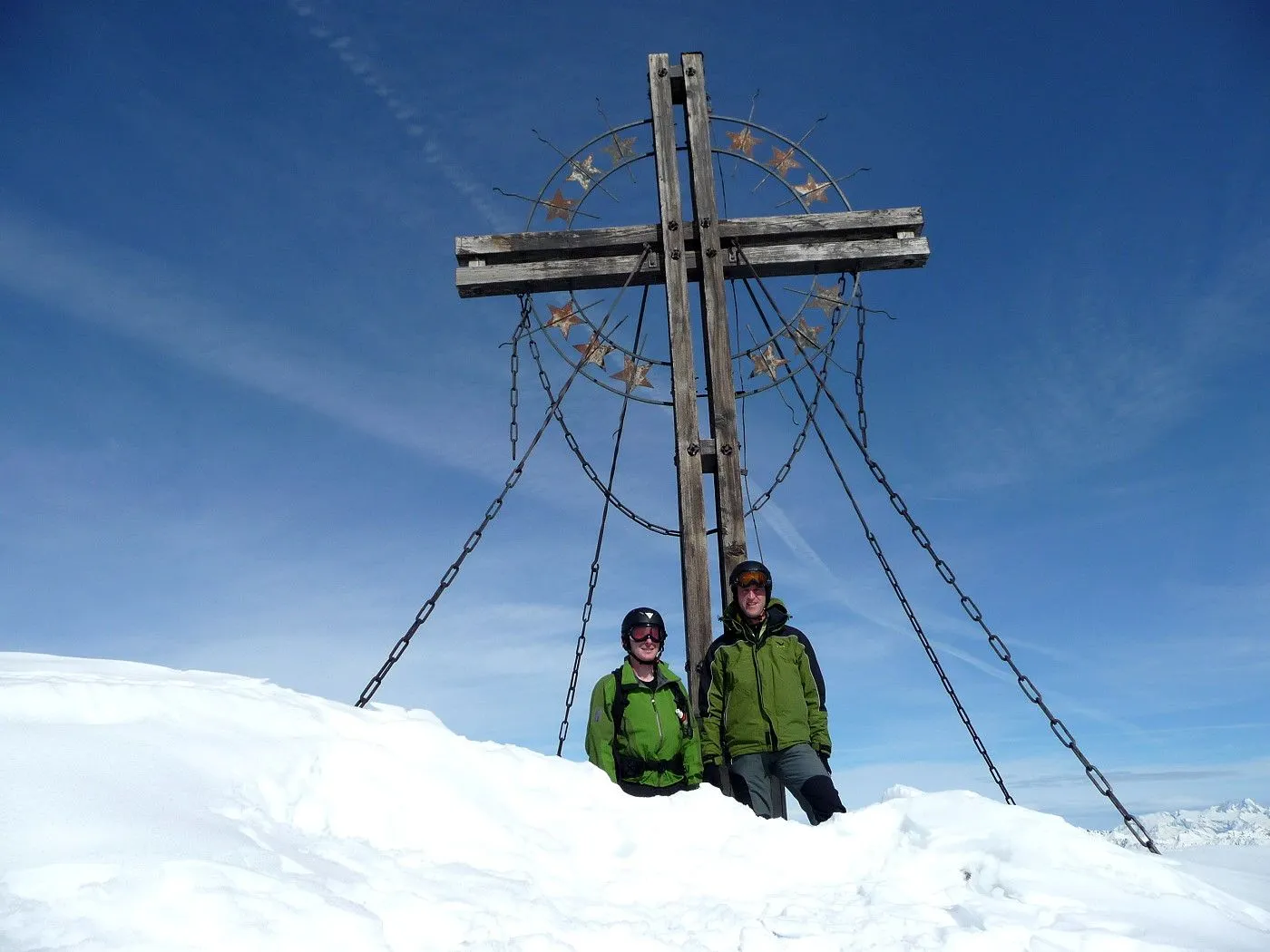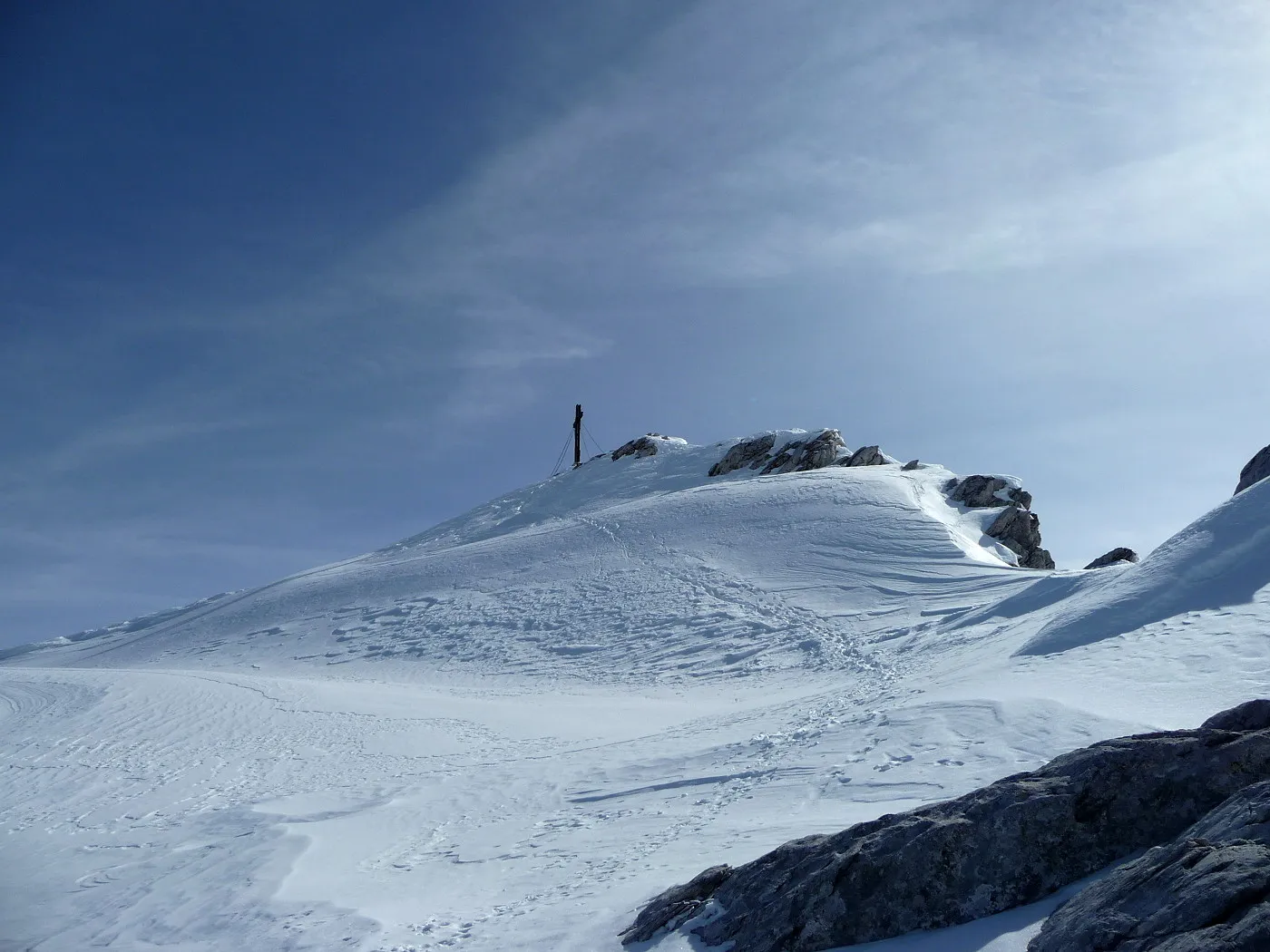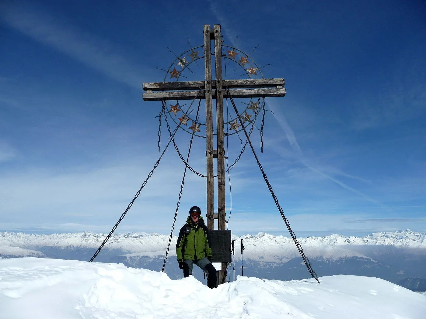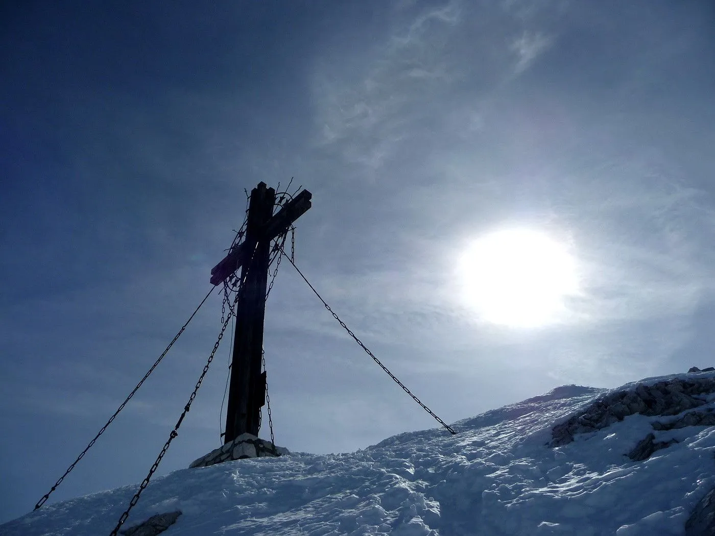 Die Große Kinigat (ital. Monte Cavallino) ist, nach der Hohen Warte und dem Hochweißstein, mit 2689m der dritthöchste Berg der Karnischen Alpen und liegt an der Grenze zwischen Osttirol und der italienischen Provinz Belluno. Im Juni 1979 wurde am Gipfel das beeindruckende Europakreuz errichtet, an welchem auch eine Gedenktafel mit der Inschrift „Nie wieder Krieg“ angebracht wurde. Die Besteigung dieses Gipfels mit Ski gehört zu den sehr schwierigen in dieser Gebirgsgruppe, wenngleich der Aufstieg bis zum Filmoorsattel auch für weniger erfahrene Skitourengeher machbar ist. Die Querung vom Filmoorsattel bis zur Aufstiegsrampe kann nur bei absolut sicheren Verhältnissen durchgeführt werden. Die anschließende Aufstiegsrampe selbst kann man auch nur bei sehr günstigen Bedingungen besteigen, wie man sie eigentlich nur im Frühjahr vorfindet. Sicherheitshalber sollte man jedenfalls Steigeisen mitnehmen, da sich die Sicherungsseile entlang der Rampe zumeist unter dem Schnee befinden und diese Passage sehr exponiert ist. Es sei hier ausdrücklich betont, dass über die Aufstiegsrampe stets absolute Absturzgefahr besteht! Die Skitour auf die Große Kinigat wird daher nur erfahrenen und konditionsstarken Skitourengehern vorbehalten sein und sollte aufgrund der Schwierigkeiten ab dem Filmoorsattel nur bei sehr sicheren Bedingungen durchgeführt werden.