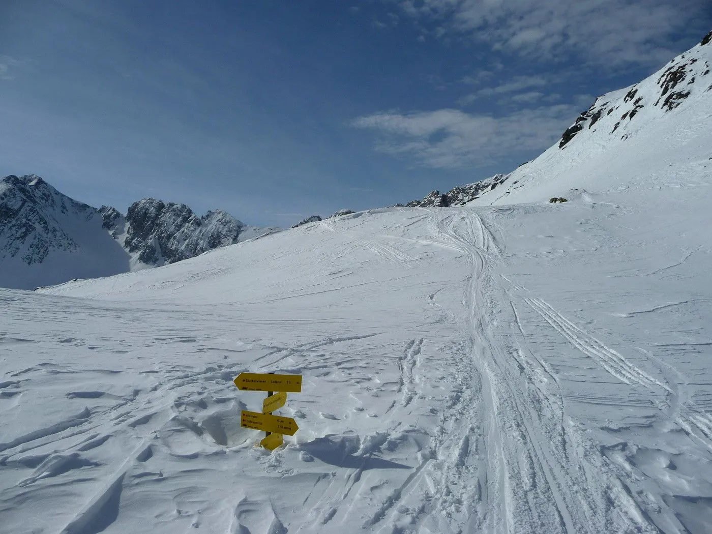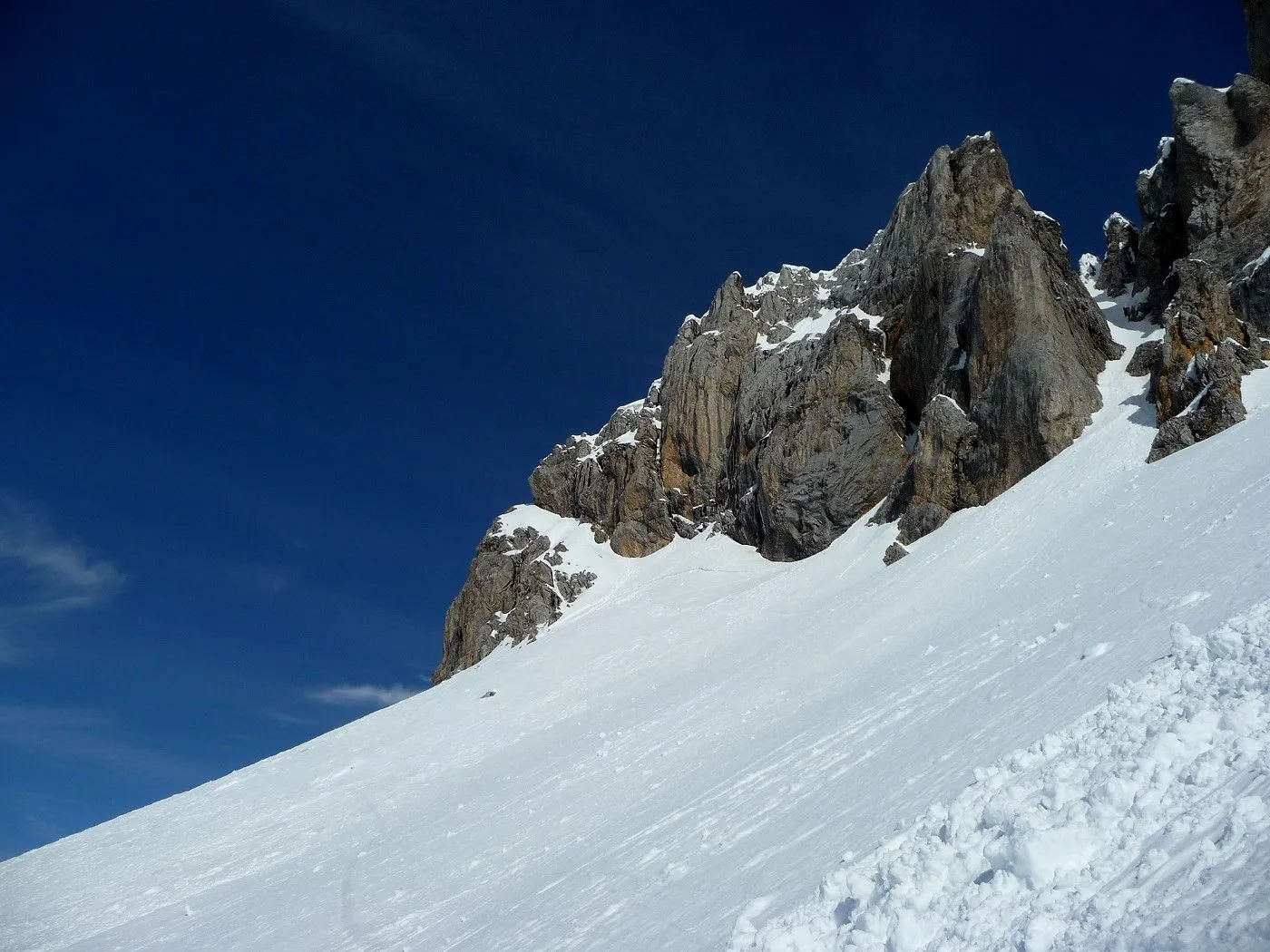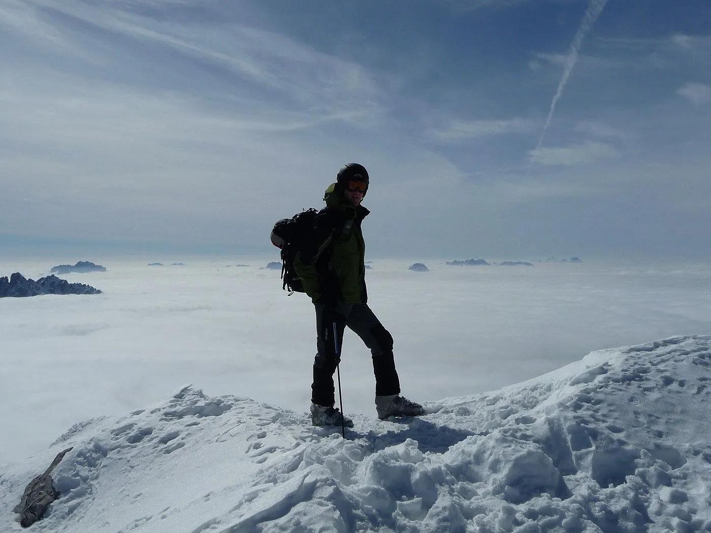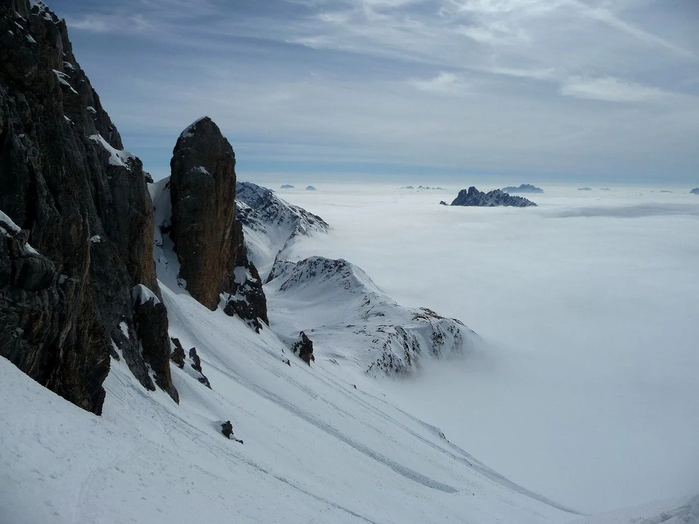 Die Große Kinigat (ital. Monte Cavallino) ist, nach der Hohen Warte und dem Hochweißstein, mit 2689m der dritthöchste Berg der Karnischen Alpen und liegt an der Grenze zwischen Osttirol und der italienischen Provinz Belluno. Im Juni 1979 wurde am Gipfel das beeindruckende Europakreuz errichtet, an welchem auch eine Gedenktafel mit der Inschrift „Nie wieder Krieg“ angebracht wurde. Die Besteigung dieses Gipfels mit Ski gehört zu den sehr schwierigen in dieser Gebirgsgruppe, wenngleich der Aufstieg bis zum Filmoorsattel auch für weniger erfahrene Skitourengeher machbar ist. Die Querung vom Filmoorsattel bis zur Aufstiegsrampe kann nur bei absolut sicheren Verhältnissen durchgeführt werden. Die anschließende Aufstiegsrampe selbst kann man auch nur bei sehr günstigen Bedingungen besteigen, wie man sie eigentlich nur im Frühjahr vorfindet. Sicherheitshalber sollte man jedenfalls Steigeisen mitnehmen, da sich die Sicherungsseile entlang der Rampe zumeist unter dem Schnee befinden und diese Passage sehr exponiert ist. Es sei hier ausdrücklich betont, dass über die Aufstiegsrampe stets absolute Absturzgefahr besteht! Die Skitour auf die Große Kinigat wird daher nur erfahrenen und konditionsstarken Skitourengehern vorbehalten sein und sollte aufgrund der Schwierigkeiten ab dem Filmoorsattel nur bei sehr sicheren Bedingungen durchgeführt werden.