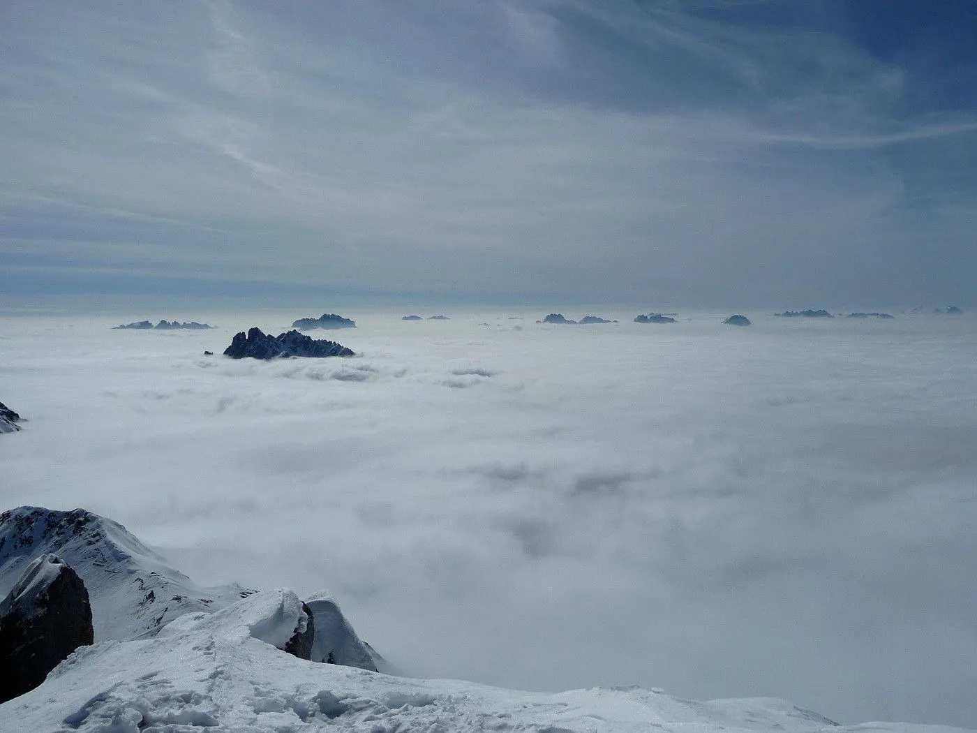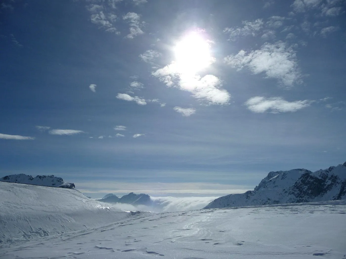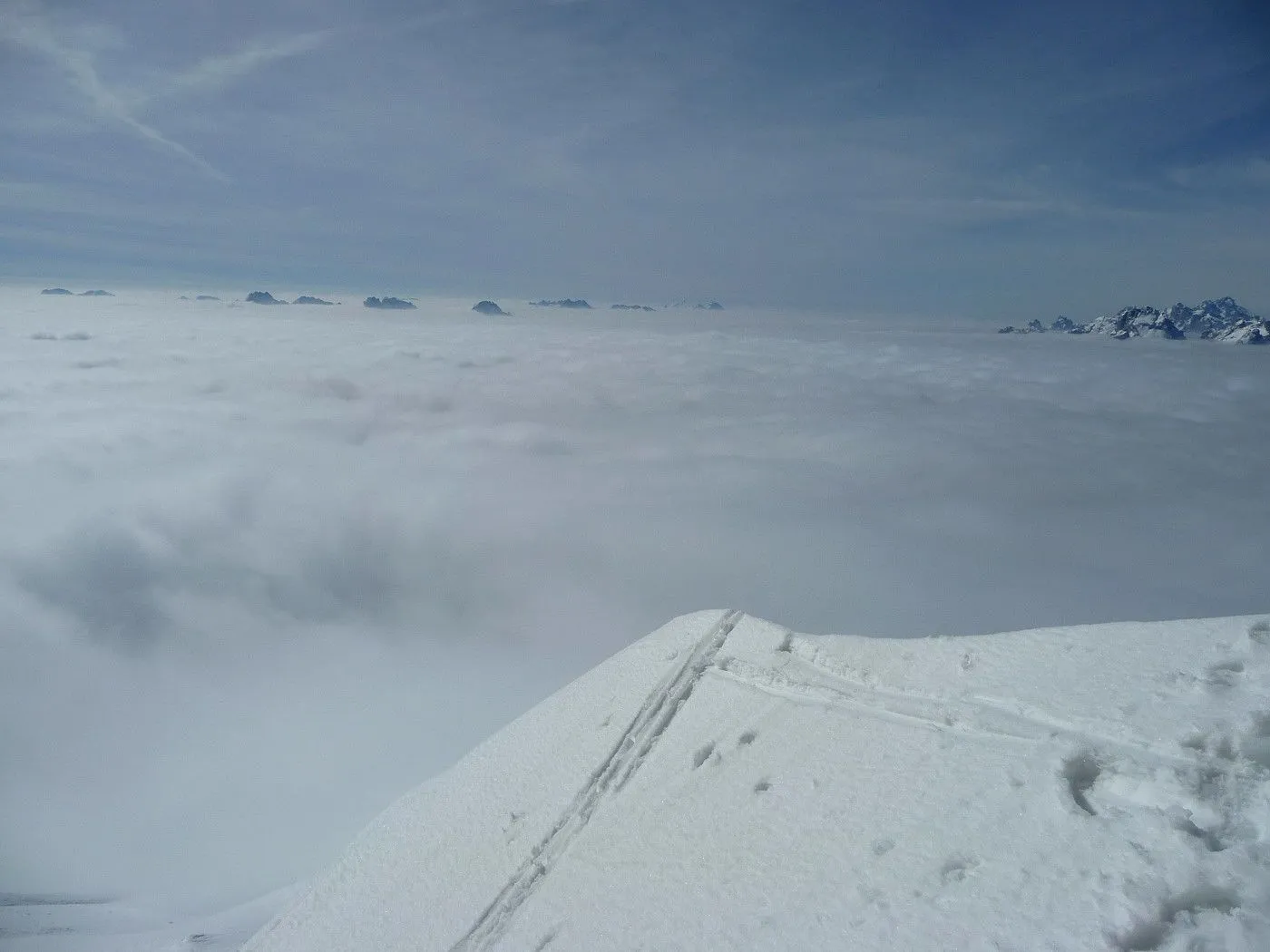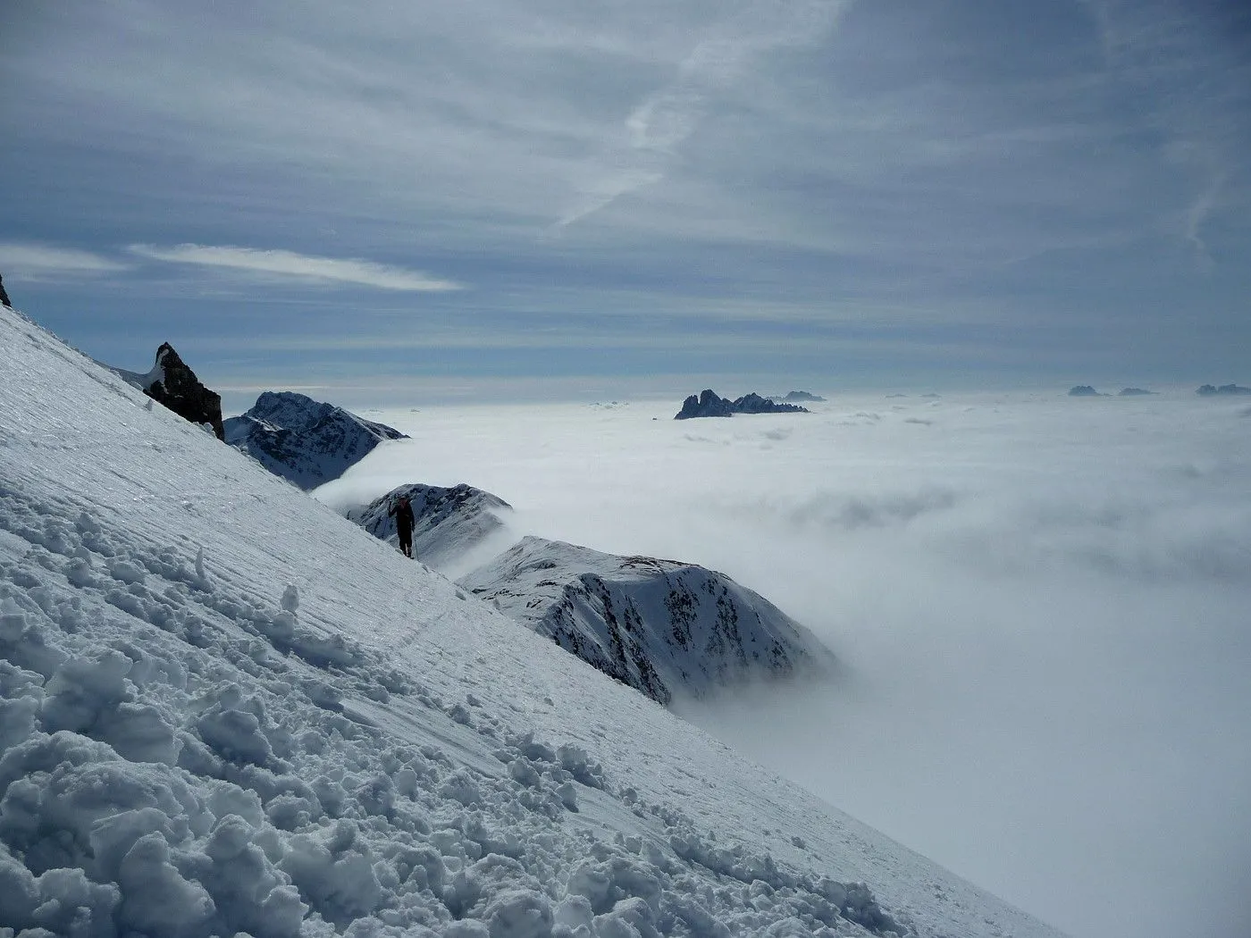 Die Große Kinigat (ital. Monte Cavallino) ist, nach der Hohen Warte und dem Hochweißstein, mit 2689m der dritthöchste Berg der Karnischen Alpen und liegt an der Grenze zwischen Osttirol und der italienischen Provinz Belluno. Im Juni 1979 wurde am Gipfel das beeindruckende Europakreuz errichtet, an welchem auch eine Gedenktafel mit der Inschrift „Nie wieder Krieg“ angebracht wurde. Die Besteigung dieses Gipfels mit Ski gehört zu den sehr schwierigen in dieser Gebirgsgruppe, wenngleich der Aufstieg bis zum Filmoorsattel auch für weniger erfahrene Skitourengeher machbar ist. Die Querung vom Filmoorsattel bis zur Aufstiegsrampe kann nur bei absolut sicheren Verhältnissen durchgeführt werden. Die anschließende Aufstiegsrampe selbst kann man auch nur bei sehr günstigen Bedingungen besteigen, wie man sie eigentlich nur im Frühjahr vorfindet. Sicherheitshalber sollte man jedenfalls Steigeisen mitnehmen, da sich die Sicherungsseile entlang der Rampe zumeist unter dem Schnee befinden und diese Passage sehr exponiert ist. Es sei hier ausdrücklich betont, dass über die Aufstiegsrampe stets absolute Absturzgefahr besteht! Die Skitour auf die Große Kinigat wird daher nur erfahrenen und konditionsstarken Skitourengehern vorbehalten sein und sollte aufgrund der Schwierigkeiten ab dem Filmoorsattel nur bei sehr sicheren Bedingungen durchgeführt werden.
