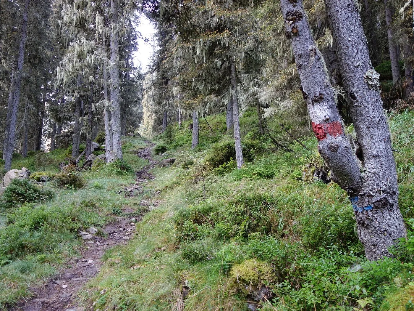 Am südlichen Ende des Parkplatzes weist ein Wegweiser mit der Aufschrift "Trelebitschalm" auf einen markierten Steig, der zunächst relativ flach talauswärts verläuft. Kurz darauf beginnt der Weg steiler entlang des Trelebitschbaches anzusteigen. Nach einer Bachquerung nach links erreicht man den Abzweig zur Nußdorfer Alm. Hier hält man sich rechts und gelangt wenig später zur Trelebitschalm (1976m). Von dort führt der Steig südwärts durch niedrige Vegetation zügig bergauf zur Talschwelle, wo sich weite Wiesenflächen ausbreiten. Bereits hier erkennt man auf der rechten Talseite den markanten Trelebitschkopf, der als hilfreiche Orientierung dient. Der nun fast ebene Pfad wechselt über den Bach auf die linke Seite, wo bald der Abzweig zu den Neualplseen erreicht wird. Dem Wegweiser "Trelebitschtörl" folgend, quert man erneut den Bach, nun westwärts leicht ansteigend über offene Wiesenböden, ehe der markierte Steig langsam nach Süden dreht. Nach einer weiteren Bachquerung steigt der Pfad steiler an, direkt unter die imposanten Nordwände der Sattelköpfe. Hier folgt man einem Wegweiser westwärts weiter auf einem zunehmend undeutlicheren, aber weiterhin markierten Steig bis zum malerisch in einer Mulde liegenden Trelebitschsee (2336m). Am westlichen Ende des Sees, auf etwa 2370m, verlässt man den markierten Pfad, der weiter zum Trelebitschtörl führt. Orientierung bietet ein flacher Fels mit einem verblassten Richtungspfeil in Richtung Trelebitschkopf. Von hier aus geht es weglos, aber mit verblassten Markierungen versehen, über zunehmend steilere und schuttreichere Nordwesthänge bis knapp unter die Südflanke des Trelebitschkopfes. Auf rund 2770m überschreitet man knapp unterhalb des Gipfels einen Felsgrat. Anschließend folgt man deutlichen Steigspuren durch die schuttreiche Westflanke des Trelebitschkopfes bis zum Verbindungsgrat zur Kleinen Rotspitze. Der Grat ist nur schwach markiert, sodass man sich den besten Weg selbst suchen muss: Der erste markante Felsturm wird am besten links oberhalb umgangen, der zweite rechts, der dritte wieder links. Danach folgt man der mit aufgestellten Steinplatten markierten Gratschneide zum höchsten Punkt der Kleinen Rotspitze (2869m). Von dort steigt man in einen Sattel ab und folgt anschließend links haltend Steigspuren, die in den über 200 Meter steil ansteigenden Südostgrat der Alkuser Rotspitze münden. Zuletzt muss noch blockiges Gelände überwunden werden, ehe man den Gipfel der Alkuser Rotspitze (3053m) mit seinem markanten Gipfelkreuz erreicht.
