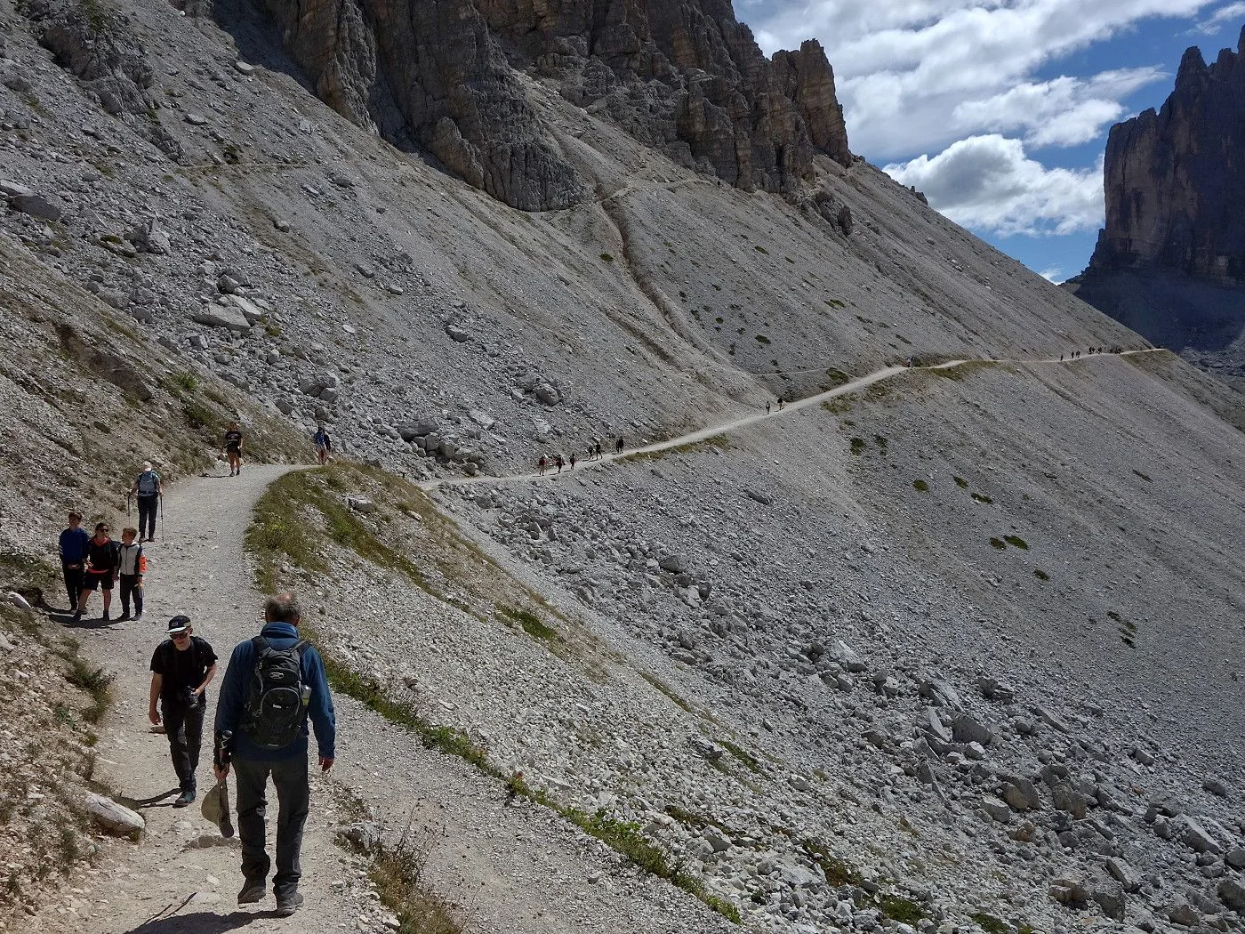 Die Drei Zinnen gelten als Wahrzeichen der Dolomiten. Insbesondere die Ansicht der steilen Nordwände gehört zu den bekanntesten Landschaftsbildern der Alpen und sind dementsprechend ein Anziehungspunkt nicht nur für Kletterer, sondern auch eine Attraktion für den Massentourismus. Dementsprechend tummeln sich an besonderes hoch frequentierten Tagen tausende Menschen um diesen Gebirgsstock herum und gleicht die Umrundung der Drei Zinnen oft einer Prozession. An solchen Tagen ist es ratsam die Umrundung der Drei Zinnen gegen den Uhrzeigersinn – also zunächst zur Lavaredohütte und über den Paternsattel - durchzuführen, auch wenn in diesem Tourenbericht diese im Uhrzeigersinn beschrieben wird. Die Umrundung ist auch für weniger geübte Wanderer aufgrund des geringen Höhenunterschiedes und der gut ausgebauten Wanderwege leicht machbar, wobei ein paar steilere und aufgrund des losen Untergrundes teilweise rutschige Stellen Vorsicht verlangen. Wanderstöcke sind hier sicherlich von Vorteil. Diese grandiose Wanderung ist jedenfalls ein Muss für jeden Wanderer und wird bestimmt jeder von diesem atemberaubenden und unvergesslichen Landschaftserlebnis begeistert sein.