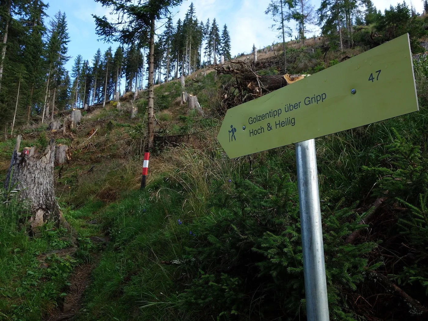 Die Tour beginnt auf einem Parkplatz (1450m) mitten in der Ortschaft Obertilliach. Dort geht es gleich sehr steil über die Asphaltstraße durch die Ortschaft nordwärts bis zu den letzten Häusern hoch, ehe dort die Straße in einen Schotterweg übergeht. Zwei Kurven weiter wählt man bei der Wegkreuzung den linken Weg und folgt dem Wegweiser „Golzentipp über Gripp – Nr 47“ (1540m). Dabei überquert man gleich den Rodarmbach und erreicht wenig später einen weiteren Wegweiser (1560m), der uns rechts in einen Steig leitet. Dieser bringt uns dann recht steil schnell höher, einmal die Schotterstraße querend, bis man auf Seehöhe 1695m diesem eine Kehre lang folgt. Bald leitet uns dann erneut ein Wegweiser links in den Steig (weiterhin Nr. 47) und erreicht man über diesen 3 Heuhütten (1790m) mitten im Wald. Nun wird es nochmal richtig steil und gewinnt man über den Steig nun sehr schnell an Höhe, bis man schlussendlich im Bereich des Gripp (1951m) die Waldgrenze erreicht. Nun sind die Schwierigkeiten überwunden und führt der Steig nun mit deutlich angenehmerer Steigung zunächst an einer weiteren Hütte (2000m) und dann über die sogenannte „Bukelin“ hoch in sanftere Almböden. Das Gipfelkreuz nun schon im Blickfeld erreicht man den Golzentipp (2317m) ostwärts über den breiten Bergrücken, die letzten Meter nochmals etwas steiler.