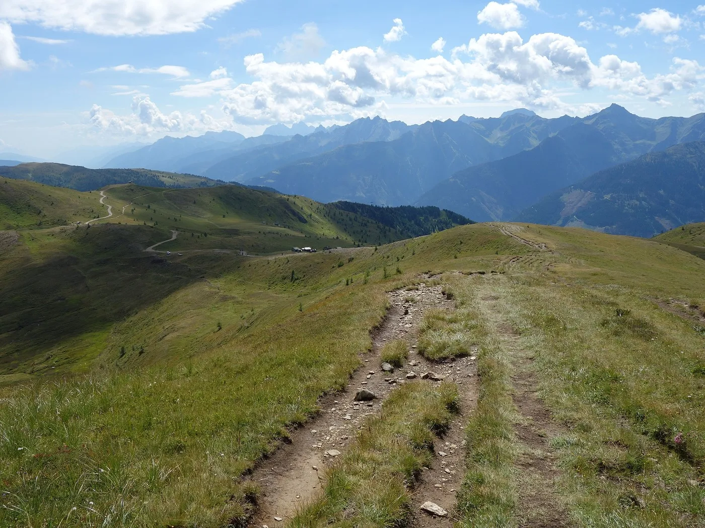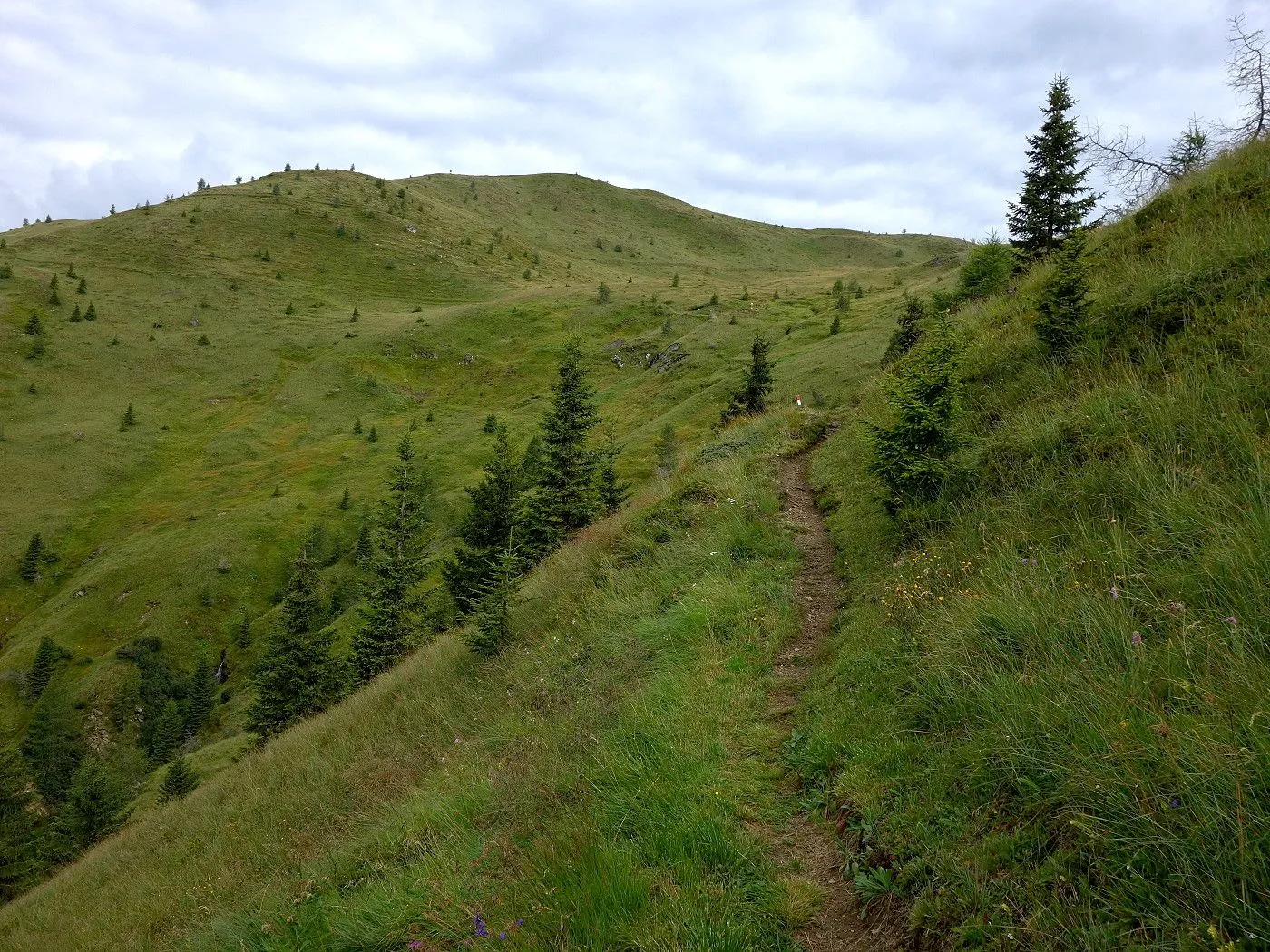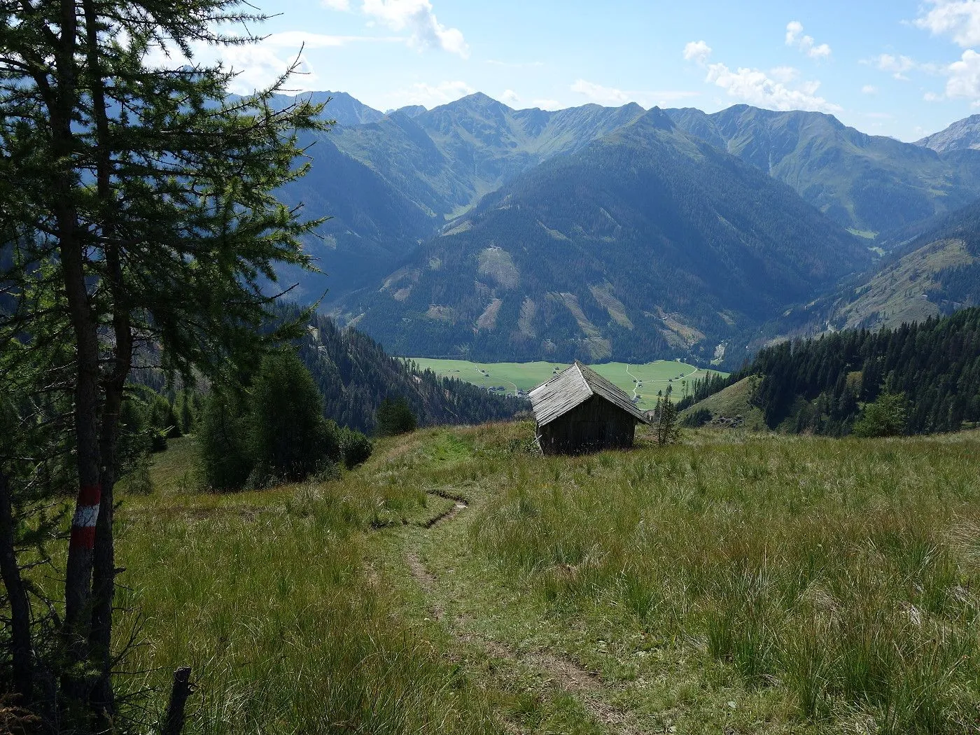 Der Abstieg erfolgt zunächst südostwärts direkt auf die weithin sichtbaren Kutteschupfen (2215m) zu. Dort leitet uns der Wegweiser „Obertilliach über Goste – Nr. 46“ in einen Steig, der uns sehr steil, später an einigen verfallenen Heuhütten vorbei, südwärts schnell talwärts bringt. Auf Seehöhe 1700m betritt man einen Schotterweg, dem man später an den Schneelanzen vorbei bis zur vom Aufstieg bekannten Wegkreuzung (1540m) folgt. Von dort über den Aufstiegsweg zurück zum Ausgangspunkt (1450m) dieser Tour.