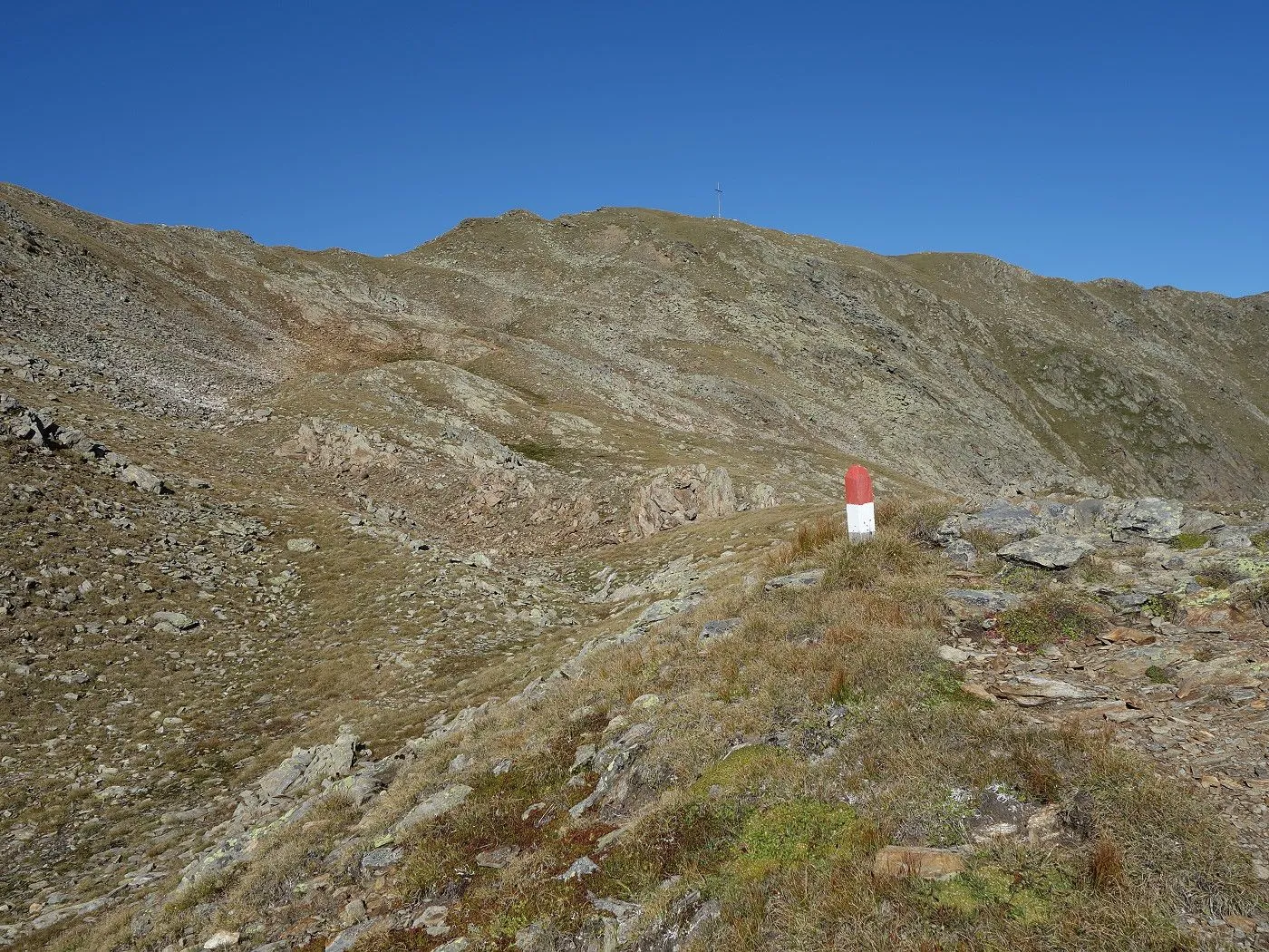 Die Wanderung auf die Hochkreuzspitze beginnt am Parkplatz in Maria-Hilf, Ortsteil Pötsch (1515m), wo es ausreichend Parkmöglichkeiten gibt. Zunächst folgen wir der Schotterstraße für ca. 250 Meter ostwärts und wählen dann rechts den Steig (Wegweiser "Alpe Stalle"), der uns hoch zur Vorderen Alpe Stalle (1714m) bringt. Wir folgen dem Fahrweg noch bis zum nächsten Wegweiser "Hinterstalle", der uns in einen weiteren Steig leitet. Dieser bringt uns höher, bis wir wieder auf den Fahrweg stoßen. Diesem folgen wir nun im leichten Auf und Ab taleinwärts, an der Abzweigung zur Jesachalm vorbei, bis zur Hinteren Stalle (2046m). Von hier führt uns nun ein rot-weiß markierter Steig zunächst in leichter Steigung weiter in Richtung Talschluss. Bald wird der Steig etwas steiler und leitet uns rechtshaltend in einigen Kehren auf eine Hochfläche. Beim Abzweig zum Pfoisattel wandern wir rechts weiter und erreichen so schließlich den Gipfel der Hochkreuzspitze (2739m) mit riesigem Gipfelkreuz.