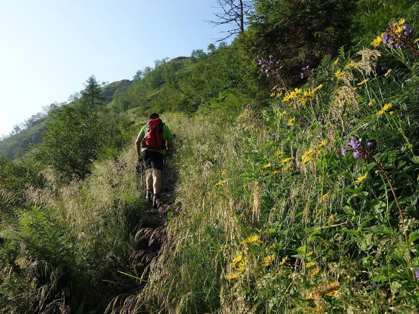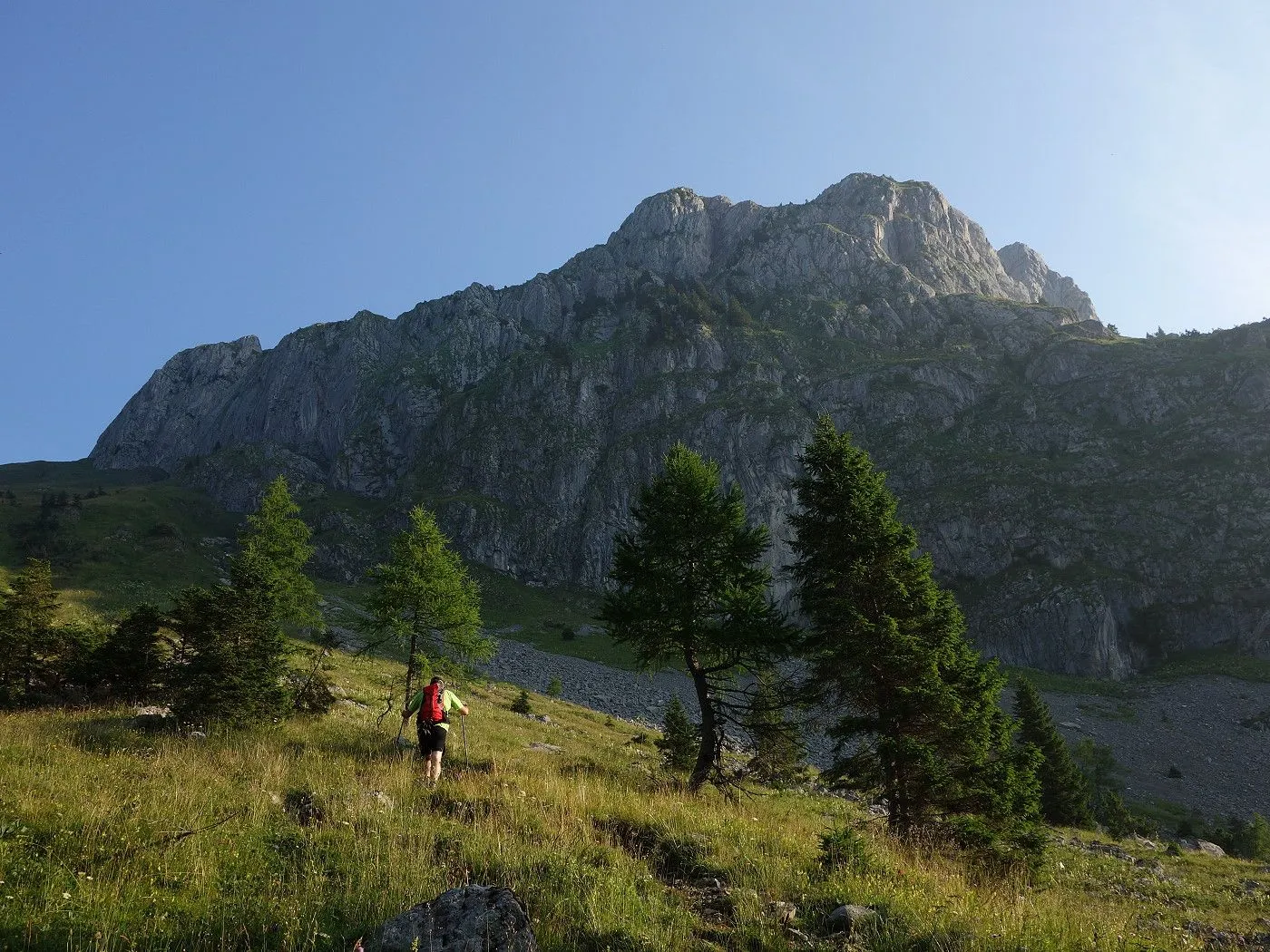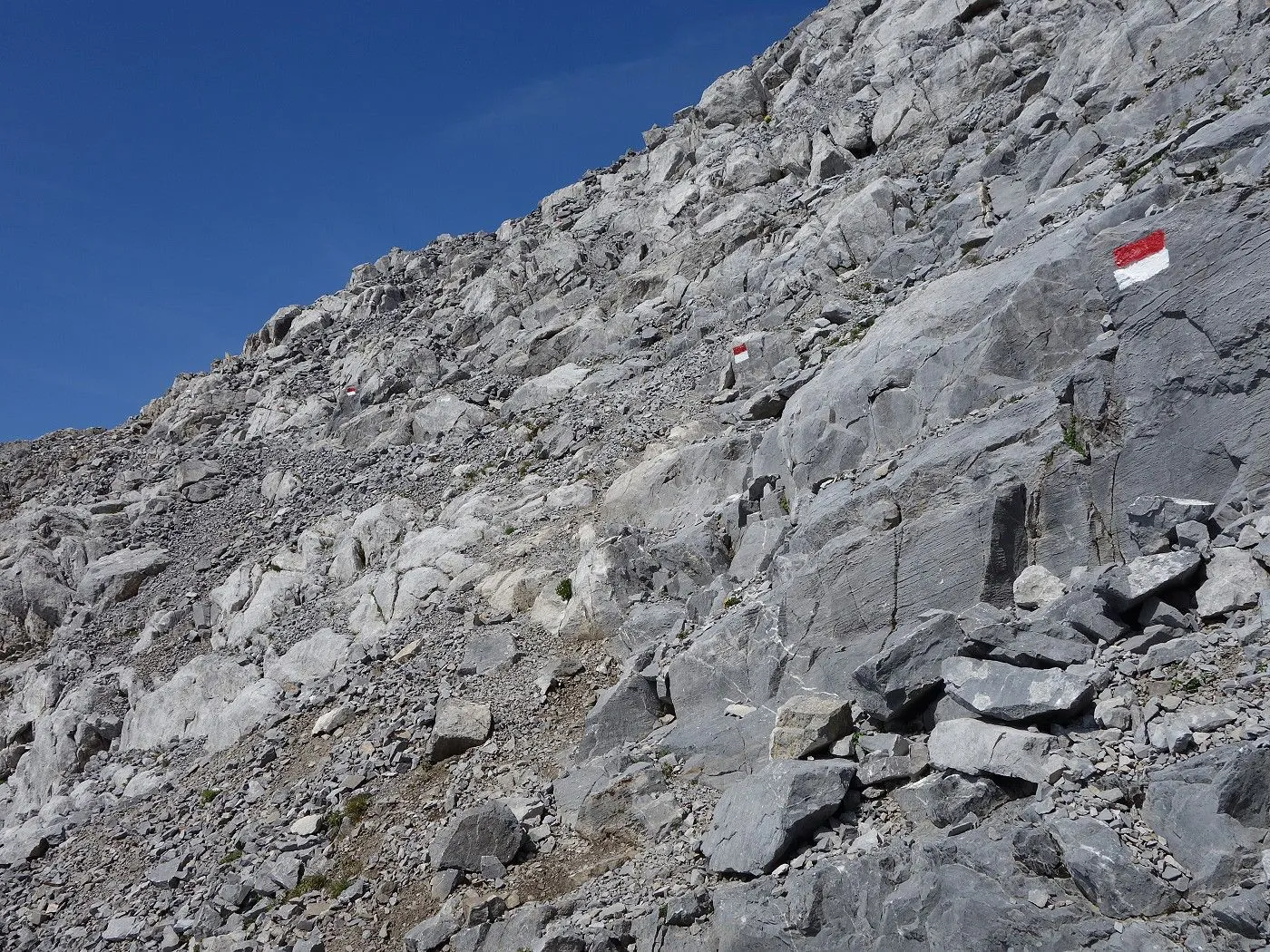 Früher Aufbruch empfohlen: Da der gesamte Aufstieg südseitig verläuft, ist man ständig der Sonne ausgesetzt. Ein früher Aufbruch hilft, der großen Hitze zu entkommen. |