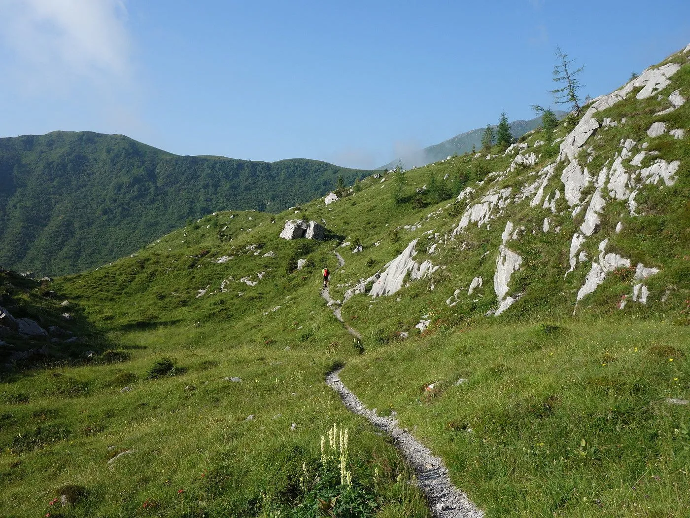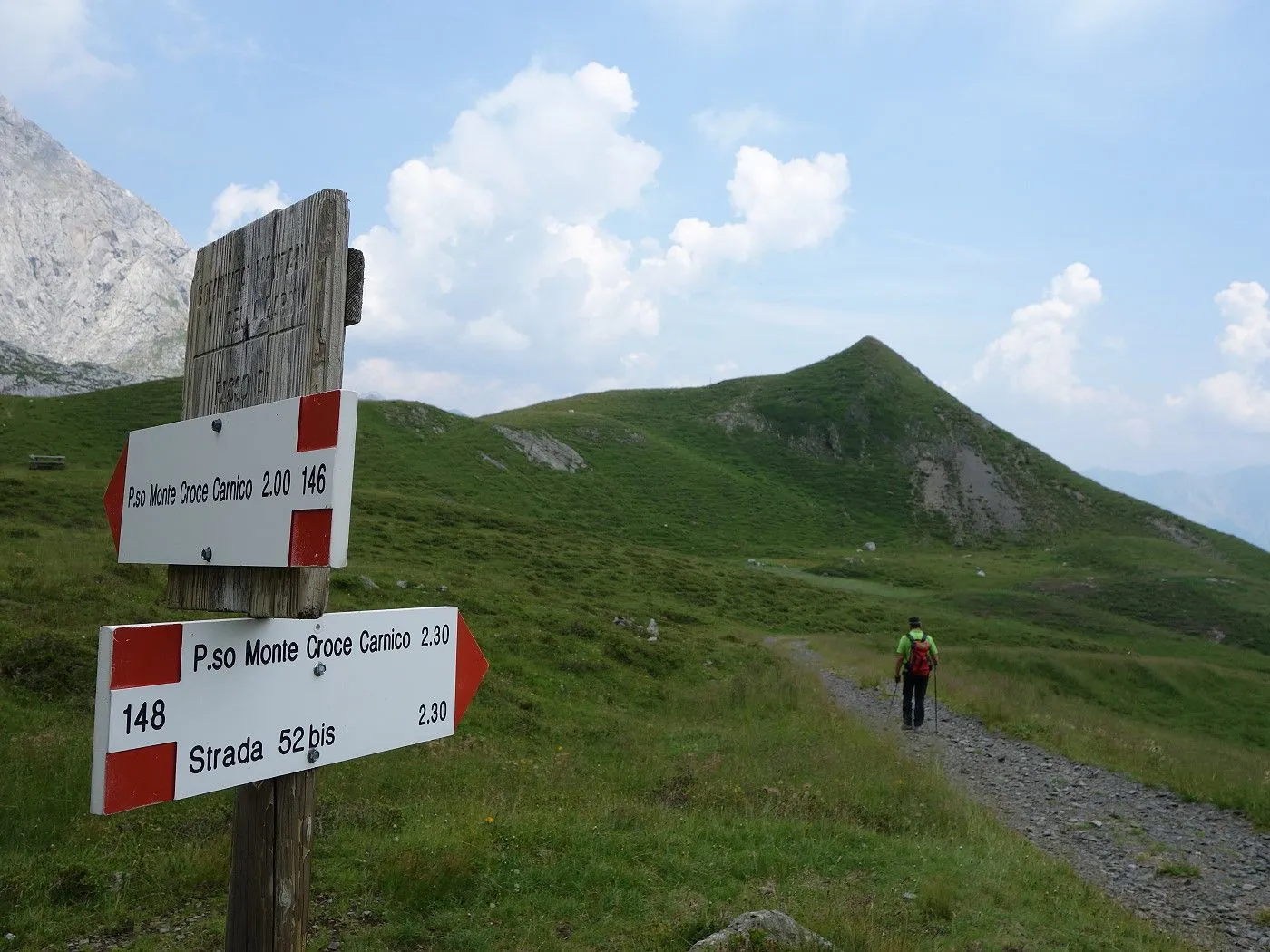 Vom Gipfel Hohe Warte (2780m) denselben Weg zurück bis zum Beginn des Geröllkars. Nun entweder über die Grasschneide zurück zum Pic Chiadin (2302m), oder direkt weiter hinunter in die Wiesenhänge absteigen. Dort stößt man auf den Steig Nr. 145, der uns in südöstlicher Richtung unterhalb des Pic Chiadin zurück zur Marinellihütte (2111m) führt. Von dort über den bekannten Weg zurück zum Cima Plotta. Hier folgen wir nun weiterhin dem geschotterten Fahrweg Nr. 148 abwärts ins Kerbtal des Rio di Collina, an der Casera Plotta und Casera Val di Collina vorbei. Der Fahrweg zieht danach mit einer weit nördlich ausholenden Kehre in bewaldetes Gebiet hinein, ehe man auf Höhe 1300m diesen in einer Kurve gerade aus verlässt (Wegtafel). Nun führt uns der Steig Nr. 148 zunächst einen steilen Waldhang nordostwärts hinein, später nordwärts recht steil entlang der Schrofenabbrüche wieder 100 Höhenmeter hoch bis zur Almhütte Casera Collinetta di sotto. Von hier flach über eine Lichtung zurück zum nahen Ausgangsort Plöckenpass (1357m).