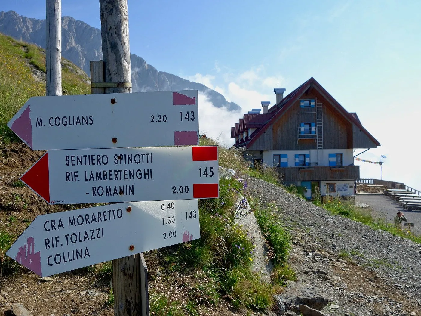 Die Bergtour startet direkt am Plöckenpass (1357m), wo es zahlreiche Parkmöglichkeiten gibt. Am südlichen Ende des Parkplatzes weist uns eine Wegweiser den Aufstieg Richtung "Rifugio Marinelli, dt. Marinellihütte" und man folgt zunächst einem schmalen Weg rechts der Talkerbe ins westwärts höher führende Tälchen. Bald in einen Steig übergehend, geht es durch Mischwald und später durch Strauchwerk hinauf in einen kleinen Wiesenboden, wo man den Abzweig Cellon passiert. Weiterhin den Markierungen Nr. 146 folgend, wendet sich der Steig links über das Bächlein und einem mit hüfthohen Gras bewachsenen Hang hoch zu einer Anhöhe hinauf. Nun recht flach, teilweise auch durch schrofigeres Gelände, am Abzweig Kollinkofel vorbei, bis zu den markanten Schrofenabbrüchen. Dort muss man durch ein mit Drahtseil und Steigbügeln gesichertes Felsenloch absteigen, ehe man am Fuße der hohen Felswände entlang und dann nochmals einige Höhenmeter bergab steigt (insgesamter Höhenverlust ca. 70 Meter). Nun entlang des Steiges wieder flach, dann angenehm ansteigend auf den Cima Plotta (2017m) zu, bis man kurz vor diesem, links haltend durch einen kleinen Sattel, den geschotterten Fahrweg Nr. 148 erreicht. Dieser führt uns zunächst angenehm ansteigend, am Schluss recht steil, hoch zur bereits weithin sichtbaren Rifugio Marinelli (2111m). Hinter der Hütte folgt man nun dem Steig Nr. 143, der sich zunächst über sanfte Graskuppen hoch zum Pic Chiadin (2302m) windet. Nun entlang einer markanten Grasschneide wieder leicht abwärts, später in leichter Kletterei Kalkrippen querend, bis man schließlich das Geröllkar am Fuße der Südflanke der Hohen Warte erreicht. Nun wird es nochmals richtig anstrengend! Denn nur sehr mühsam kommt man im losen Geröll höher, bis es über Felsbänke und -absätze links halten weiter geht. In einer günstigen Zickzack-Folge von ansteigenden Geröllbändern gelangt man in eine weitere Schuttrinne, die sich zwischen Hauptgipfel (links) und Mittelgipfel (rechts) herabzieht. Über diese weiterhin sehr anstrengend höher, bis man endlich die steil ansteigenden Felsstufen erreicht. Über sie links haltend, am Beginn in leichter Kletterei (I), in Kehren höher hoch zum obersten Westgrat. Unterhalb der Schneide nun rechts zum flachen Gipfelgrat, wo sich das Gipfelkreuz mit der obligatorischen Glocke befindet. Der allerhöchste Punkt (2780m) folgt wenig weiter östlich.