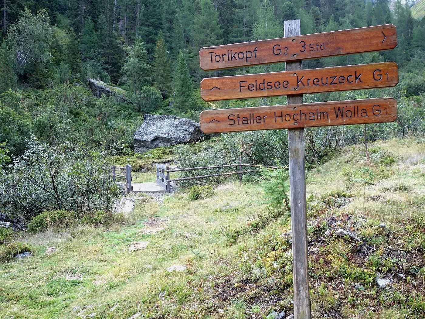 Die Bergtour beginnt auf einem Parkplatz (1500m) kurz vor dem Speicher Wölla (1530m), welchen man wenig später über den asphaltierten Weg erreicht. Dort folgt man dem Wegweiser "Feldsee/Kreuzeck" und gelangt über einen alten Almweg aufwärts zu den Oberen Gößnitzer Hütten (1684m). Nun etwas flacher und später wieder etwas steiler in Serpentinen über eine zweite Geländestufe hoch in einen weiten Kessel, wo sich die wunderschön gelegenen Almen der Staller Wölla (2033m) befinden. Auch das Tourenziel Kreuzeck hat man von dort das erste Mal im Blickfeld. Von der Staller Wölla marschiert man nun ostwärts, überquert einen kleinen Bach und folgt einem markierten Steig über sanft ansteigende Geländestufen hoch in einen Kessel mit unzähligen Bergseen, wobei der Feldsee (2273m) der größte von allen ist. Weiterhin den Wegmarkierungen folgend, steigt man am Schluss etwas steiler hoch zum Glenktörl (2457m), von wo man den Gipfelgrat zum Kreuzeck sehr gut einsehen kann. Über diesen zwar etwas steil, aber ohne schwierige Passagen, hoch zum Gipfel des Kreuzecks (2701m).