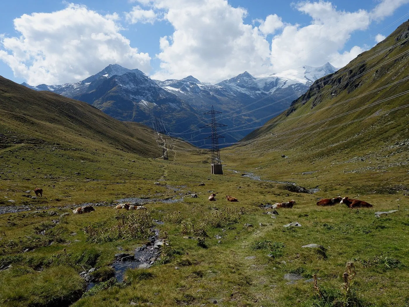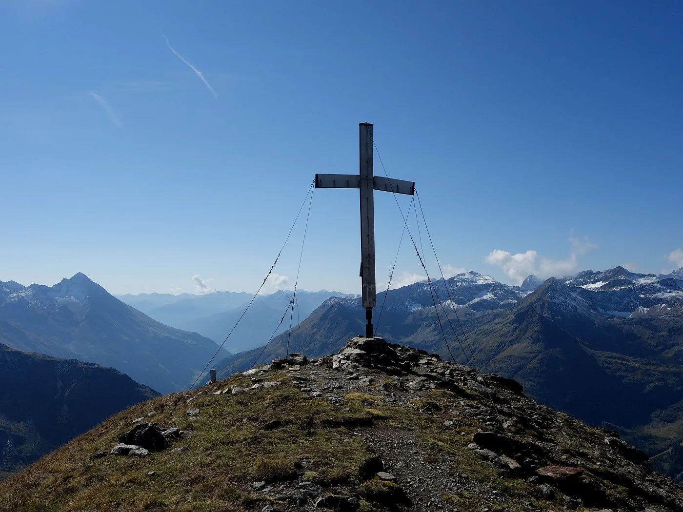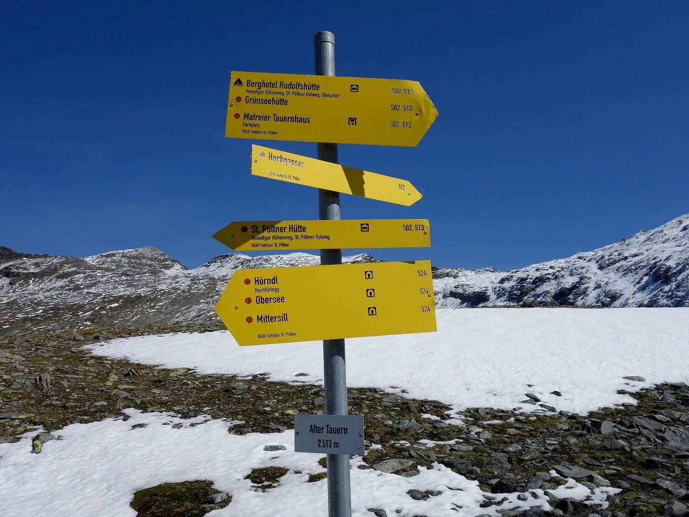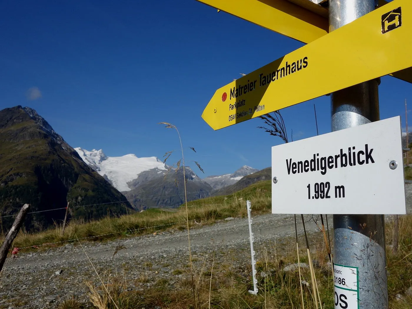 Variante 2: Zunächst denselben Weg zurück zur Messelingscharte (2560m). Hier folgt man nun dem St. Pöltner Ostweg und gelangt so in nordwestlicher Richtung zur Wegverzweigung "Alter Tauern" (2513m). Wenig später erreicht man den Grasbuckel des Weinbichl, wo man einen kurzen, zwar mit einem Stahlseil gesicherten, aber harmlosen Schrofenanstieg bewältigen muss. Von dort in wenigen Minuten zur bewirtschafteten St. Pöltner Hütte (2481m), die man nach einem kurzen Abstieg erreicht. Von der Hütte folgt man nun den Markierungen südwärts durch das Hochtal, im Wesentlichen entlang der Strommasten, bis zum Wegweiser "Matreier Tauernhaus/Außergschlöss". Hier könnte man nun auch links über den Weg Nr. 512A zum "Venedigerblick" zurückkehren. Wir halten uns aber gerade aus in südwestlicher Richtung und erreichen so eine weitere Wegverzweigung mit einer Brücke, die rechts über den Tauernbach führt. Die Brücke ignorieren wir und marschieren geradeaus weiter abwärts bis zum Aussichtsplatz "Zirmkreuz". Von dort schlängelt sich ein schmales und ziemlich zugewachsenes Weglein links des Tauernbaches hinunter, bis man auf Höhe der Wohlgemuthalm die Talstraße erreicht. Dieser folgen wir talauswärts bis zum Ausgangsort am Matreier Tauernhaus.