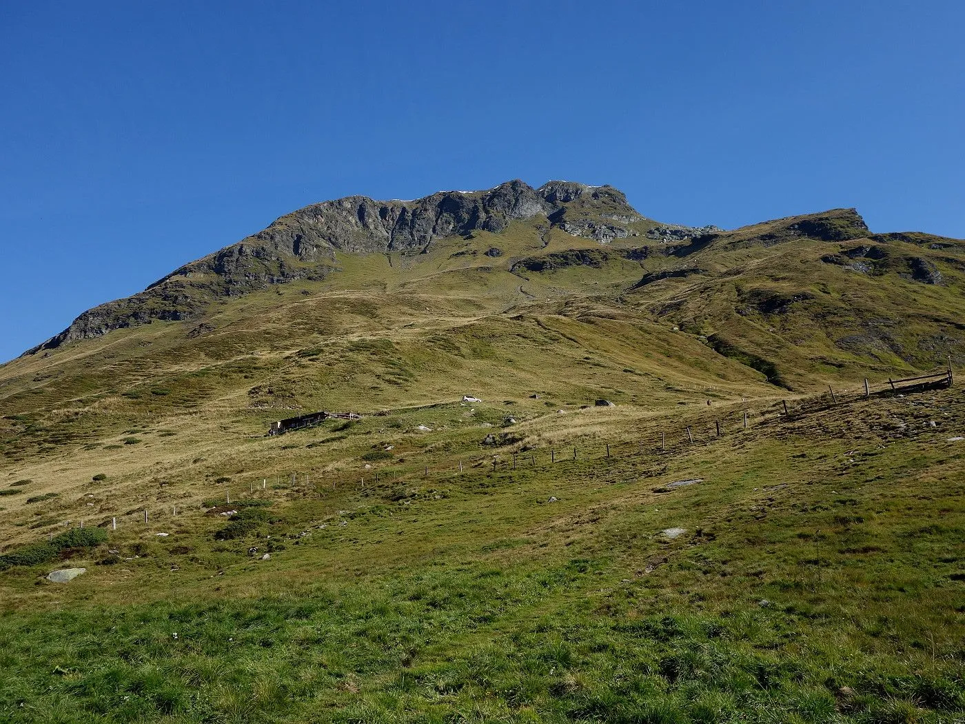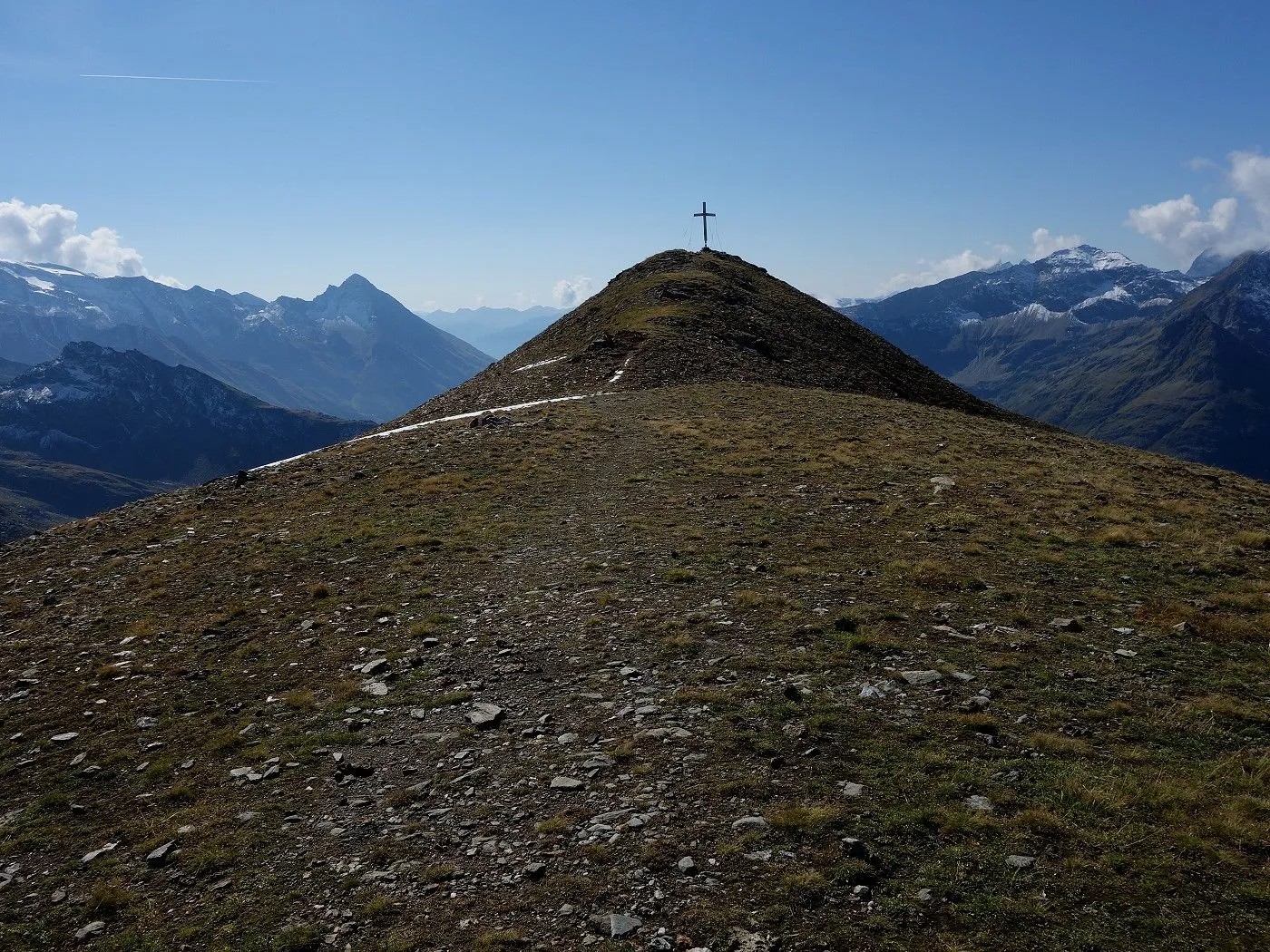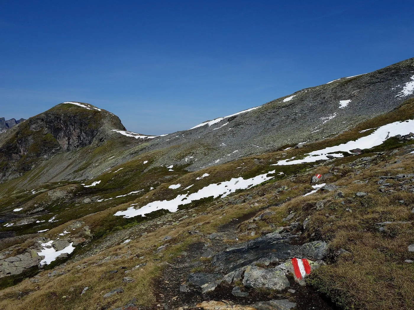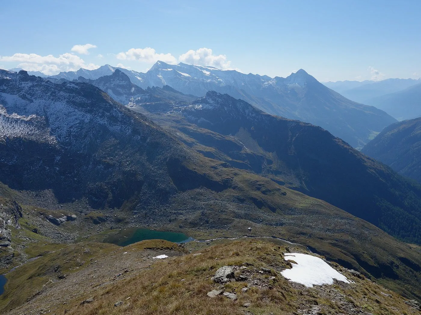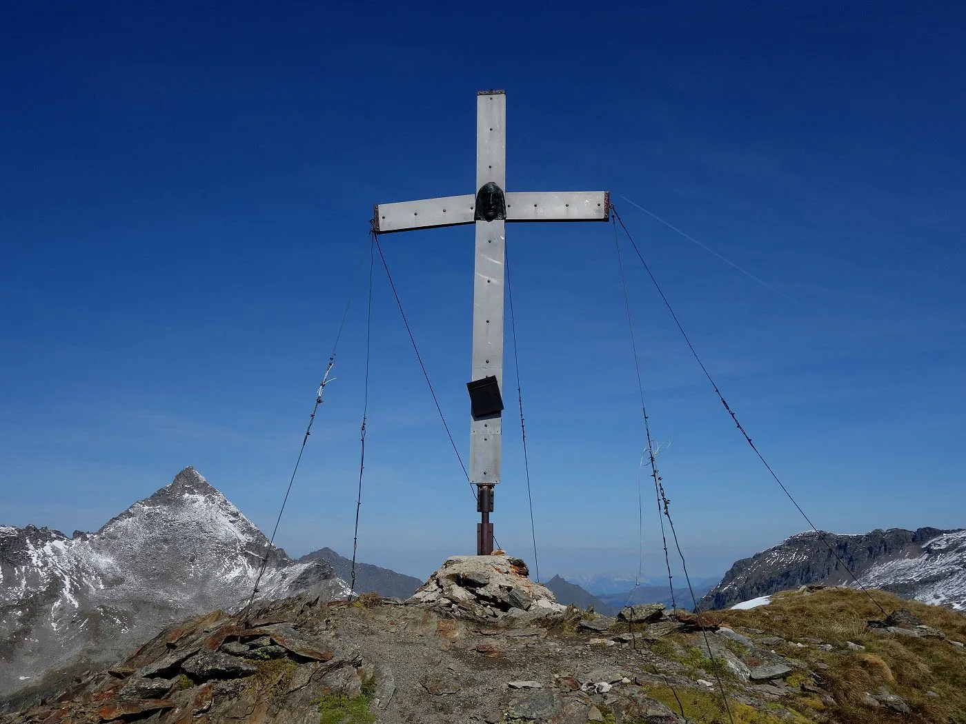 Variante 2: Zunächst denselben Weg zurück zur Messelingscharte (2560m). Hier folgt man nun dem St. Pöltner Ostweg und gelangt so in nordwestlicher Richtung zur Wegverzweigung "Alter Tauern" (2513m). Wenig später erreicht man den Grasbuckel des Weinbichl, wo man einen kurzen, zwar mit einem Stahlseil gesicherten, aber harmlosen Schrofenanstieg bewältigen muss. Von dort in wenigen Minuten zur bewirtschafteten St. Pöltner Hütte (2481m), die man nach einem kurzen Abstieg erreicht. Von der Hütte folgt man nun den Markierungen südwärts durch das Hochtal, im Wesentlichen entlang der Strommasten, bis zum Wegweiser "Matreier Tauernhaus/Außergschlöss". Hier könnte man nun auch links über den Weg Nr. 512A zum "Venedigerblick" zurückkehren. Wir halten uns aber gerade aus in südwestlicher Richtung und erreichen so eine weitere Wegverzweigung mit einer Brücke, die rechts über den Tauernbach führt. Die Brücke ignorieren wir und marschieren geradeaus weiter abwärts bis zum Aussichtsplatz "Zirmkreuz". Von dort schlängelt sich ein schmales und ziemlich zugewachsenes Weglein links des Tauernbaches hinunter, bis man auf Höhe der Wohlgemuthalm die Talstraße erreicht. Dieser folgen wir talauswärts bis zum Ausgangsort am Matreier Tauernhaus.