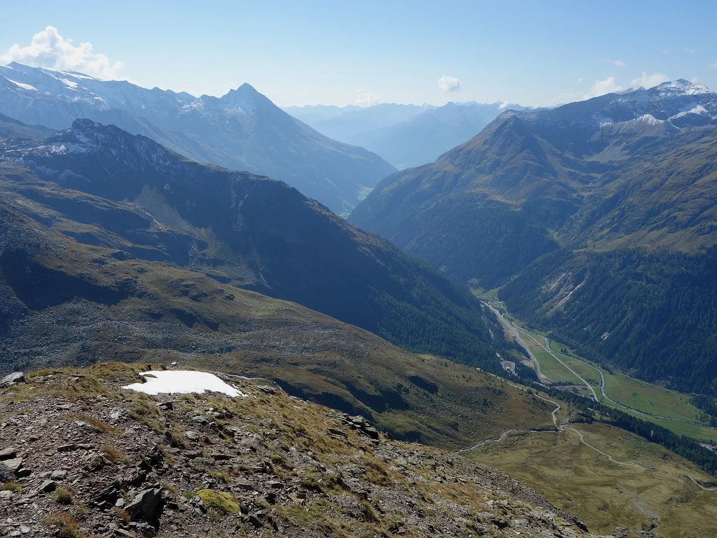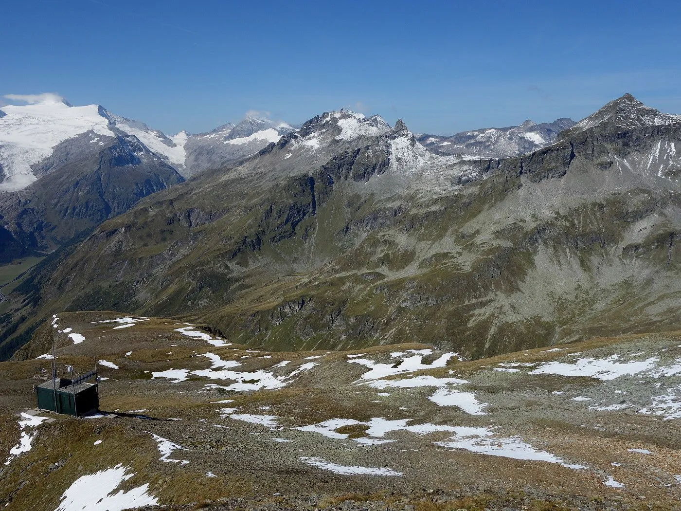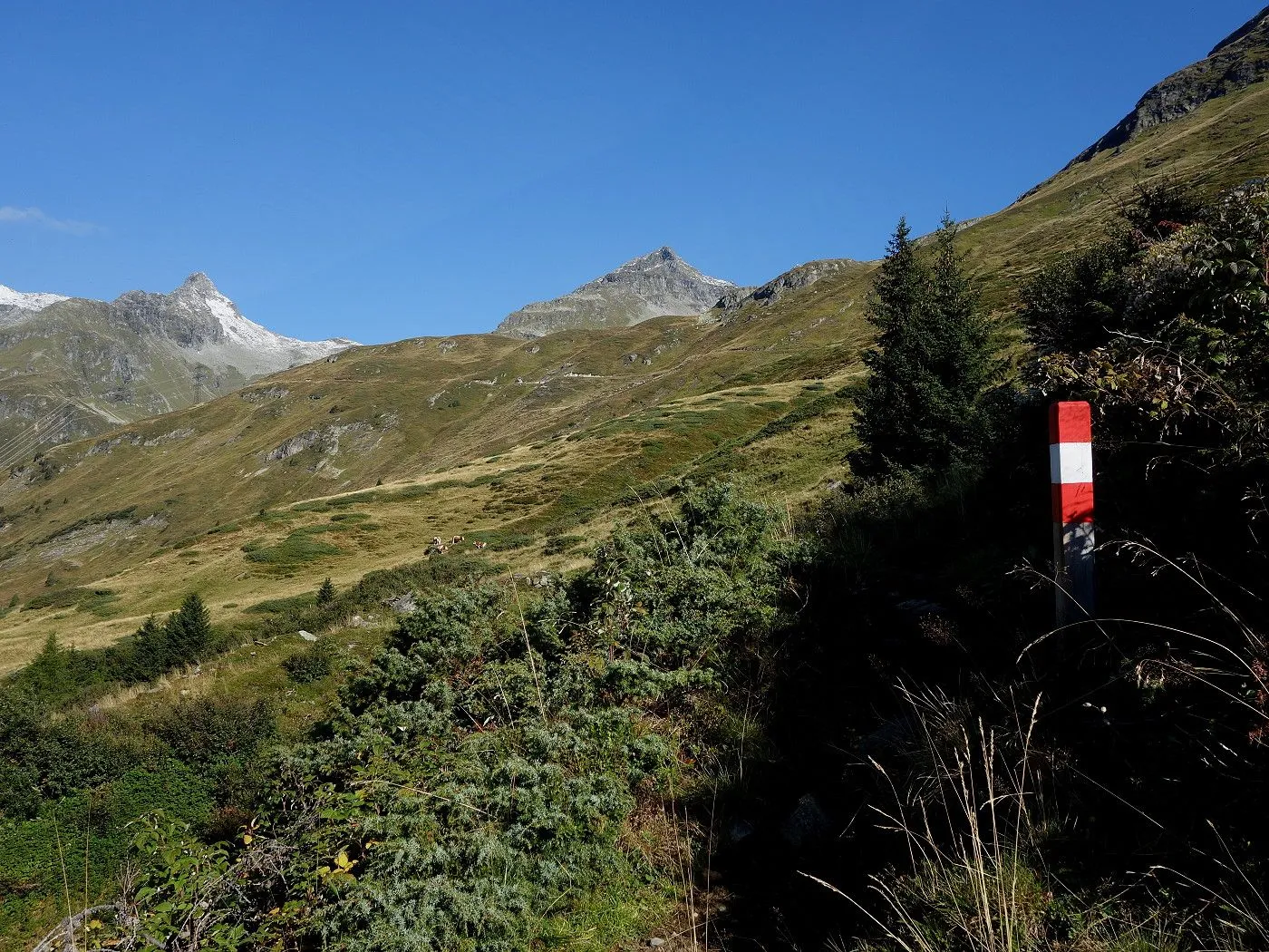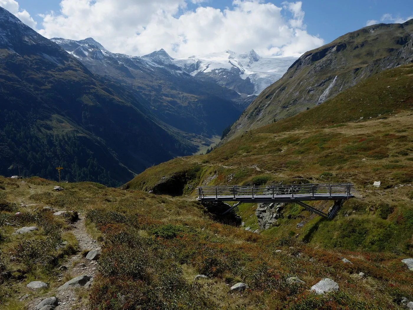Variante 2: Zunächst denselben Weg zurück zur Messelingscharte (2560m). Hier folgt man nun dem St. Pöltner Ostweg und gelangt so in nordwestlicher Richtung zur Wegverzweigung "Alter Tauern" (2513m). Wenig später erreicht man den Grasbuckel des Weinbichl, wo man einen kurzen, zwar mit einem Stahlseil gesicherten, aber harmlosen Schrofenanstieg bewältigen muss. Von dort in wenigen Minuten zur bewirtschafteten St. Pöltner Hütte (2481m), die man nach einem kurzen Abstieg erreicht. Von der Hütte folgt man nun den Markierungen südwärts durch das Hochtal, im Wesentlichen entlang der Strommasten, bis zum Wegweiser "Matreier Tauernhaus/Außergschlöss". Hier könnte man nun auch links über den Weg Nr. 512A zum "Venedigerblick" zurückkehren. Wir halten uns aber gerade aus in südwestlicher Richtung und erreichen so eine weitere Wegverzweigung mit einer Brücke, die rechts über den Tauernbach führt. Die Brücke ignorieren wir und marschieren geradeaus weiter abwärts bis zum Aussichtsplatz "Zirmkreuz". Von dort schlängelt sich ein schmales und ziemlich zugewachsenes Weglein links des Tauernbaches hinunter, bis man auf Höhe der Wohlgemuthalm die Talstraße erreicht. Dieser folgen wir talauswärts bis zum Ausgangsort am Matreier Tauernhaus.