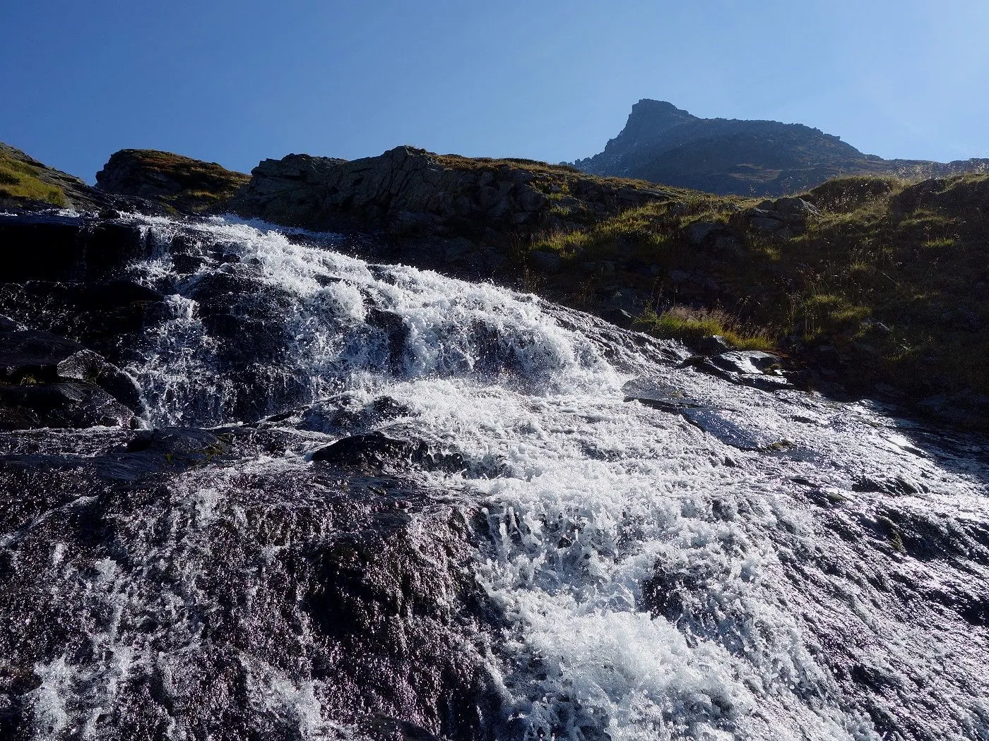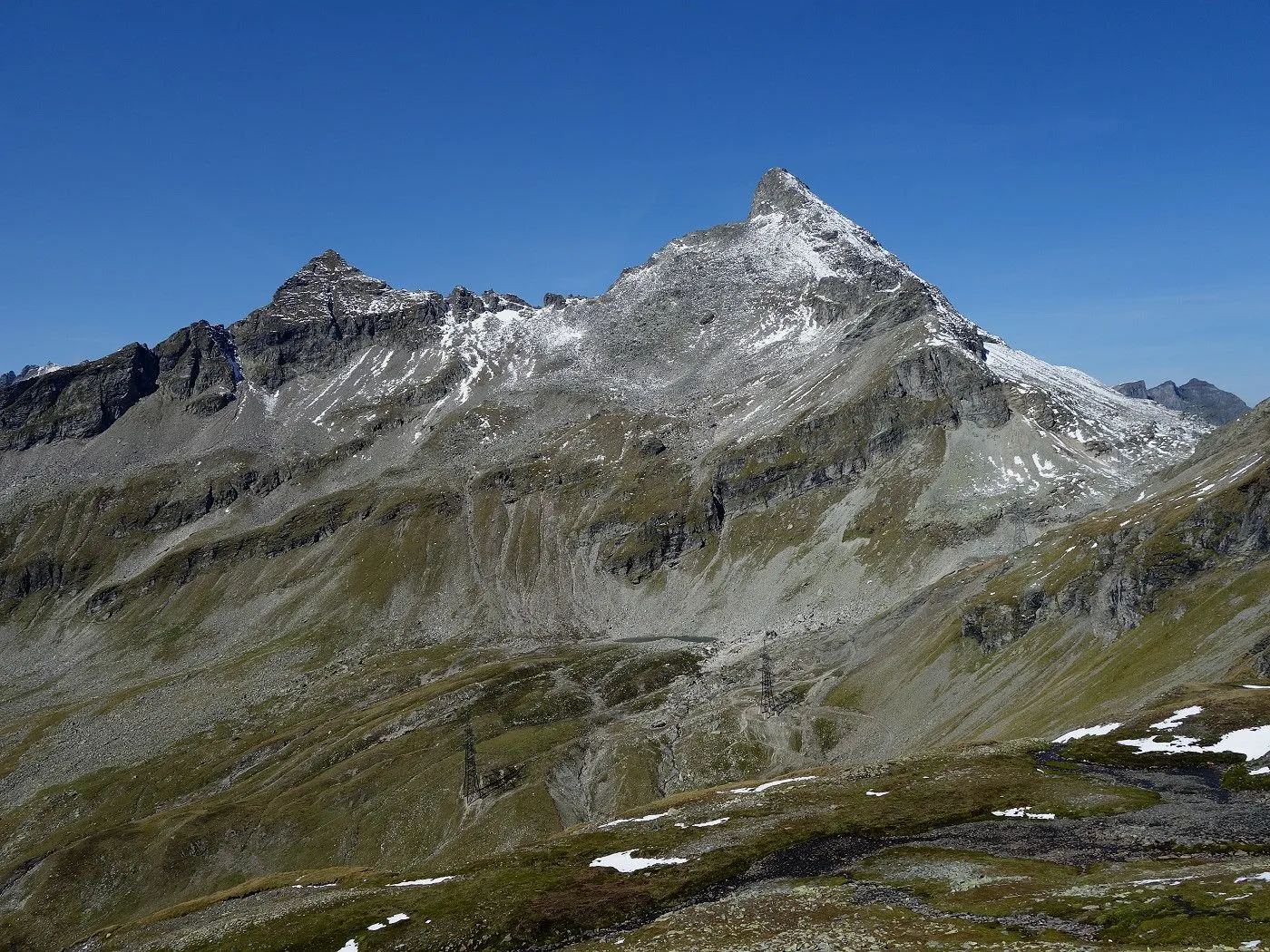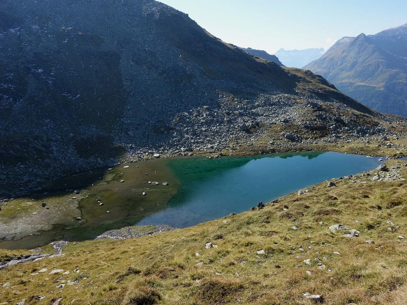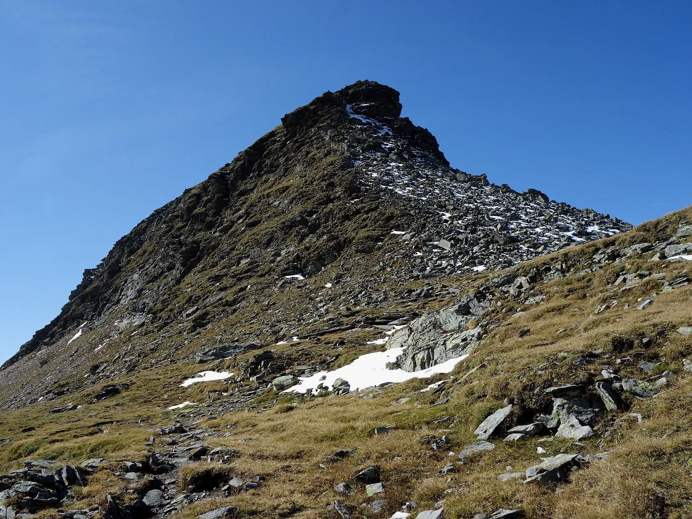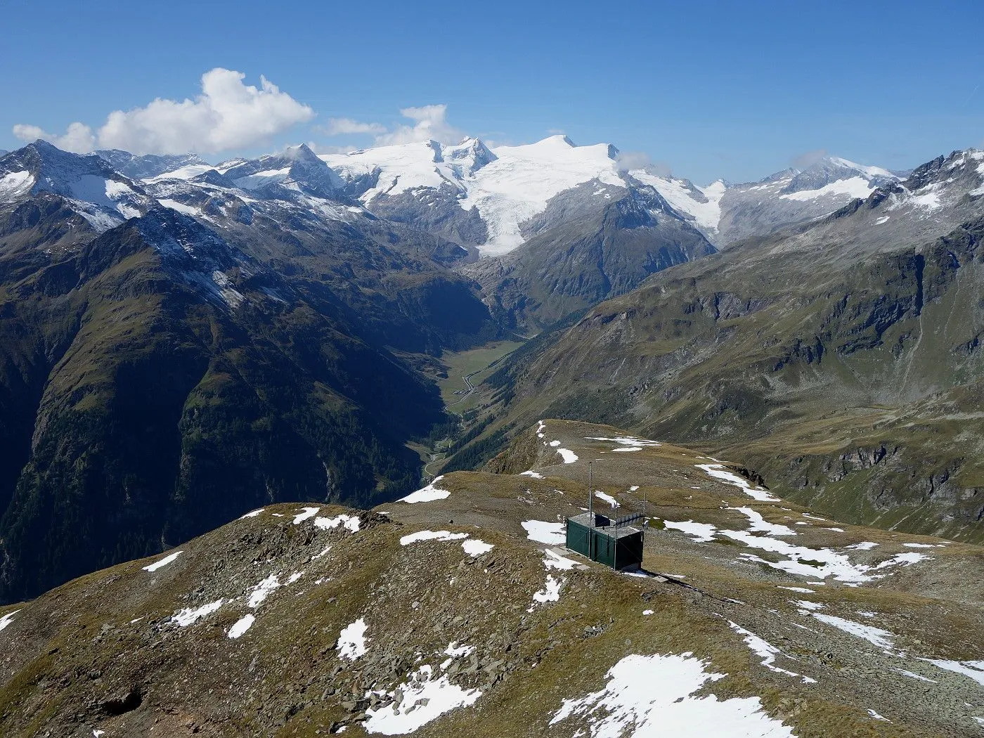 Variante 2: Zunächst denselben Weg zurück zur Messelingscharte (2560m). Hier folgt man nun dem St. Pöltner Ostweg und gelangt so in nordwestlicher Richtung zur Wegverzweigung "Alter Tauern" (2513m). Wenig später erreicht man den Grasbuckel des Weinbichl, wo man einen kurzen, zwar mit einem Stahlseil gesicherten, aber harmlosen Schrofenanstieg bewältigen muss. Von dort in wenigen Minuten zur bewirtschafteten St. Pöltner Hütte (2481m), die man nach einem kurzen Abstieg erreicht. Von der Hütte folgt man nun den Markierungen südwärts durch das Hochtal, im Wesentlichen entlang der Strommasten, bis zum Wegweiser "Matreier Tauernhaus/Außergschlöss". Hier könnte man nun auch links über den Weg Nr. 512A zum "Venedigerblick" zurückkehren. Wir halten uns aber gerade aus in südwestlicher Richtung und erreichen so eine weitere Wegverzweigung mit einer Brücke, die rechts über den Tauernbach führt. Die Brücke ignorieren wir und marschieren geradeaus weiter abwärts bis zum Aussichtsplatz "Zirmkreuz". Von dort schlängelt sich ein schmales und ziemlich zugewachsenes Weglein links des Tauernbaches hinunter, bis man auf Höhe der Wohlgemuthalm die Talstraße erreicht. Dieser folgen wir talauswärts bis zum Ausgangsort am Matreier Tauernhaus.