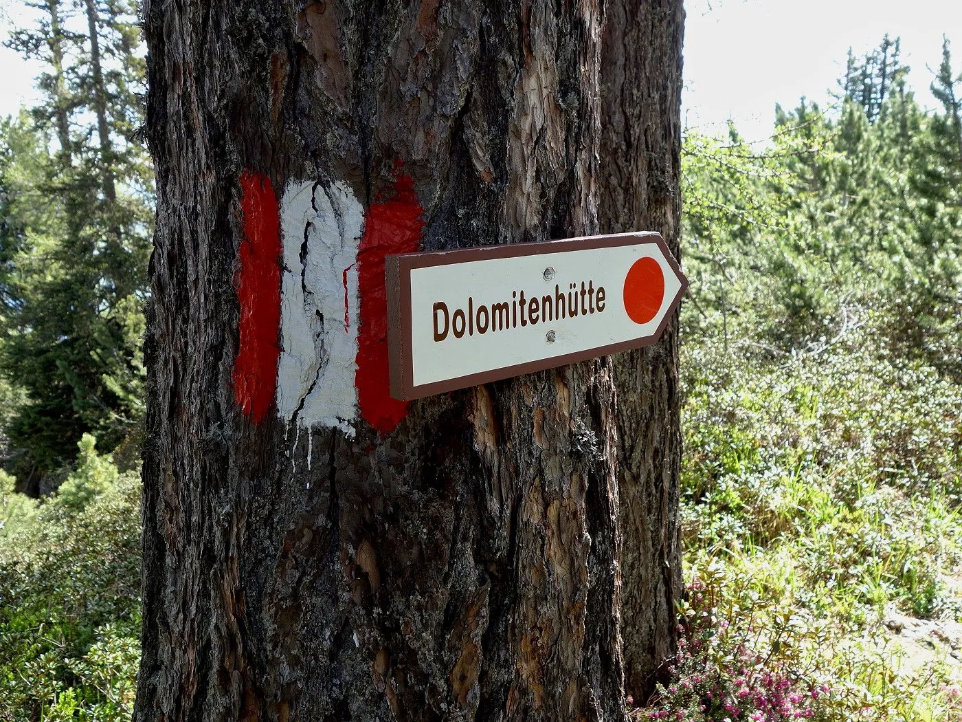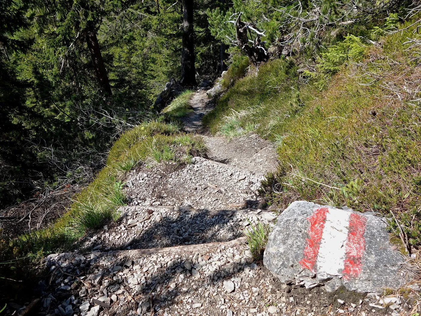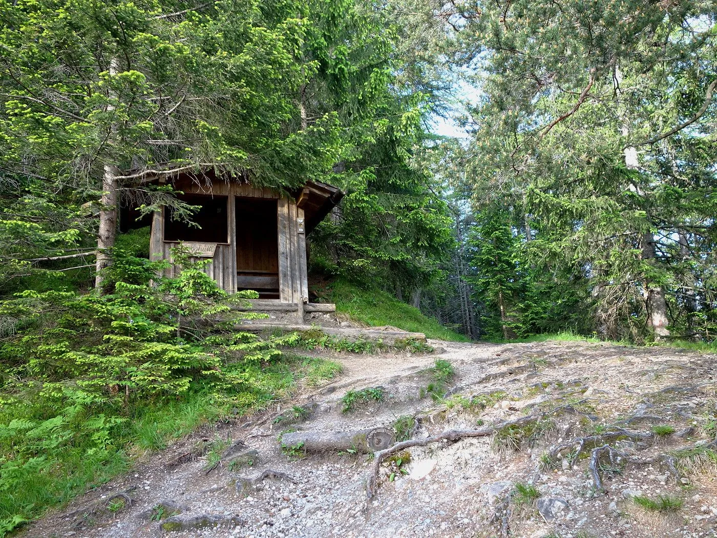 Zuerst ein kurzes Stück Richtung Osten, am Sendemasten vorbei, bis uns ein Hinweisschild den Abstieg Richtung Dolomitenhütte weist. Recht schnell an Höhe verlierend, erreicht man bald schön gelegene Almböden, wo sich auch die Talstation der Materialseilbahn (1580m) befindet. An dieser vorbei entlang eines Schotterweges bis zur Wiesenhütte (1560m). Dort weist uns erneut ein Wegweiser den weiteren Abstieg über einen Steig durch bewaldetes Gebiet. Auf Höhe 1120m stößt man auf einen schmalen Weg, dem man rechts, am Blasbründl vorbei, bis zum Gogghüttl (1060m) folgt. Von dort wie beim Aufstieg über den Goggsteig abwärts bis zum Ausgangspunkt (700m).