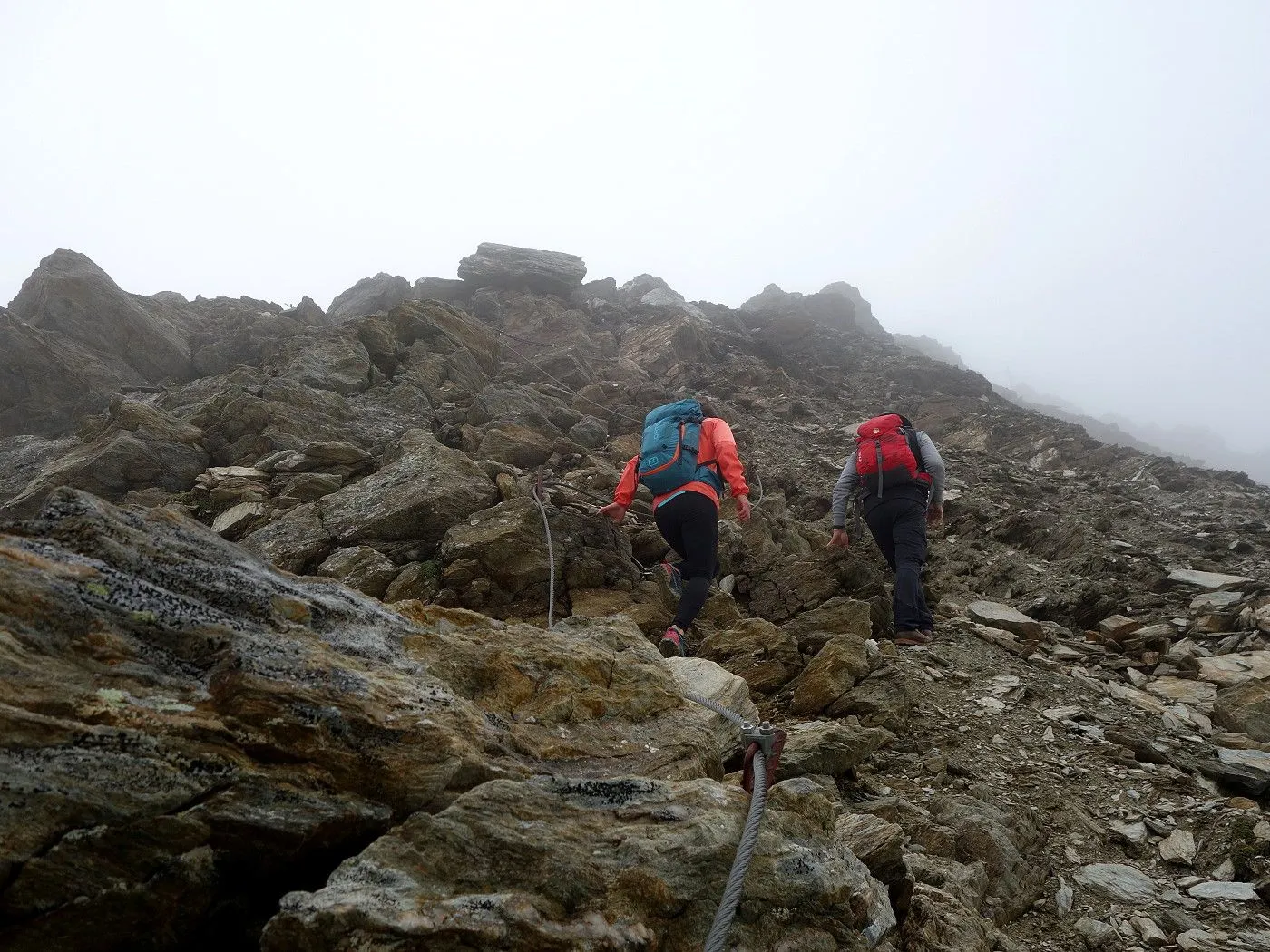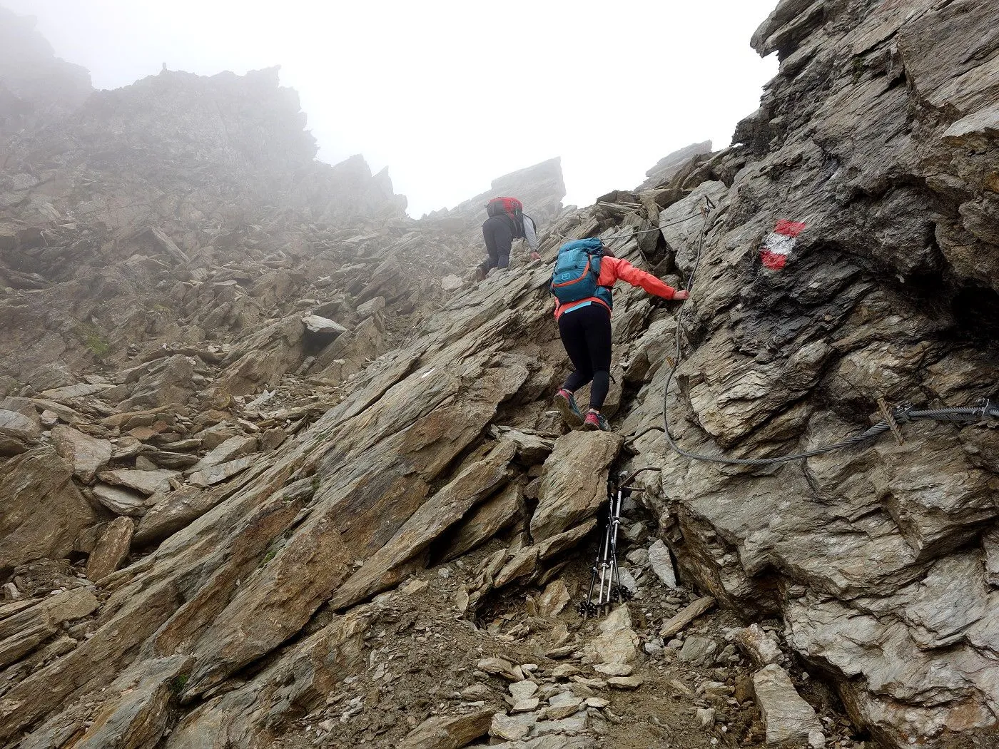 Schlüsselstelle: Der Grat ist mit Stahlseilen versichert, dennoch erfordert der Abschnitt am Schuttkar und Grat besondere Vorsicht. Bei Nässe und Schnee wird der Anstieg deutlich anspruchsvoller. |