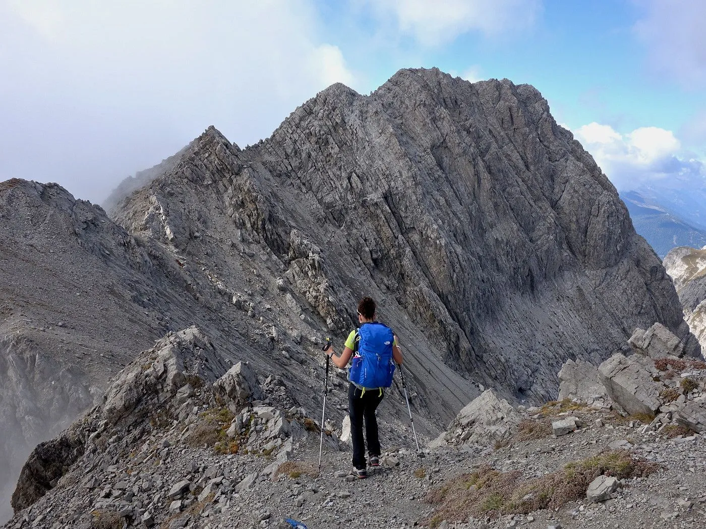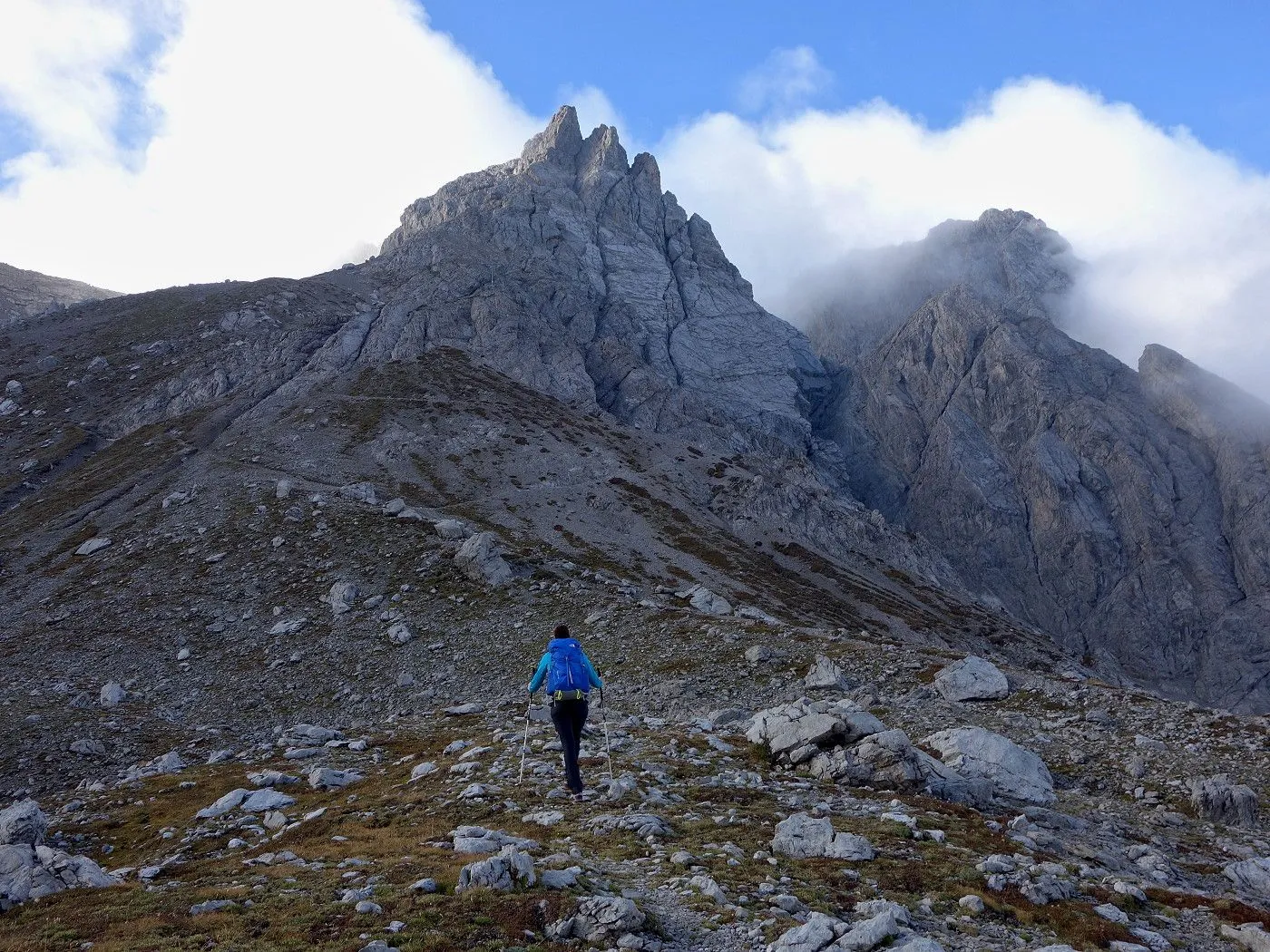 Bergwanderausrüstung mit Klettersteigausrüstung, festes Schuhwerk, Teleskop-/Wanderstöcke