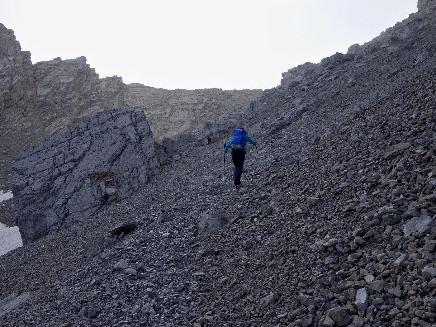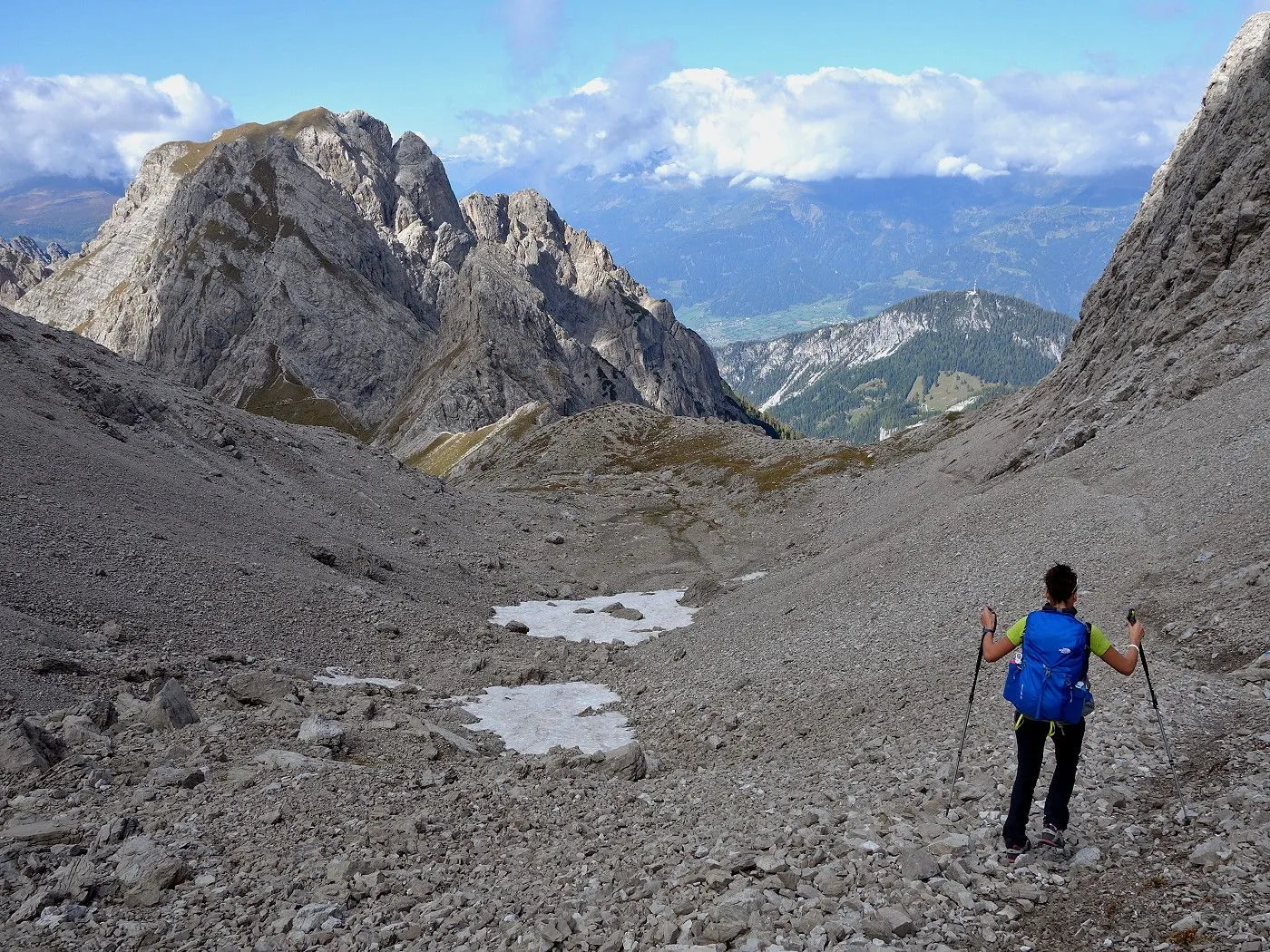 Vom Gipfel Seekofel (2738m) wieder über den Klettersteig zurück zur Ödkarscharte (2596m). Von dort wenige Meter hoch und im Anschluss Abstieg über einen schottrigen Steig hinab in das sogenannte Mohamedanerkar. Weiter dem Steig folgend bis zum Kerschbaumertörl (2285m) und hier sehr steil abwärts bis zum Marcherstein (2074m). Nun über den bekannten Steig und später Schotterweg zurück zum Ausgangsort.