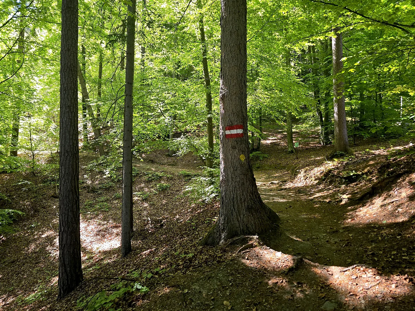 Wegbeschaffenheit: Wechsel zwischen breiten Wanderwegen, Lehrpfad-Stationen und wurzeligen Waldsteigen im Abstieg. |