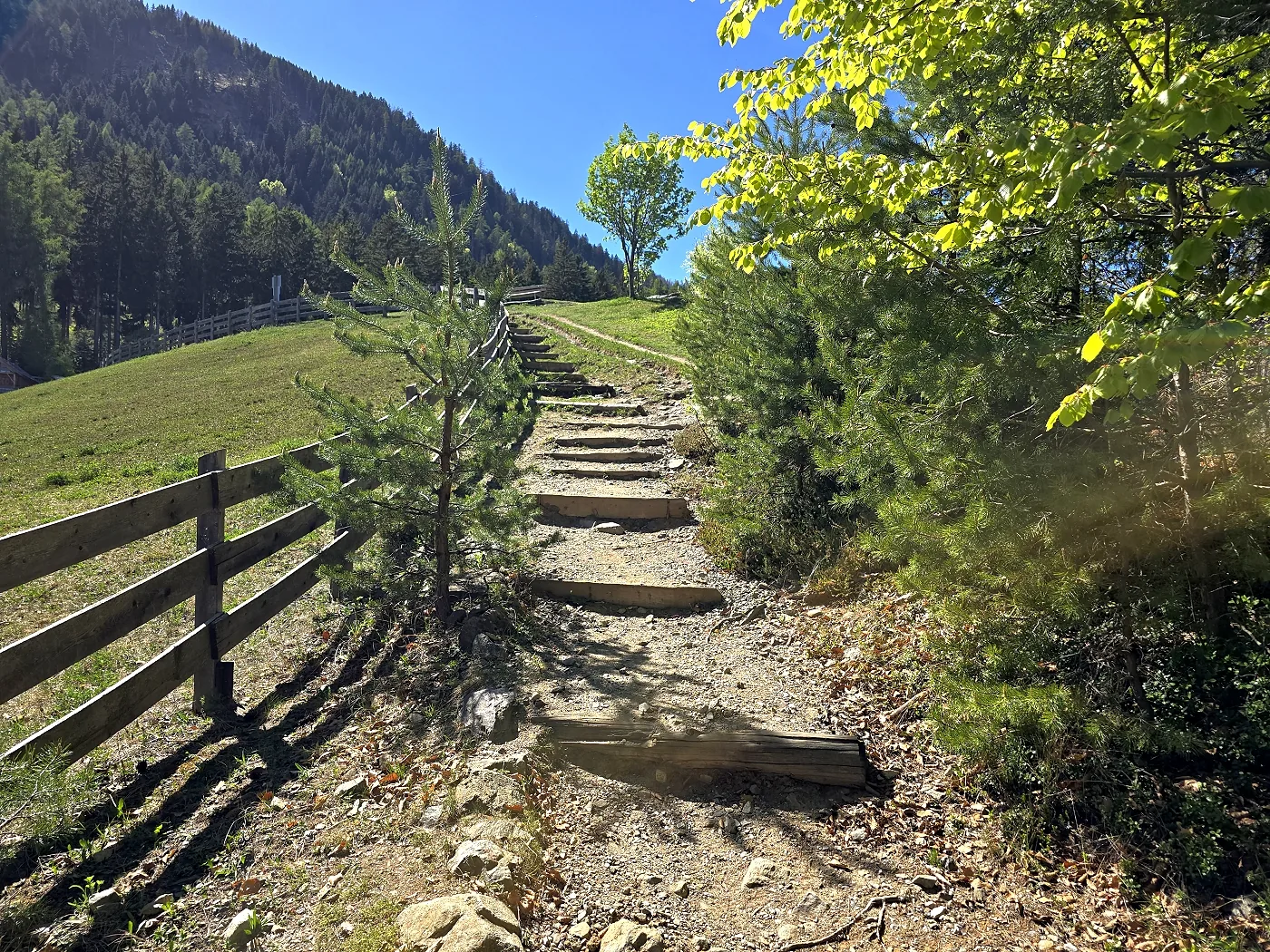 Wir folgen dem rot-weiß-rot markierten Naturlehrpfad vorbei an diversen Schautafeln bis zu einer weiteren Weggabelung (770m) direkt oberhalb des Sonnenhofs. Achtung: An dieser Stelle befindet sich kein Wegweiser! Wir verlassen hier den Lehrpfad und folgen einem schmalen Steig (Markierung beachten), der uns steiler bergauf bis zu einer Asphaltstraße leitet. Dieser folgen wir weiter bergan zu den schön gelegenen Taxerhöfen (895m), von wo aus sich ein herrlicher Ausblick auf Lienz und die Schleinitz bietet.
