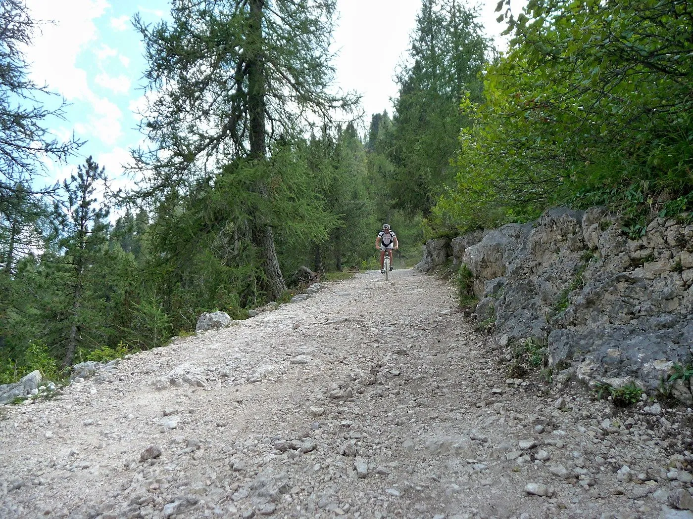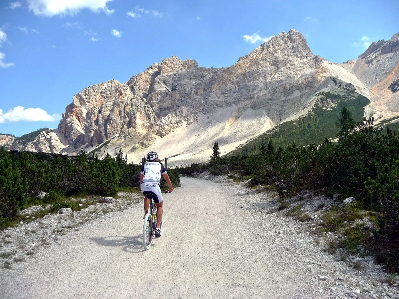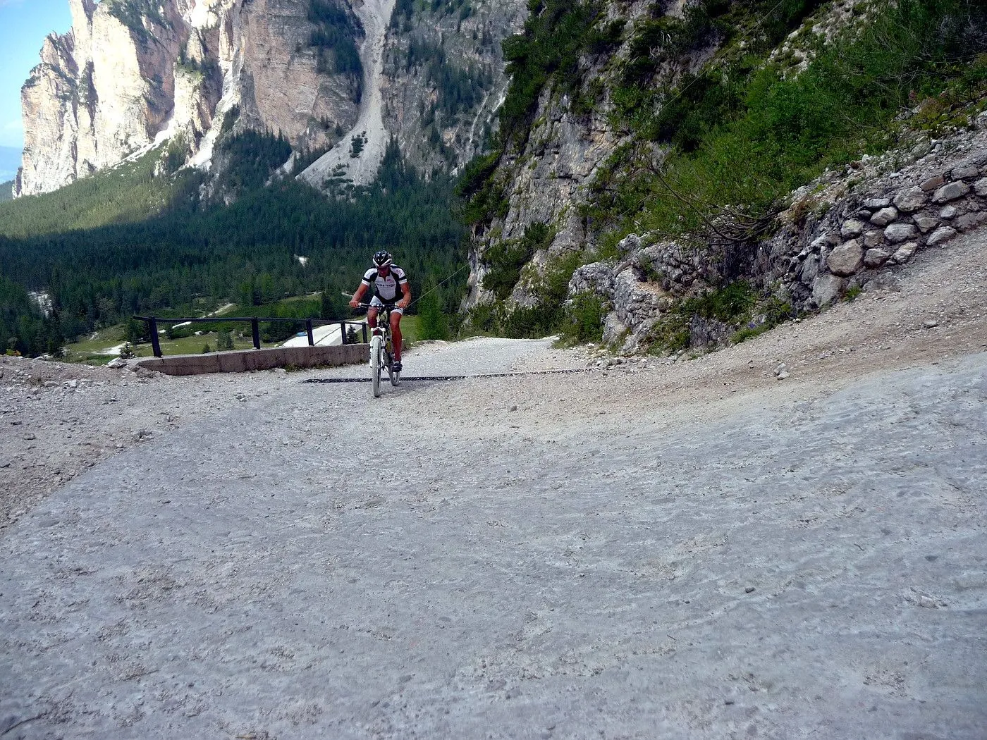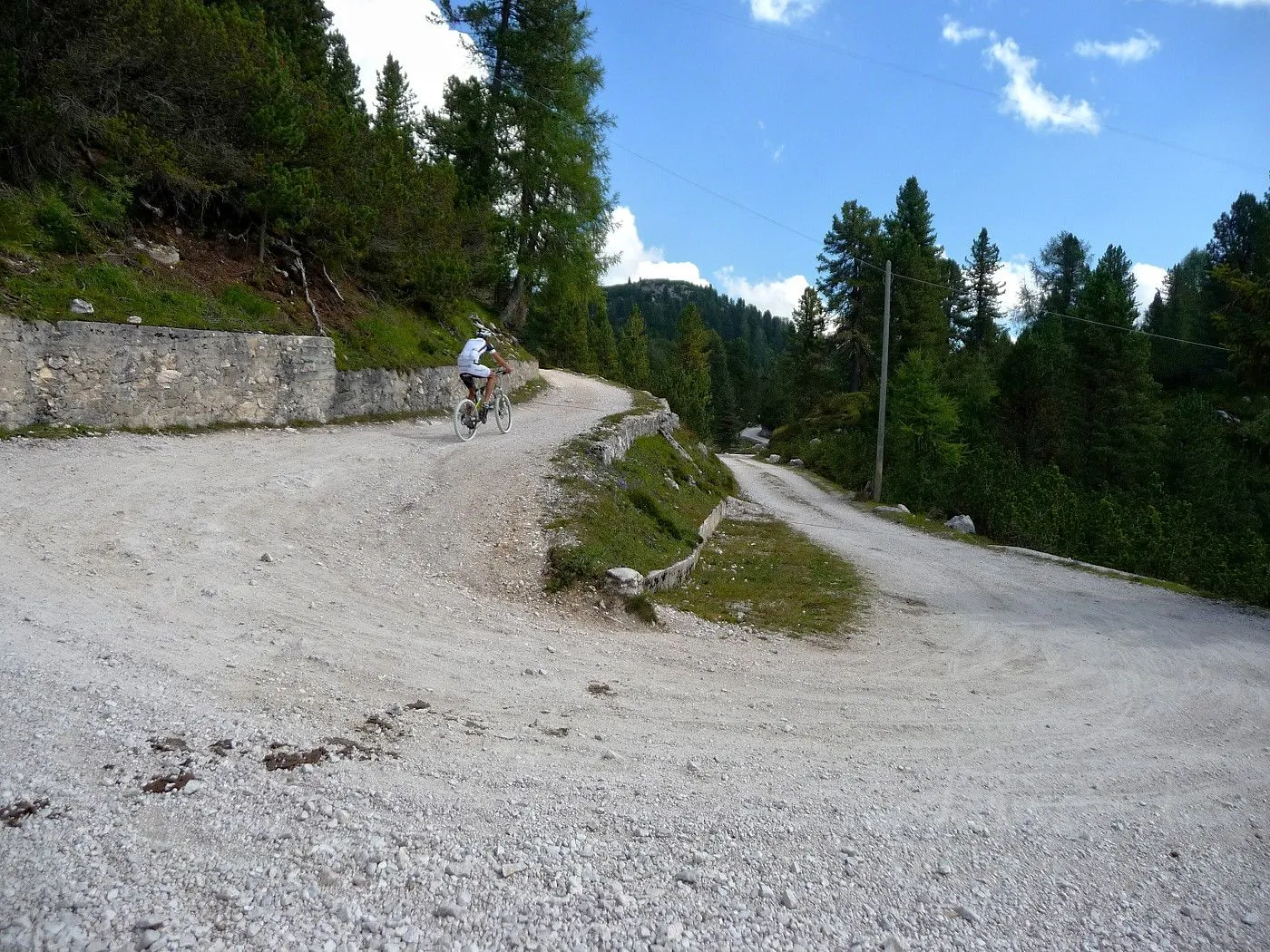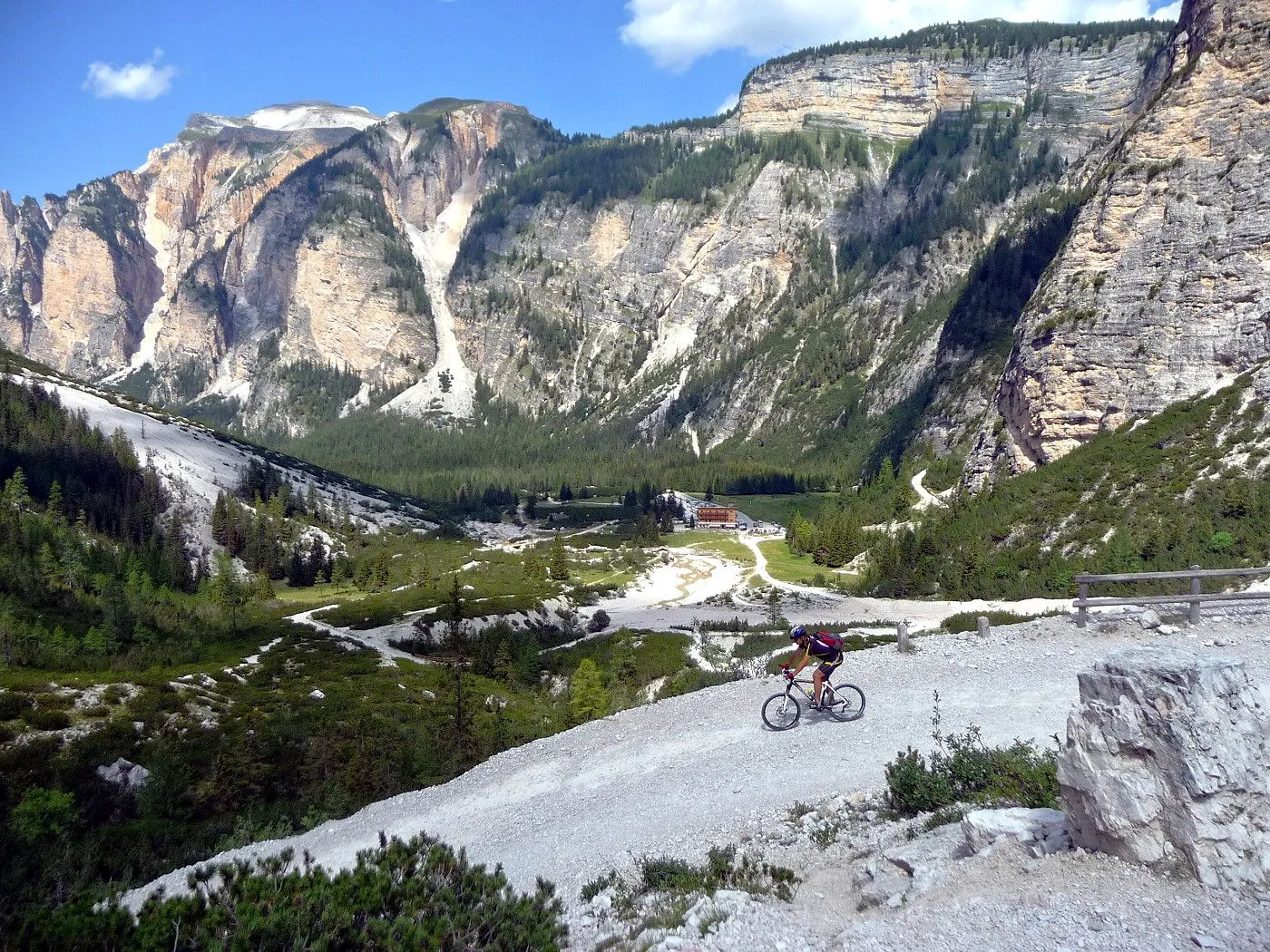 Die Biketour beginnt ca. 7km nach Cimabanche bei der markanten 180 Grad- Kurve, wo es genügend Parkgelegenheiten gibt. Zunächst ca. 2km der Landesstraße abwärts Richtung Cortina folgend, biegt man rechts in das Fanestal ab. Zunächst noch auf asphaltiertem Untergrund, beginnt bald der Schotterweg, der durch das Fanestal bis zur Faneshütte führt. Dieser Schotterweg ist oft sehr steil und an manchen Stellen beinahe unbefahrbar. Außerdem ist der Untergrund teilweise recht lose und mit Steinen durchsetzt. Daher gestaltet sich der Weg bis zur Faneshütte insgesamt als wirklich anspruchsvoll. Dafür entschädigen viele Landschaftsdetails, wie ein spektakulärer Wasserfall, tiefe Schluchten oder auch der wunderschön gelegene Limosee, für die Mühen. Nach einer Rast auf der Faneshütte führt uns der nun sehr gut befahrbare Schotterweg hinunter bis Pederü. Dort beginnt die nächste große Schwierigkeit dieser Biketour. Eine unglaublich steile, betonierte Militärstraße muss bezwungen werden. Nach den extrem schwierigen Kehren dieser Straße fährt man wieder auf schottrigem Untergrund weiter. Jedoch bleibt der Weg weiterhin enorm steil und bis man die wunderschöne Ebene der Fodara Vedla erreicht hat, wird einem nochmals alles abverlangt. Diese Schwierigkeiten überwunden, wird es nun deutlich einfacher. Der Schotterweg führt uns zur Senneshütte, wo man eventuell eine neuerliche Rast einlegen kann. Nun beginnt die Abfahrt Richtung Ra Stua. Diese ist an manchen Stellen extrem steil und der Untergrund ist teilweise recht lose, womit eine hohe Konzentration und ein wenig Mut bei der Abfahrt gefordert sind. Von Ra Stua führt uns in rasanter Fahrt eine asphaltierte Straße zurück zum Ausgangspunkt bei der 180 Grad- Kurve.
