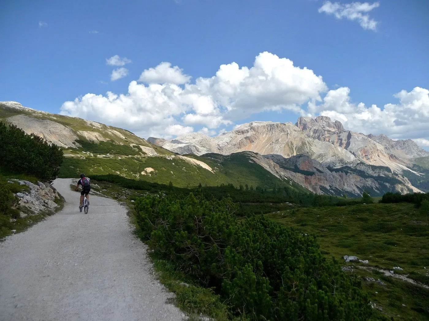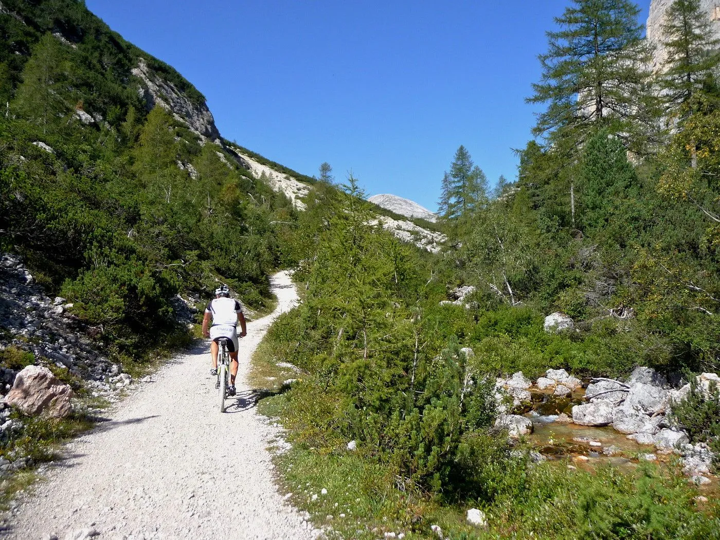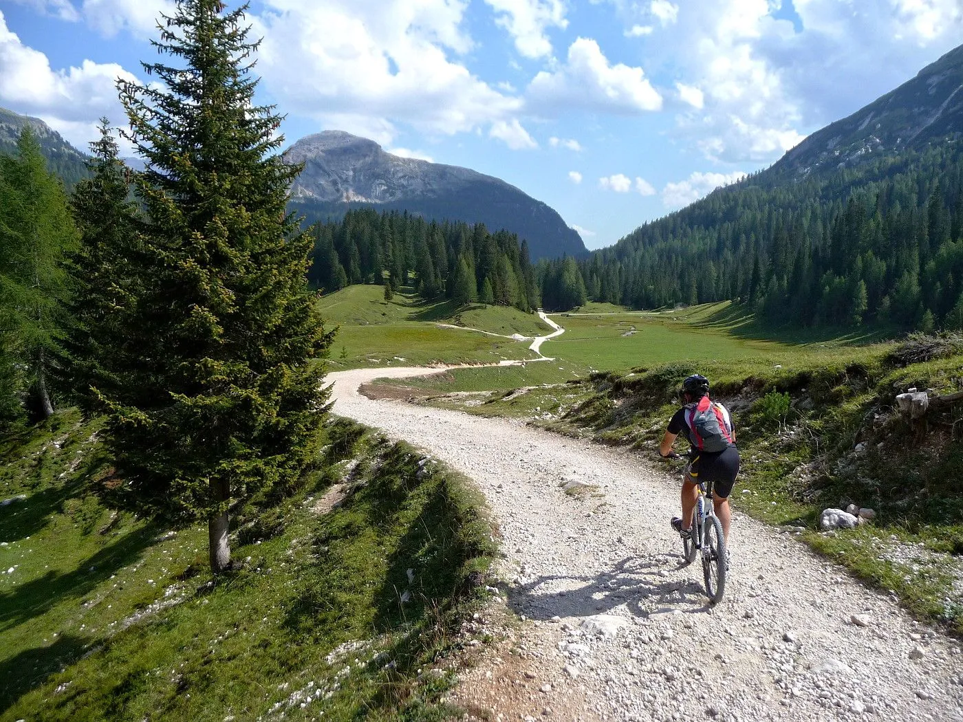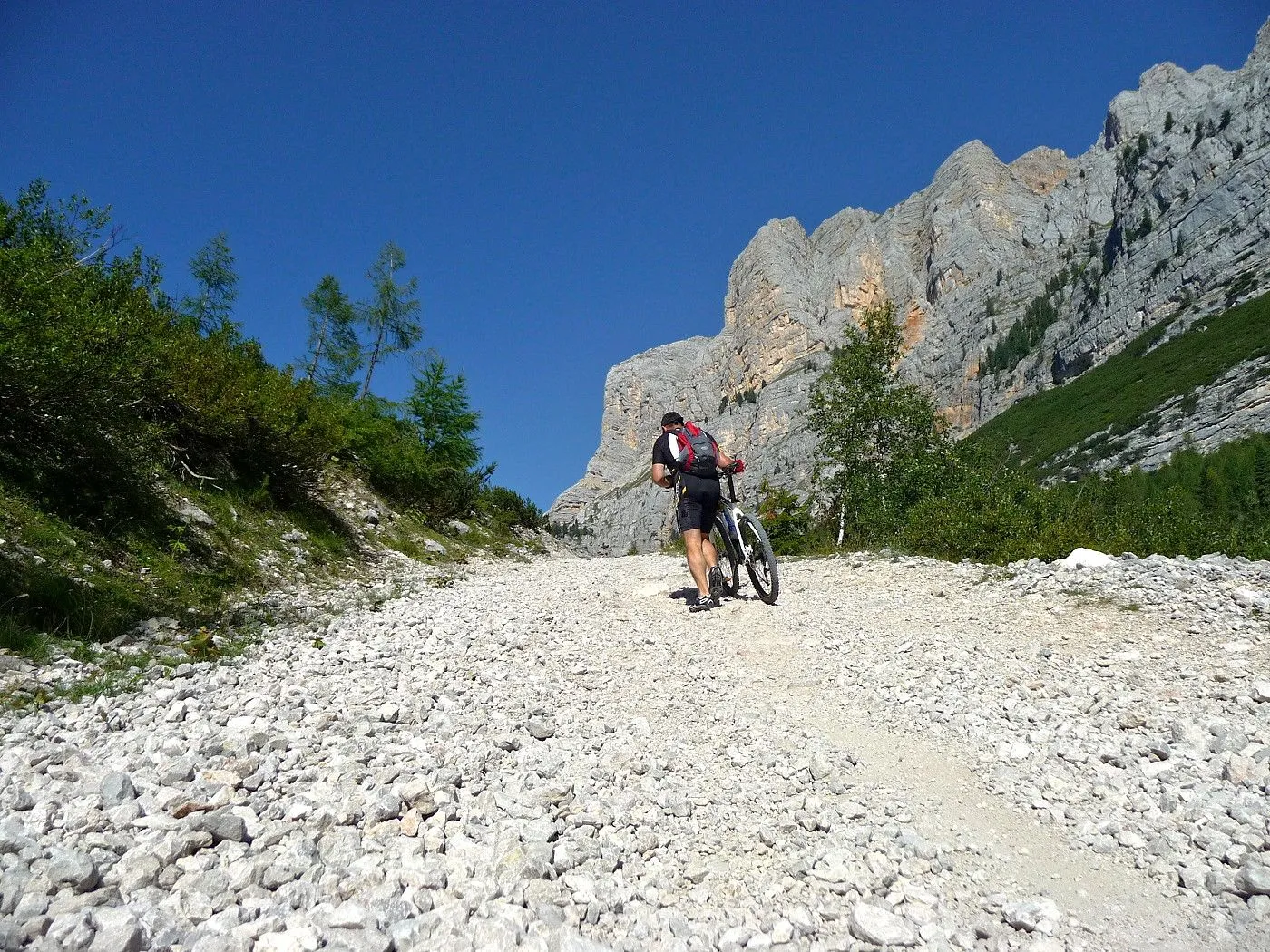 Die Biketour beginnt ca. 7km nach Cimabanche bei der markanten 180 Grad- Kurve, wo es genügend Parkgelegenheiten gibt. Zunächst ca. 2km der Landesstraße abwärts Richtung Cortina folgend, biegt man rechts in das Fanestal ab. Zunächst noch auf asphaltiertem Untergrund, beginnt bald der Schotterweg, der durch das Fanestal bis zur Faneshütte führt. Dieser Schotterweg ist oft sehr steil und an manchen Stellen beinahe unbefahrbar. Außerdem ist der Untergrund teilweise recht lose und mit Steinen durchsetzt. Daher gestaltet sich der Weg bis zur Faneshütte insgesamt als wirklich anspruchsvoll. Dafür entschädigen viele Landschaftsdetails, wie ein spektakulärer Wasserfall, tiefe Schluchten oder auch der wunderschön gelegene Limosee, für die Mühen. Nach einer Rast auf der Faneshütte führt uns der nun sehr gut befahrbare Schotterweg hinunter bis Pederü. Dort beginnt die nächste große Schwierigkeit dieser Biketour. Eine unglaublich steile, betonierte Militärstraße muss bezwungen werden. Nach den extrem schwierigen Kehren dieser Straße fährt man wieder auf schottrigem Untergrund weiter. Jedoch bleibt der Weg weiterhin enorm steil und bis man die wunderschöne Ebene der Fodara Vedla erreicht hat, wird einem nochmals alles abverlangt. Diese Schwierigkeiten überwunden, wird es nun deutlich einfacher. Der Schotterweg führt uns zur Senneshütte, wo man eventuell eine neuerliche Rast einlegen kann. Nun beginnt die Abfahrt Richtung Ra Stua. Diese ist an manchen Stellen extrem steil und der Untergrund ist teilweise recht lose, womit eine hohe Konzentration und ein wenig Mut bei der Abfahrt gefordert sind. Von Ra Stua führt uns in rasanter Fahrt eine asphaltierte Straße zurück zum Ausgangspunkt bei der 180 Grad- Kurve.