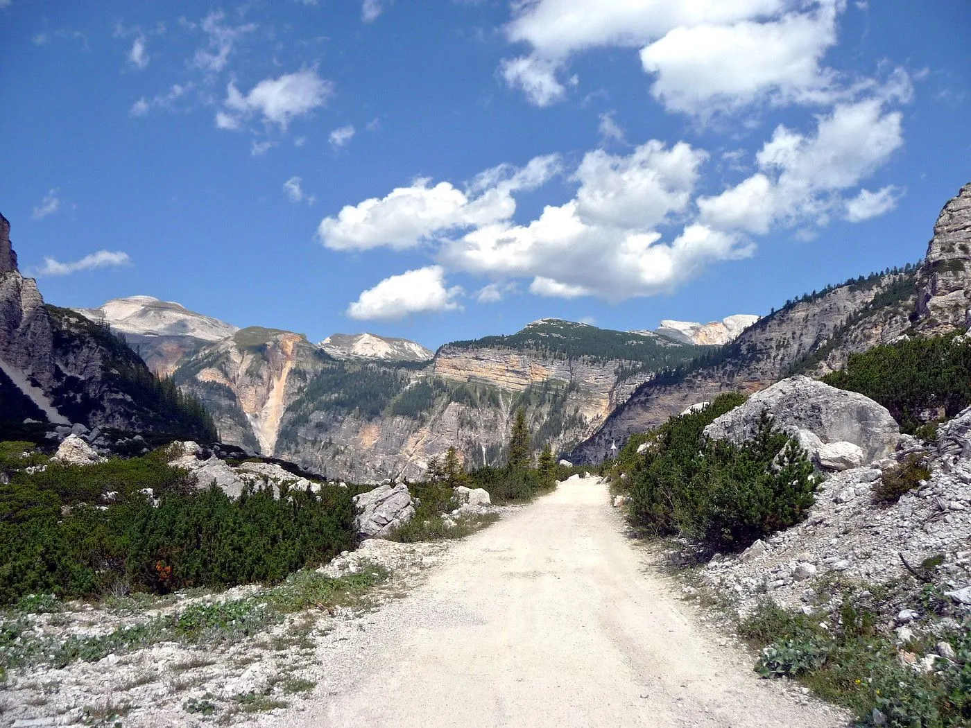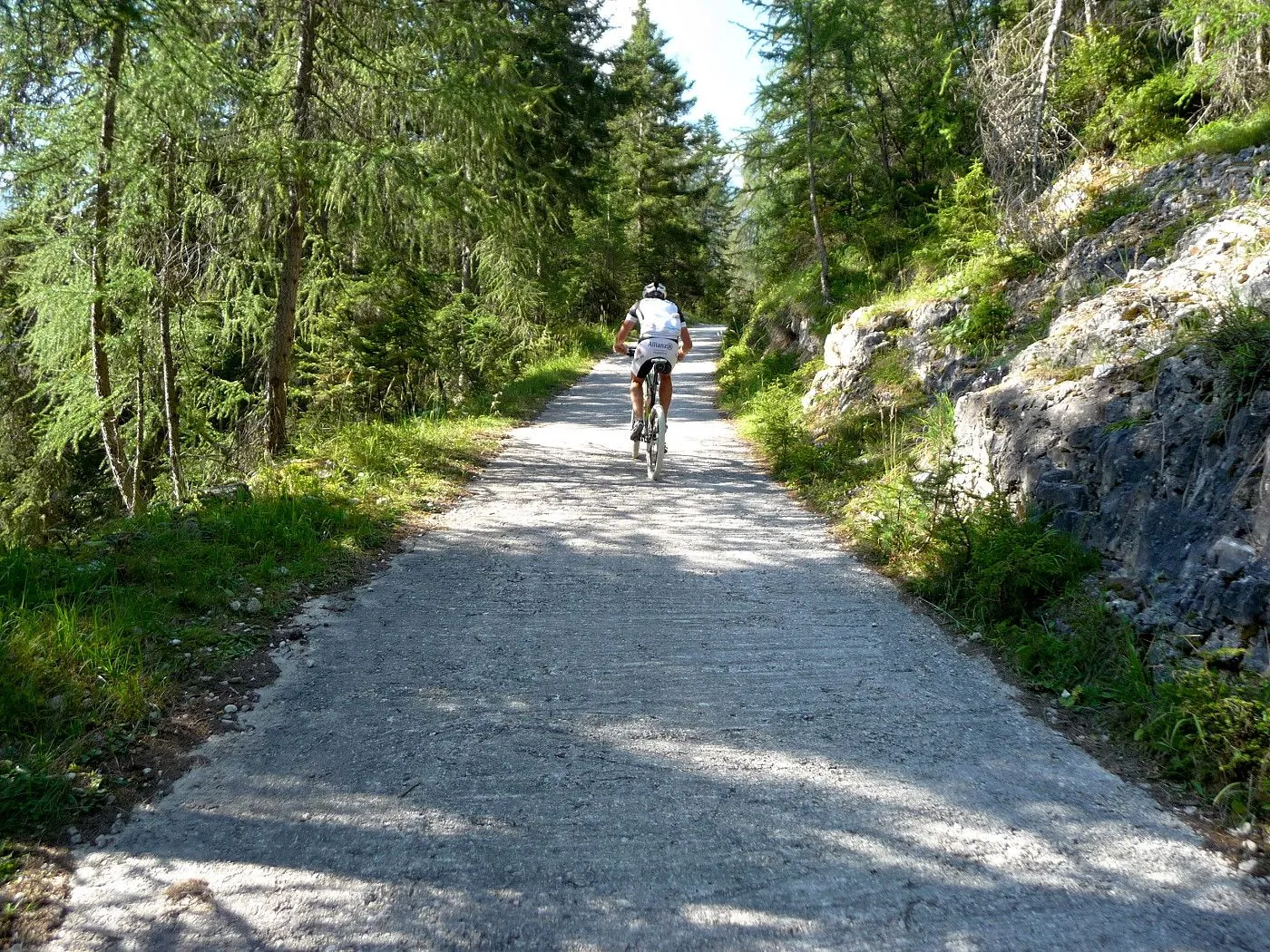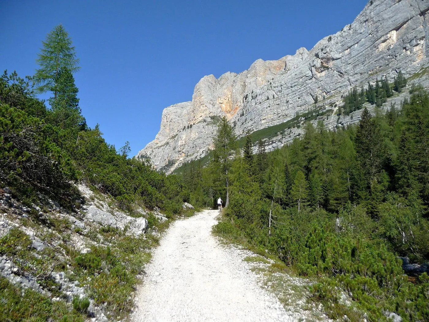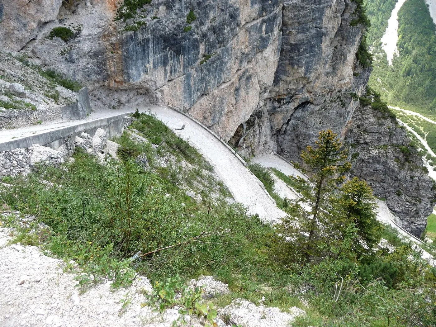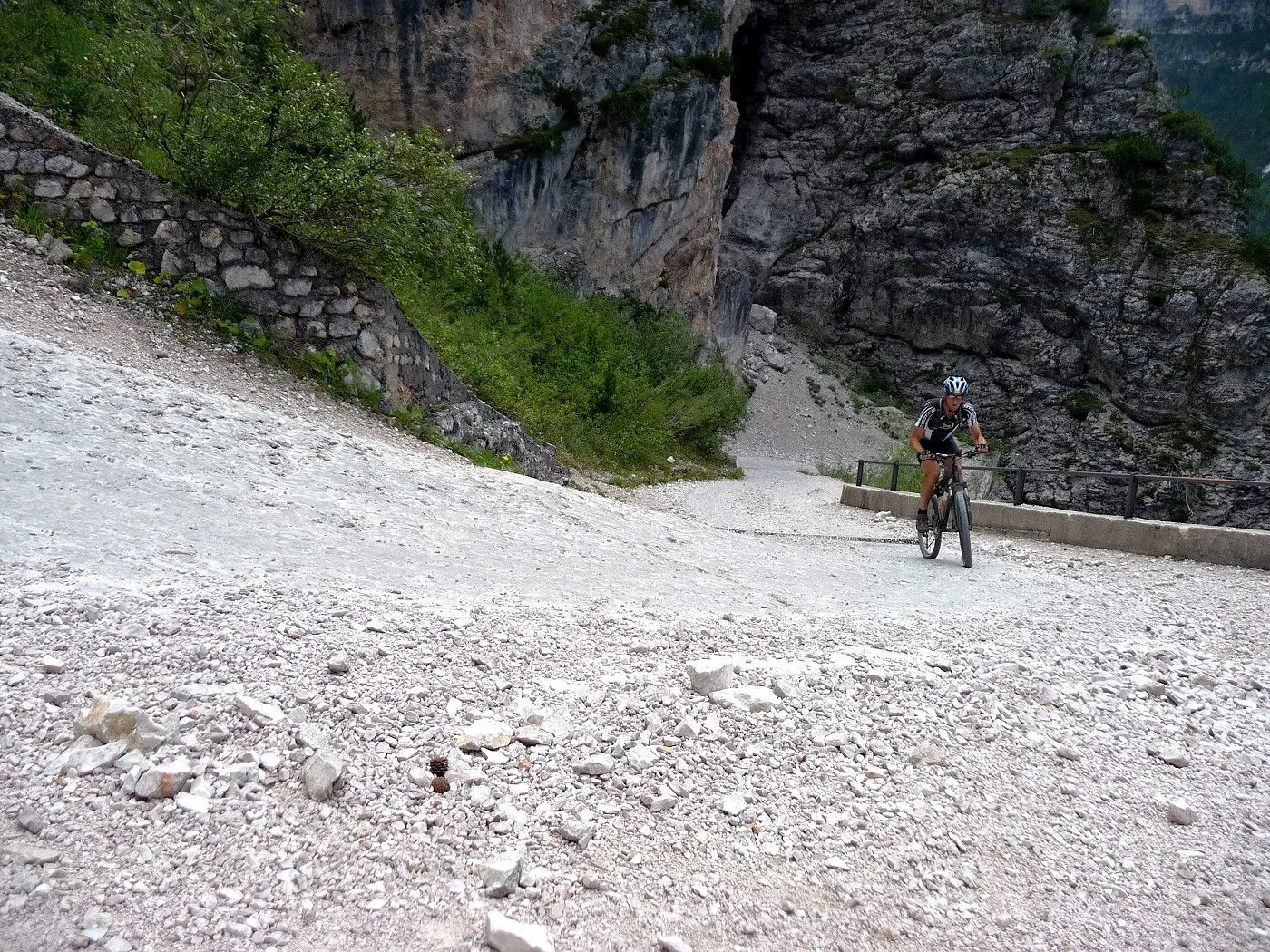 Die Biketour beginnt ca. 7km nach Cimabanche bei der markanten 180 Grad- Kurve, wo es genügend Parkgelegenheiten gibt. Zunächst ca. 2km der Landesstraße abwärts Richtung Cortina folgend, biegt man rechts in das Fanestal ab. Zunächst noch auf asphaltiertem Untergrund, beginnt bald der Schotterweg, der durch das Fanestal bis zur Faneshütte führt. Dieser Schotterweg ist oft sehr steil und an manchen Stellen beinahe unbefahrbar. Außerdem ist der Untergrund teilweise recht lose und mit Steinen durchsetzt. Daher gestaltet sich der Weg bis zur Faneshütte insgesamt als wirklich anspruchsvoll. Dafür entschädigen viele Landschaftsdetails, wie ein spektakulärer Wasserfall, tiefe Schluchten oder auch der wunderschön gelegene Limosee, für die Mühen. Nach einer Rast auf der Faneshütte führt uns der nun sehr gut befahrbare Schotterweg hinunter bis Pederü. Dort beginnt die nächste große Schwierigkeit dieser Biketour. Eine unglaublich steile, betonierte Militärstraße muss bezwungen werden. Nach den extrem schwierigen Kehren dieser Straße fährt man wieder auf schottrigem Untergrund weiter. Jedoch bleibt der Weg weiterhin enorm steil und bis man die wunderschöne Ebene der Fodara Vedla erreicht hat, wird einem nochmals alles abverlangt. Diese Schwierigkeiten überwunden, wird es nun deutlich einfacher. Der Schotterweg führt uns zur Senneshütte, wo man eventuell eine neuerliche Rast einlegen kann. Nun beginnt die Abfahrt Richtung Ra Stua. Diese ist an manchen Stellen extrem steil und der Untergrund ist teilweise recht lose, womit eine hohe Konzentration und ein wenig Mut bei der Abfahrt gefordert sind. Von Ra Stua führt uns in rasanter Fahrt eine asphaltierte Straße zurück zum Ausgangspunkt bei der 180 Grad- Kurve.