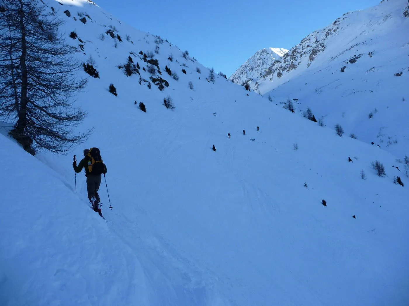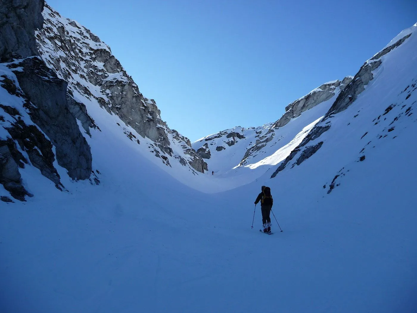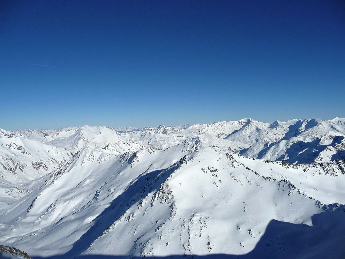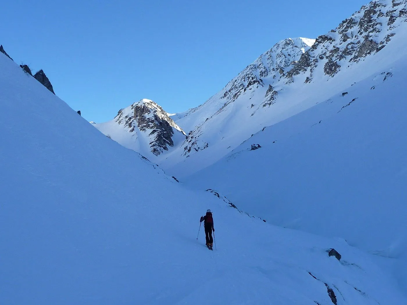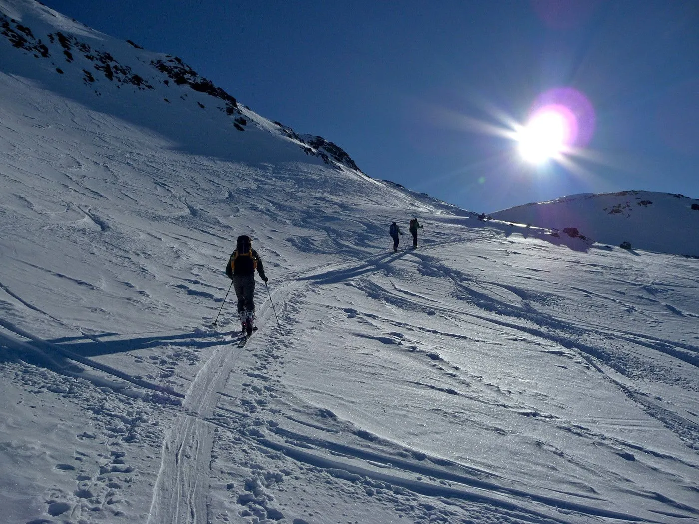 Variante 2: 1800Hm und ca. 10km Abfahrt!! Die Abfahrt ist an Länge und Schönheit kaum zu überbieten. Allerdings ist ein 2 PKW notwendig, da man von Unterlesach bzw. Oberlesach wieder zum Ausgangsort gelangen muss. Zuerst über den letzten Steilhang zum Tschadinsattel (2993m). Nun immer linkshaltend über schöne Mulden bis zum P. 2543 der ÖK. Die folgende Steilstufe (Achtung unten Felsabbrüche) wieder linkshaltend abfahren und über einen Graben weiter in den Talboden bis zu den Hütten der Lesachalm (1818m). Sehr gute Schifahrer können entlang des Sommersteigs, dem Bachbett folgend, bis Unterlesach (1320m) weiter abfahren. Diese Variante ist allerdings ziemlich schwierig und man benötigt noch genügend Kraft in den Beinen! Außerdem muss man im Frühjahr auf genügend Schneelage und am Nachmittag auf die erhöhte Lawinengefahr achten! Die andere Variante führt ab der Lesachalm entlang der Zufahrtsstraße bergauf bis zu einer Weggabelung (1880m) und von da an bergab über die Straße bis Oberlesach (1415m).