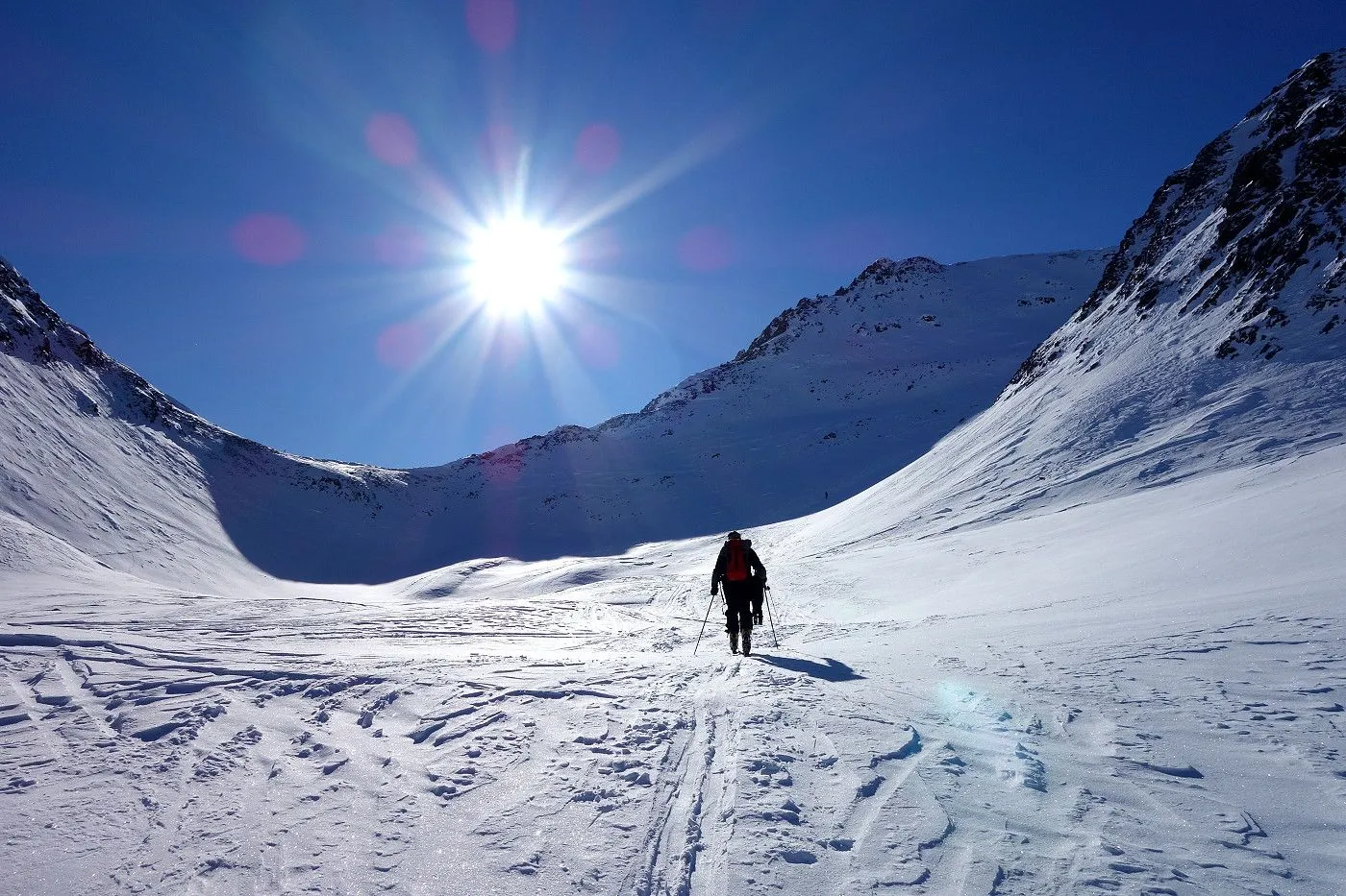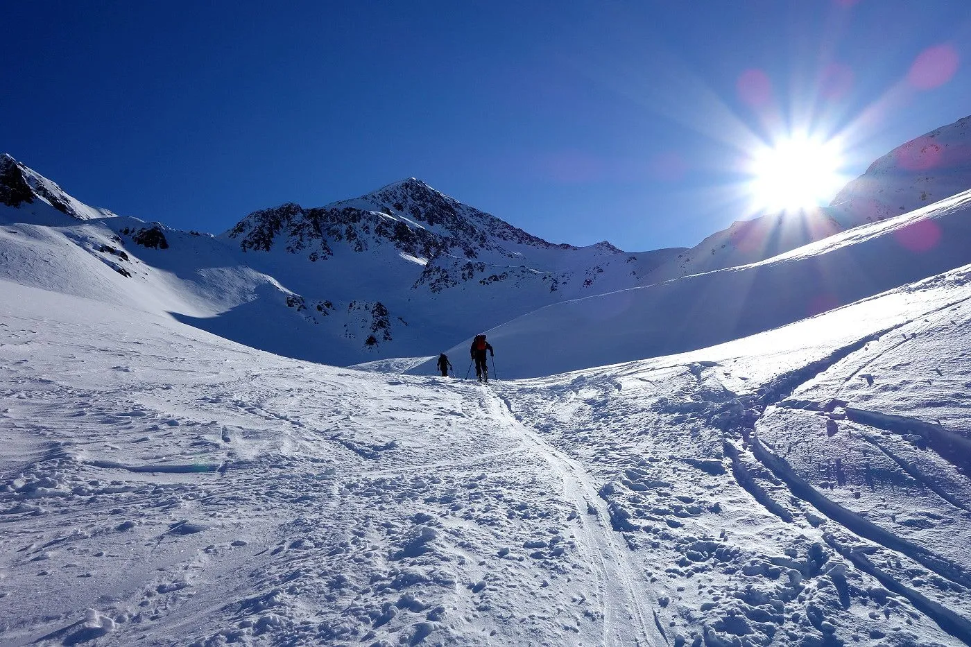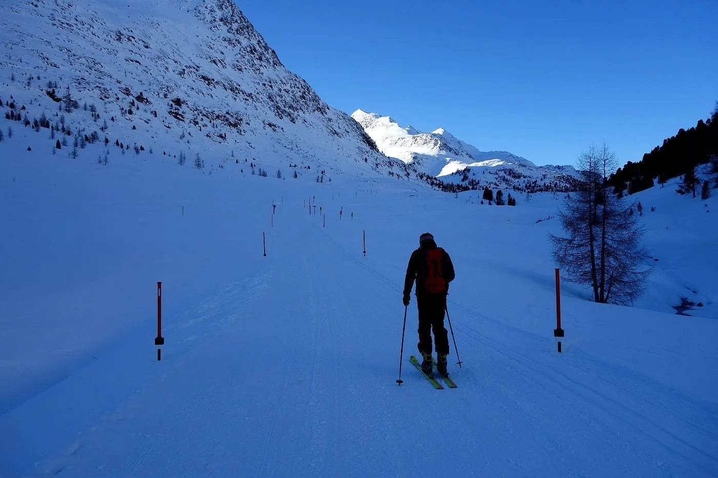 Die Abfahrt erfolgt zunächst in Anlehung zum Aufstieg. Auf Höhe 2570m hält man sich eher links und fährt über mäßig steile bzw. sogar sehr flache Hänge und Böden durch das Ackstal ab, bis man kurz vor dem Obersee auf die Langlaufloipe gelangt. Diese mehrmals querend abwärts bis zum Obersee und über die nichtgeräumte Passstraße mithilfe von Stockeinsatz und Skatingschritt zurück zum Ausgangspunkt.
