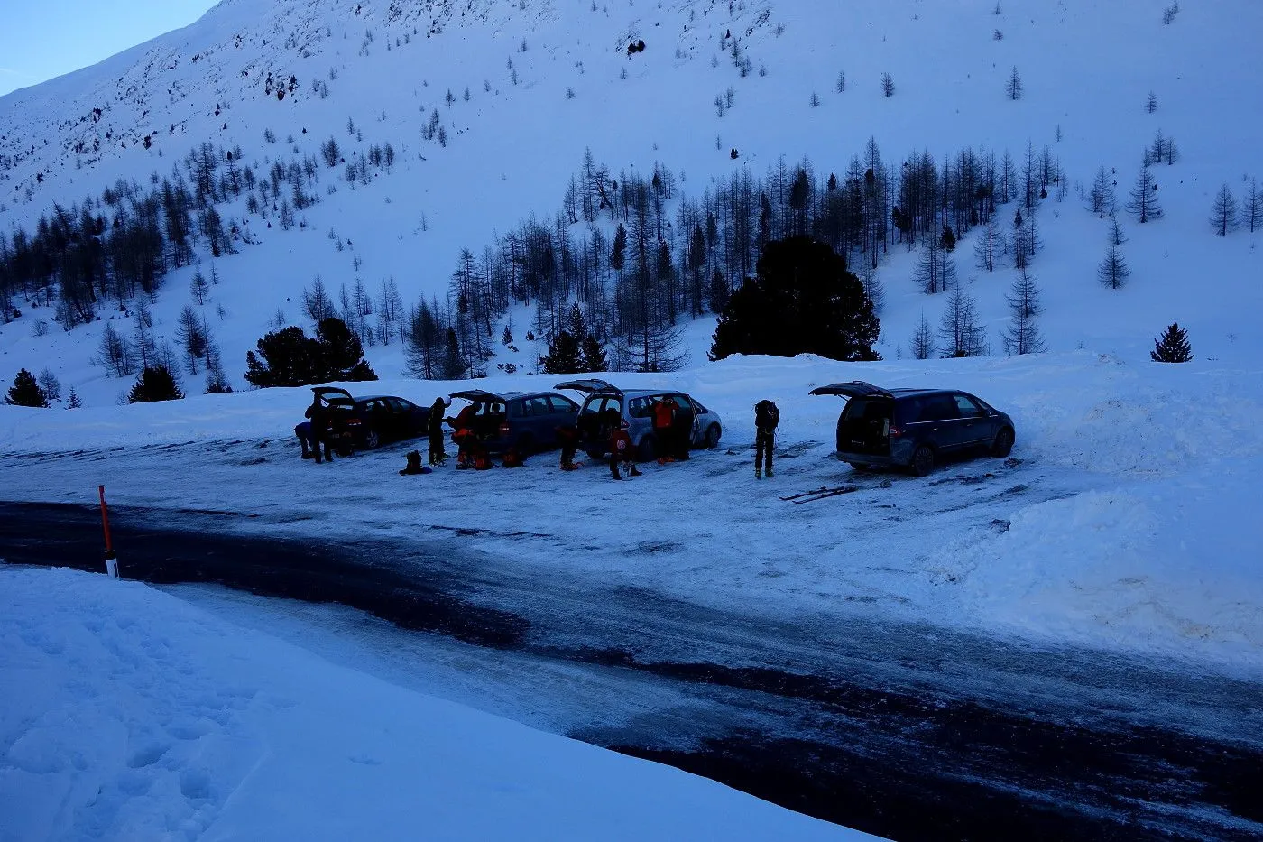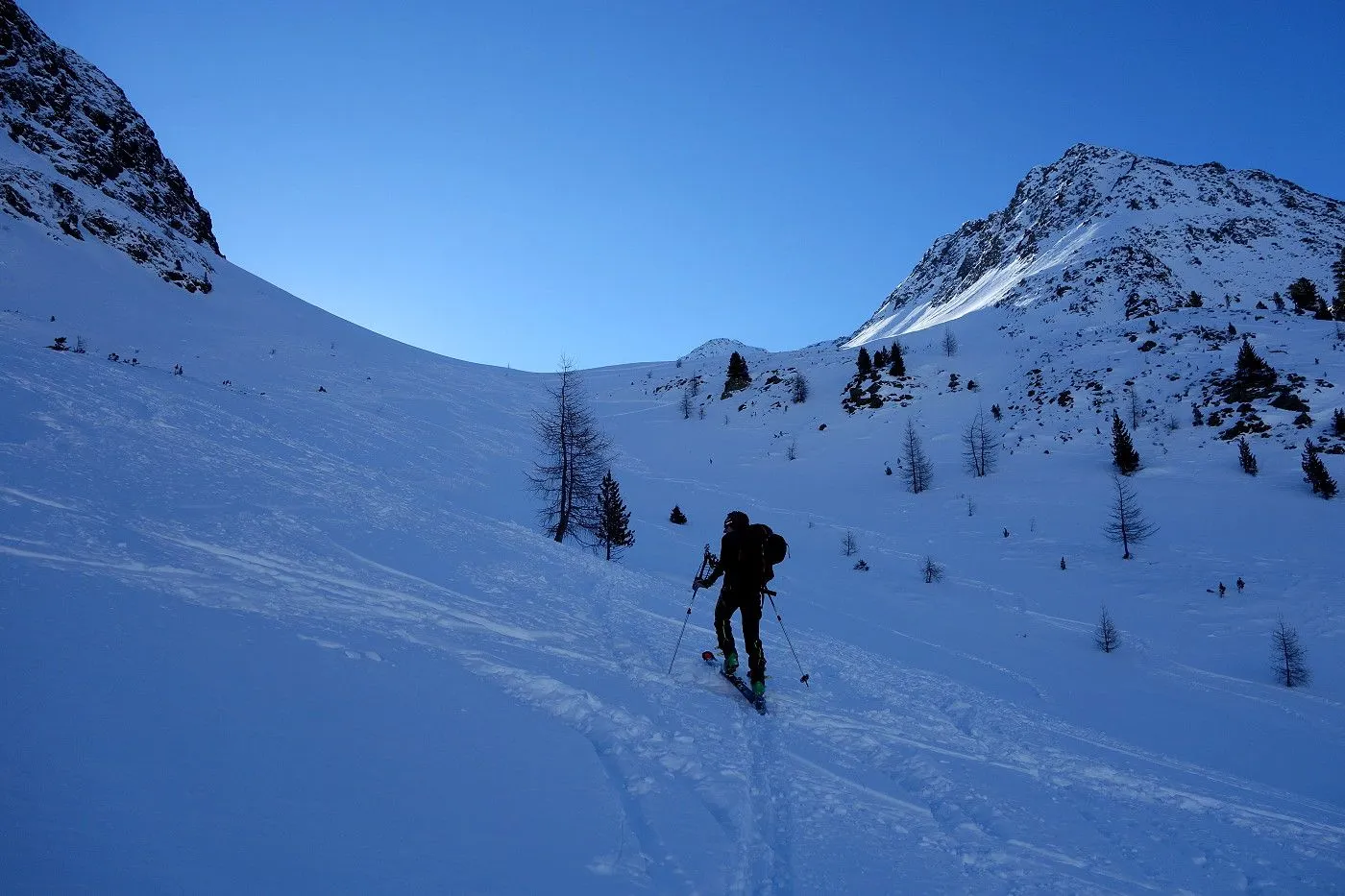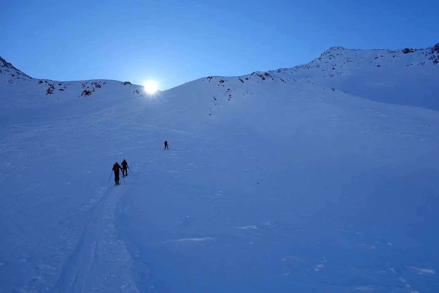 Die Abfahrt erfolgt zunächst in Anlehung zum Aufstieg. Auf Höhe 2570m hält man sich eher links und fährt über mäßig steile bzw. sogar sehr flache Hänge und Böden durch das Ackstal ab, bis man kurz vor dem Obersee auf die Langlaufloipe gelangt. Diese mehrmals querend abwärts bis zum Obersee und über die nichtgeräumte Passstraße mithilfe von Stockeinsatz und Skatingschritt zurück zum Ausgangspunkt.