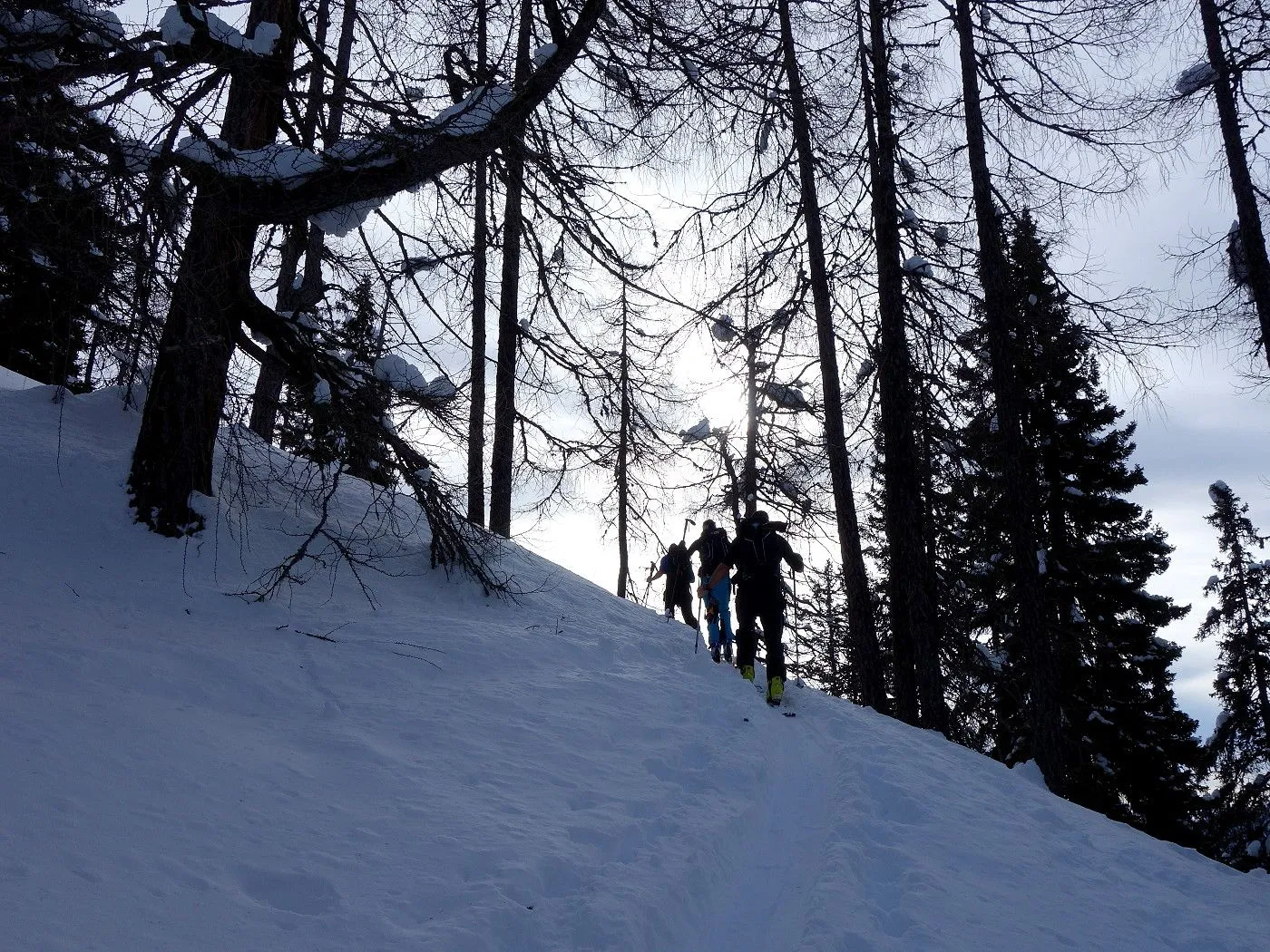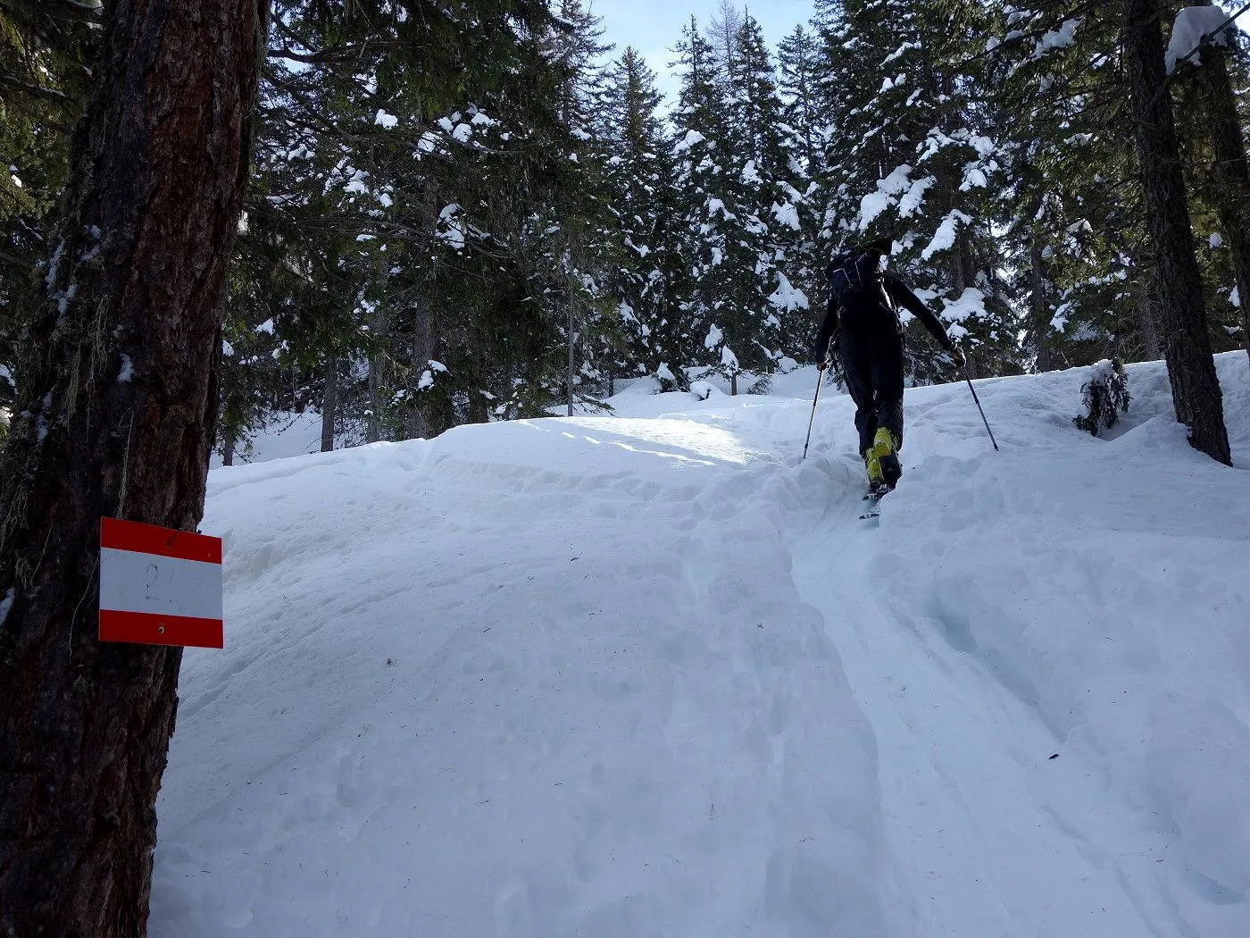 Wegfindung: Durch den Lärchenwald etwas schwierige Orientierung. |