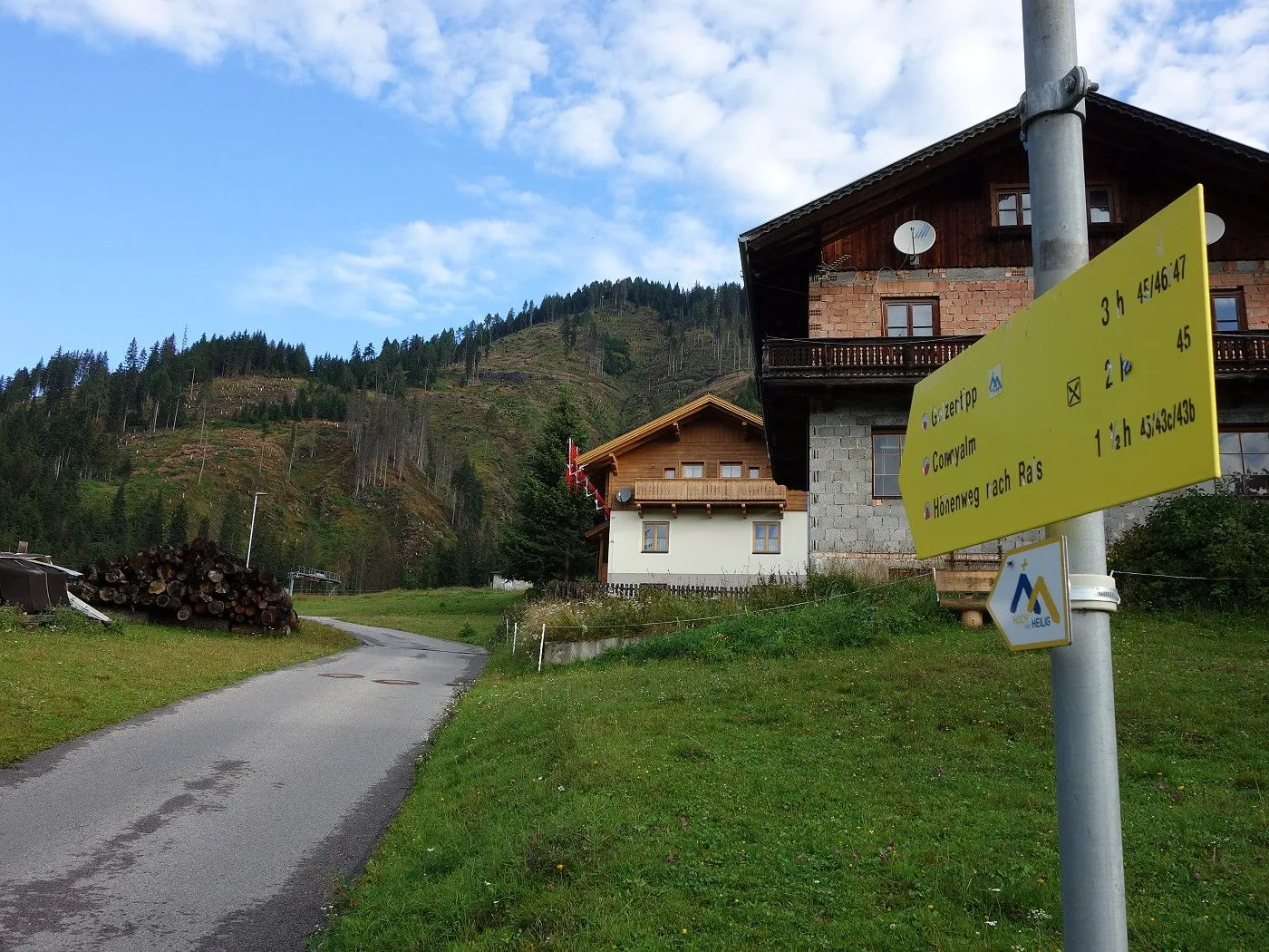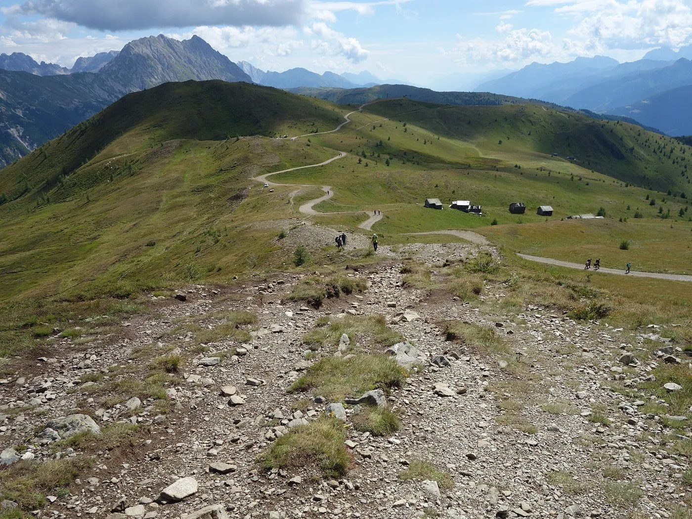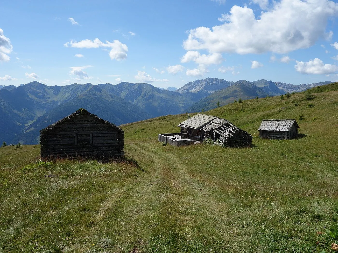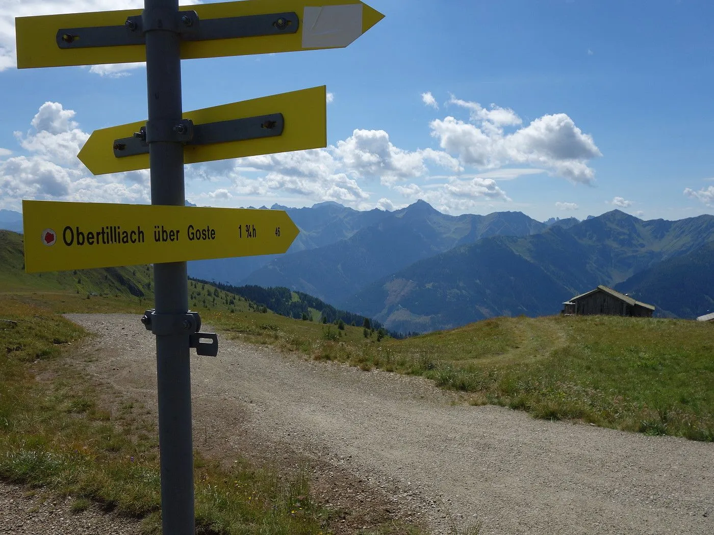 Der Abstieg erfolgt zunächst südostwärts direkt auf die weithin sichtbaren Kutteschupfen (2215m) zu. Dort leitet uns der Wegweiser „Obertilliach über Goste – Nr. 46“ in einen Steig, der uns sehr steil, später an einigen verfallenen Heuhütten vorbei, südwärts schnell talwärts bringt. Auf Seehöhe 1700m betritt man einen Schotterweg, dem man später an den Schneelanzen vorbei bis zur vom Aufstieg bekannten Wegkreuzung (1540m) folgt. Von dort über den Aufstiegsweg zurück zum Ausgangspunkt (1450m) dieser Tour.