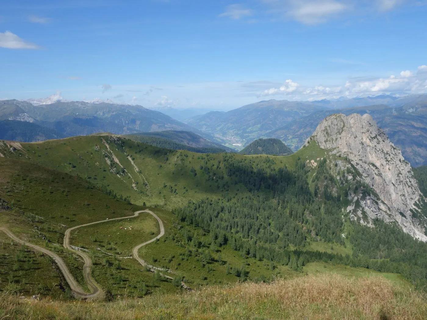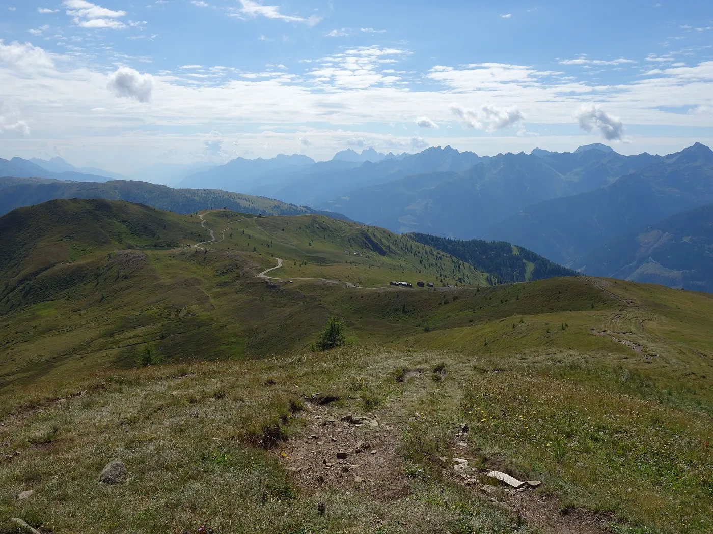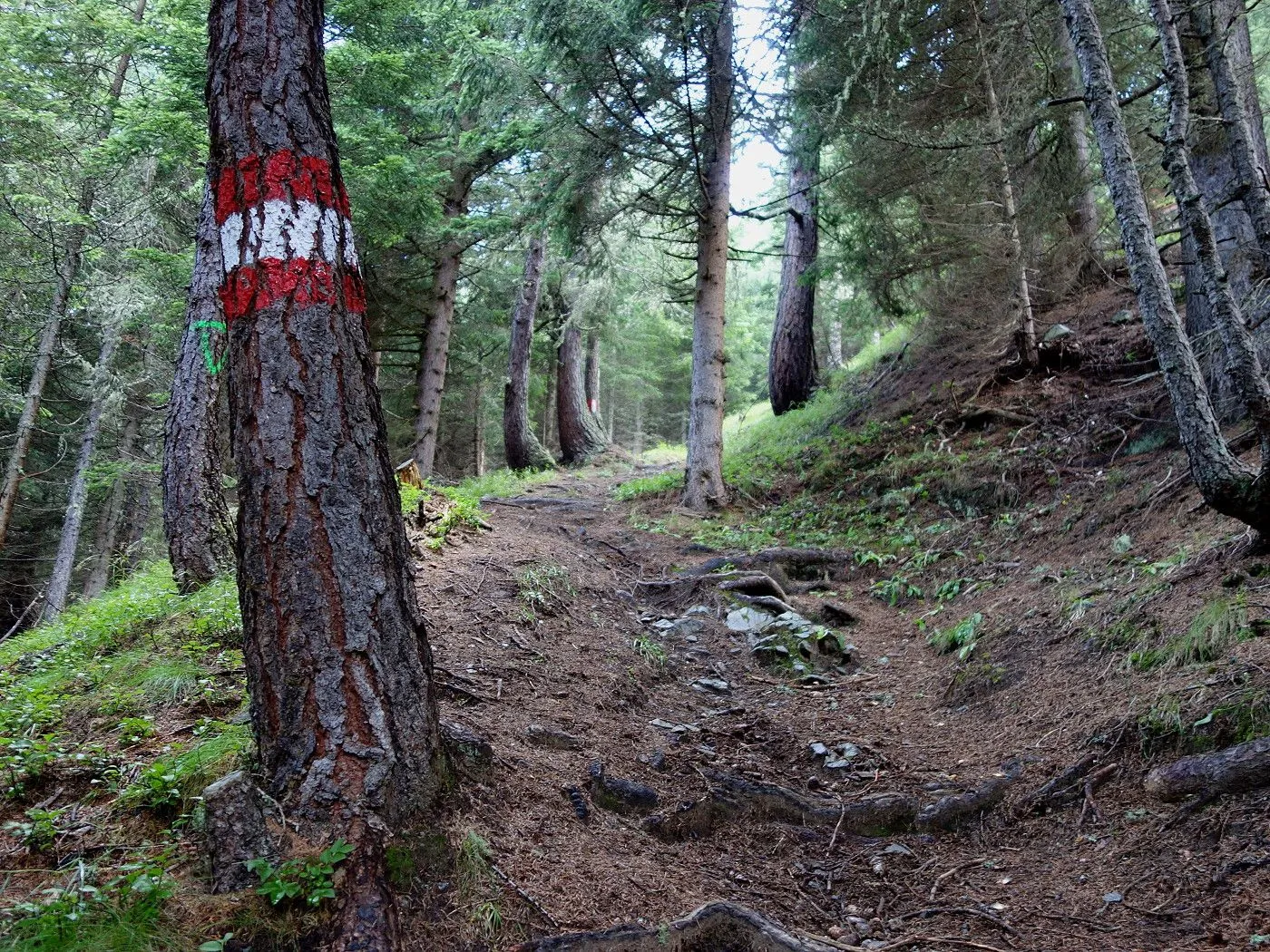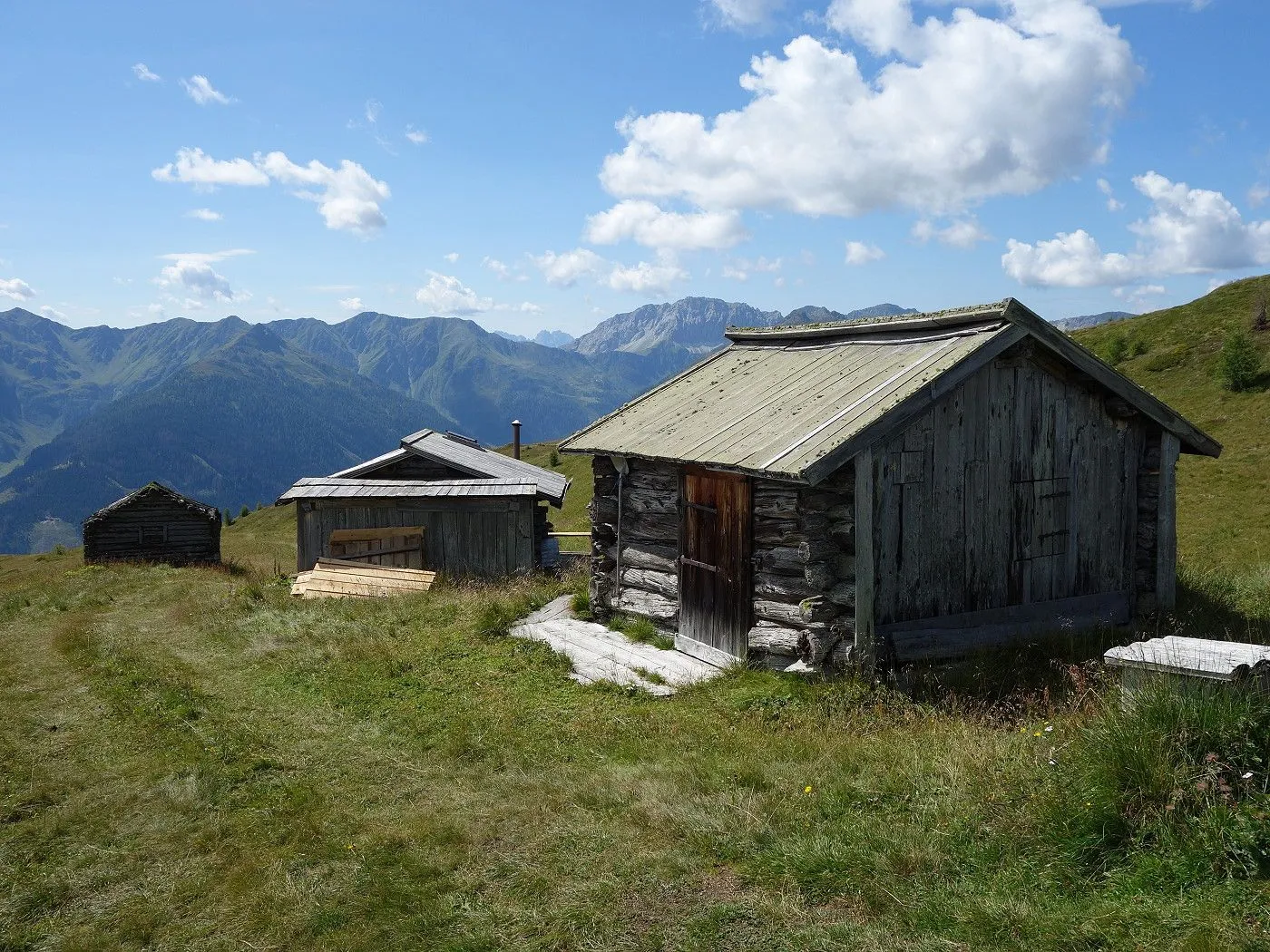 Der Abstieg erfolgt zunächst südostwärts direkt auf die weithin sichtbaren Kutteschupfen (2215m) zu. Dort leitet uns der Wegweiser „Obertilliach über Goste – Nr. 46“ in einen Steig, der uns sehr steil, später an einigen verfallenen Heuhütten vorbei, südwärts schnell talwärts bringt. Auf Seehöhe 1700m betritt man einen Schotterweg, dem man später an den Schneelanzen vorbei bis zur vom Aufstieg bekannten Wegkreuzung (1540m) folgt. Von dort über den Aufstiegsweg zurück zum Ausgangspunkt (1450m) dieser Tour.