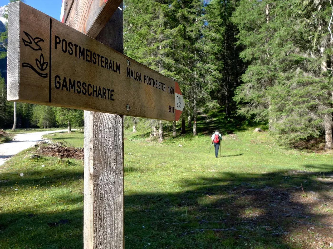 Die Tour beginnt beim Alpengasthof Brückele (1491m) im Altpragsertal, wo es zahlreiche Parkmöglichkeiten gibt (gebührenpflichtig, 2€/Tag). Zunächst folgt man einer Schotterstraße rechts taleinwärts, bis man zu einem Kriegsdenkmal gelangt. Gleich dahinter leitet uns der Wegweiser "Postmeisteralm" in ein schmales Steiglein, das uns zwischen Latschen und einzeln stehenden Lärchen, schnell an Höhe gewinnend, bergwärts führt. Dabei hat man links die Hohe Gaisl und nach hinten den markanten Dürrenstein im Blickfeld, herrlich! Von der Postmeisteralm (1966m) führt nun das Steiglein in angenehmer Steigung durch das Gufidauntal hoch in einen weiten Kessel. Hier windet sich das Steiglein westwärts hoch in ein Törl (2361m). Von hier nun teilweise weglos, den roten Markierungen folgend, über die Südosthänge hoch bis zum Gipfelkreuz des Großen Roßkopfs (2559m).
