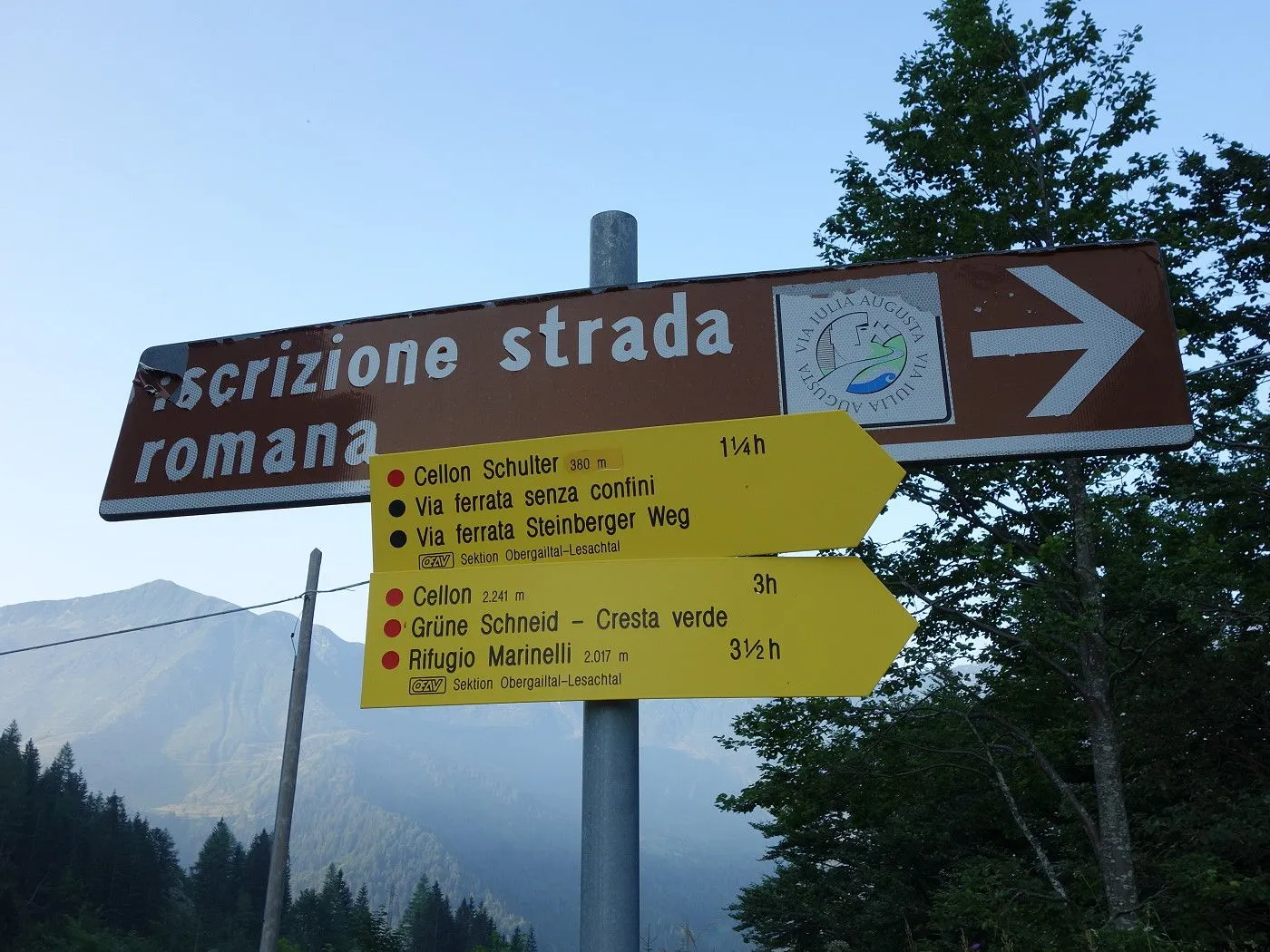 Die Bergtour startet direkt am Plöckenpass (1357m), wo es zahlreiche Parkmöglichkeiten gibt. Am südlichen Ende des Parkplatzes weist uns eine Wegweiser den Aufstieg Richtung "Rifugio Marinelli, dt. Marinellihütte" und man folgt zunächst einem schmalen Weg rechts der Talkerbe ins westwärts höher führende Tälchen. Bald in einen Steig übergehend, geht es durch Mischwald und später durch Strauchwerk hinauf in einen kleinen Wiesenboden, wo man den Abzweig Cellon passiert. Weiterhin den Markierungen Nr. 146 folgend, wendet sich der Steig links über das Bächlein und einem mit hüfthohen Gras bewachsenen Hang hoch zu einer Anhöhe hinauf. Nun recht flach, teilweise auch durch schrofigeres Gelände, am Abzweig Kollinkofel vorbei, bis zu den markanten Schrofenabbrüchen. Dort muss man durch ein mit Drahtseil und Steigbügeln gesichertes Felsenloch absteigen, ehe man am Fuße der hohen Felswände entlang und dann nochmals einige Höhenmeter bergab steigt (insgesamter Höhenverlust ca. 70 Meter). Nun entlang des Steiges wieder flach, dann angenehm ansteigend auf den Cima Plotta (2017m) zu, bis man kurz vor diesem, links haltend durch einen kleinen Sattel, den geschotterten Fahrweg Nr. 148 erreicht. Dieser führt uns zunächst angenehm ansteigend, am Schluss recht steil, hoch zur bereits weithin sichtbaren Rifugio Marinelli (2111m). Hinter der Hütte folgt man nun dem Steig Nr. 143, der sich zunächst über sanfte Graskuppen hoch zum Pic Chiadin (2302m) windet. Nun entlang einer markanten Grasschneide wieder leicht abwärts, später in leichter Kletterei Kalkrippen querend, bis man schließlich das Geröllkar am Fuße der Südflanke der Hohen Warte erreicht. Nun wird es nochmals richtig anstrengend! Denn nur sehr mühsam kommt man im losen Geröll höher, bis es über Felsbänke und -absätze links halten weiter geht. In einer günstigen Zickzack-Folge von ansteigenden Geröllbändern gelangt man in eine weitere Schuttrinne, die sich zwischen Hauptgipfel (links) und Mittelgipfel (rechts) herabzieht. Über diese weiterhin sehr anstrengend höher, bis man endlich die steil ansteigenden Felsstufen erreicht. Über sie links haltend, am Beginn in leichter Kletterei (I), in Kehren höher hoch zum obersten Westgrat. Unterhalb der Schneide nun rechts zum flachen Gipfelgrat, wo sich das Gipfelkreuz mit der obligatorischen Glocke befindet. Der allerhöchste Punkt (2780m) folgt wenig weiter östlich.