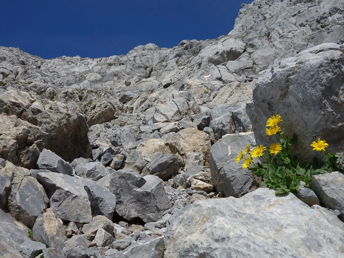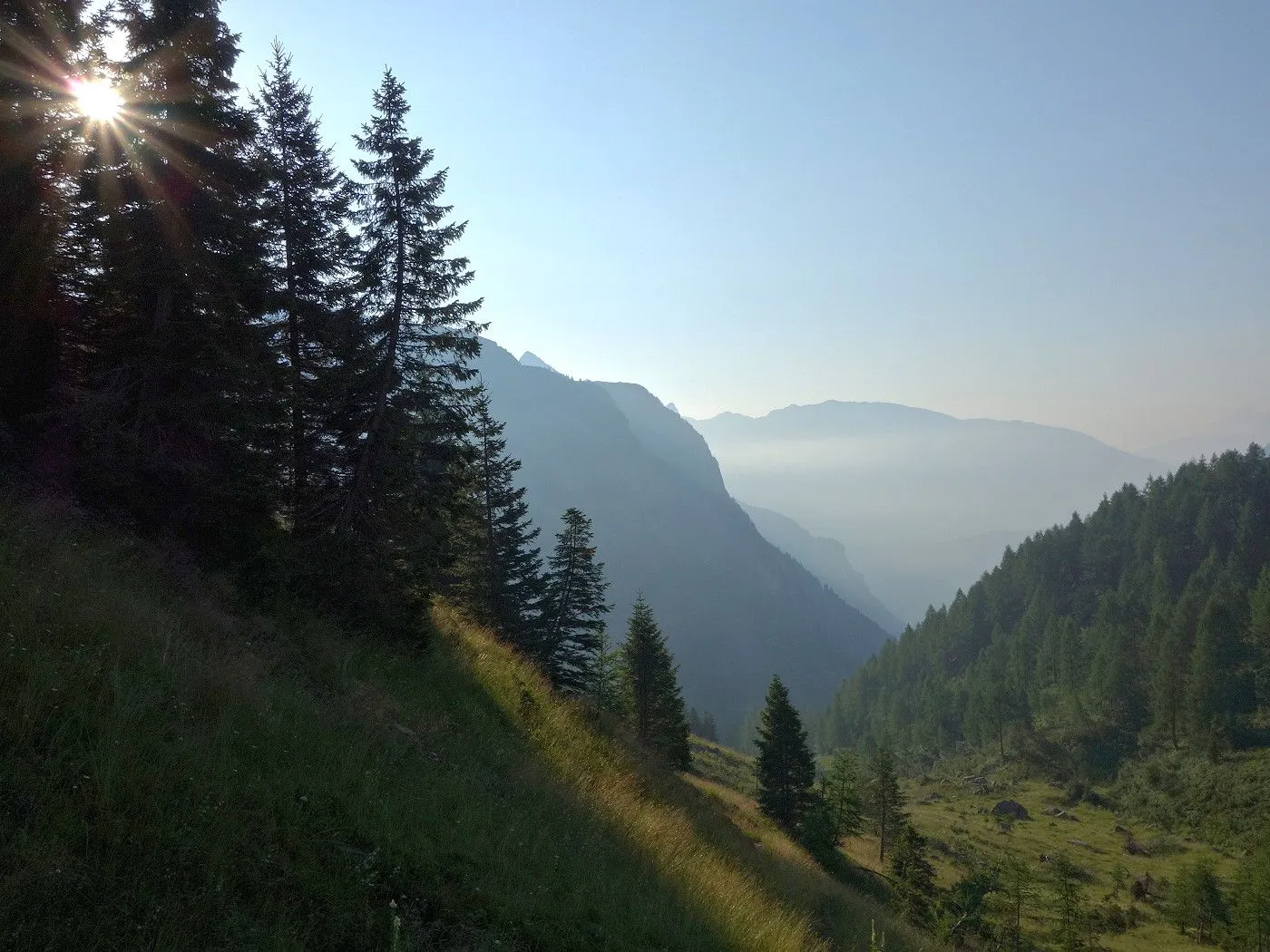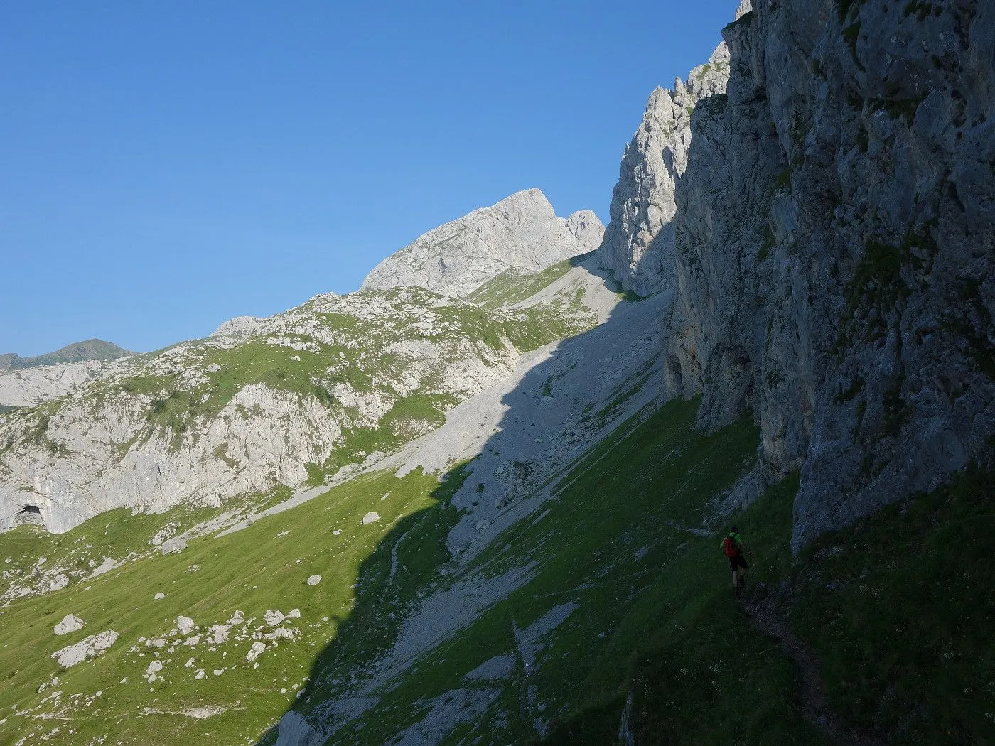 Früher Aufbruch empfohlen: Da der gesamte Aufstieg südseitig verläuft, ist man ständig der Sonne ausgesetzt. Ein früher Aufbruch hilft, der großen Hitze zu entkommen. |