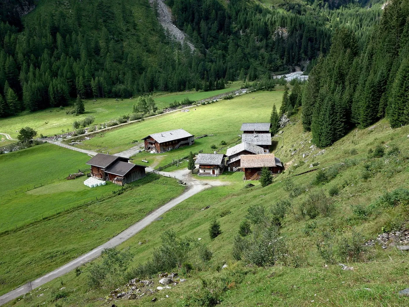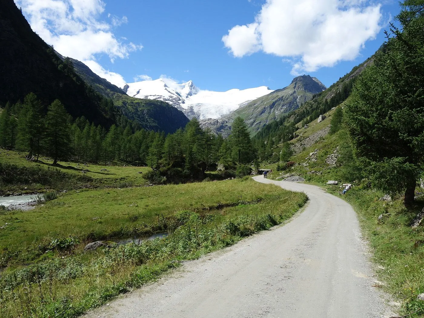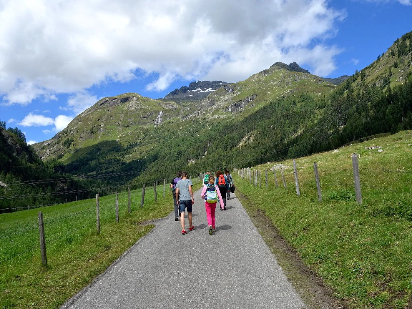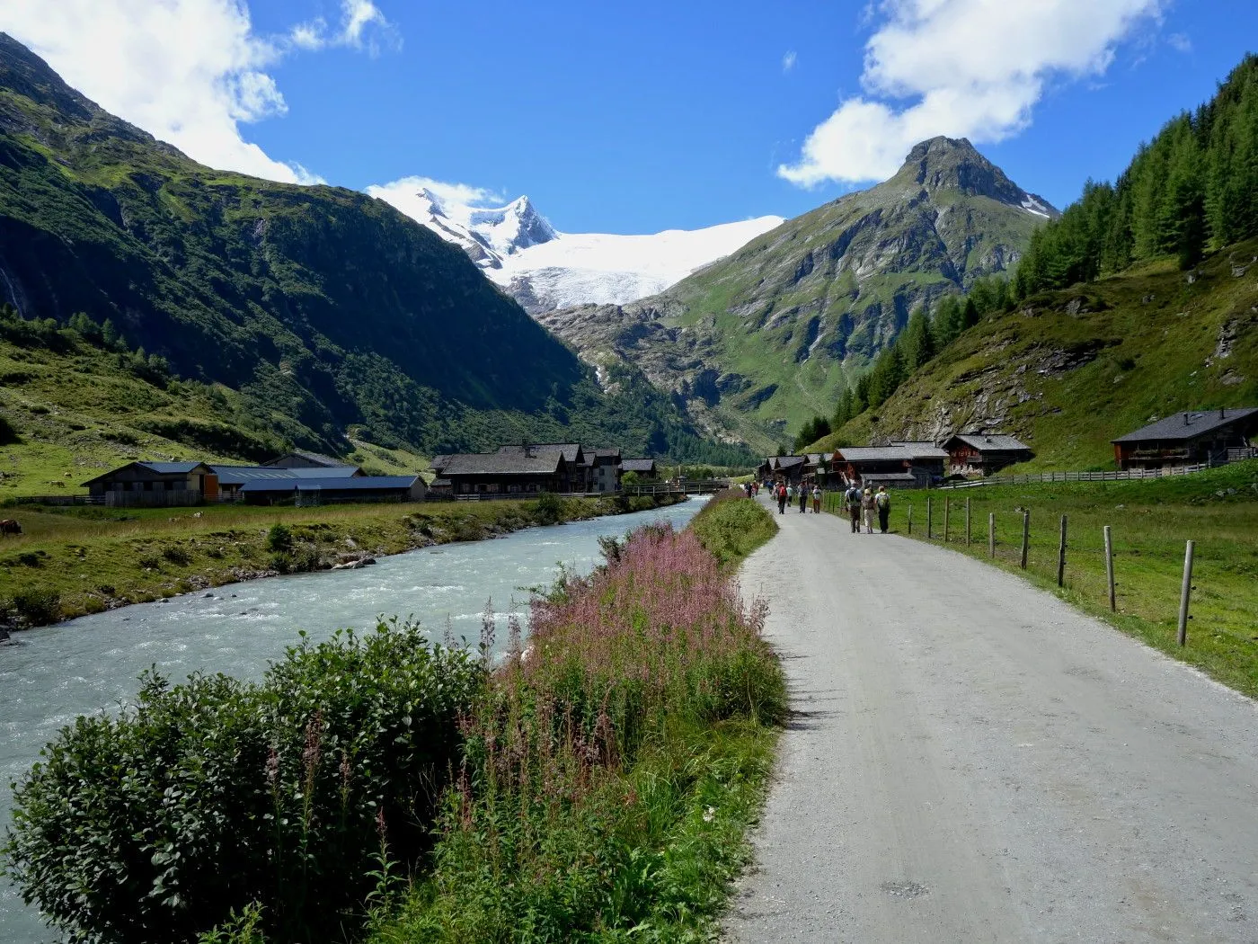 Von Innergschlöss über den Fahrweg ca. 600m zurück bis man zu einer Brücke gelangt. Dort wechselt man auf die andere Flussseite und folgt dem Tauerntal-Wanderweg zurück bis Außergschlöss. Dort ein kurzes Stück hoch zur sogenannten Hohen Achsel. Bald führt der Tauerntal-Wanderweg recht steil in Serpentinen bergab bis man wieder auf die Wiesen im Bereich des Ausgangspunktes der Tour gelangt. Über diese zurück zum Parkplatz beim Matreier Tauernhaus.