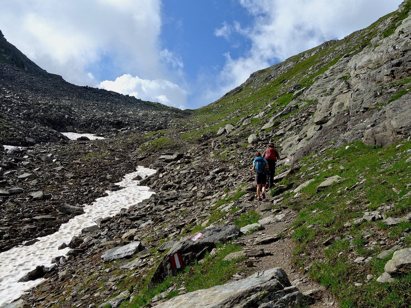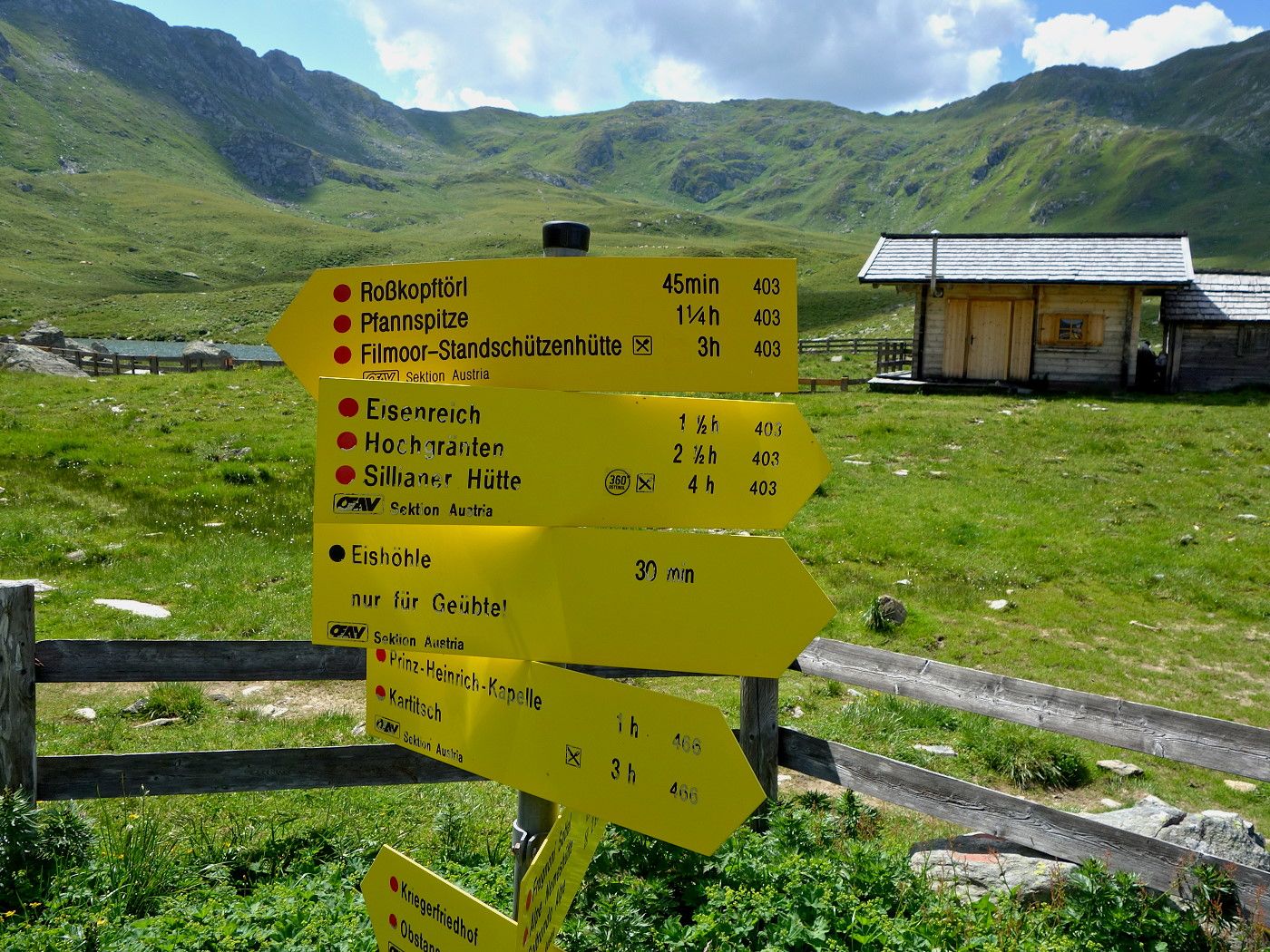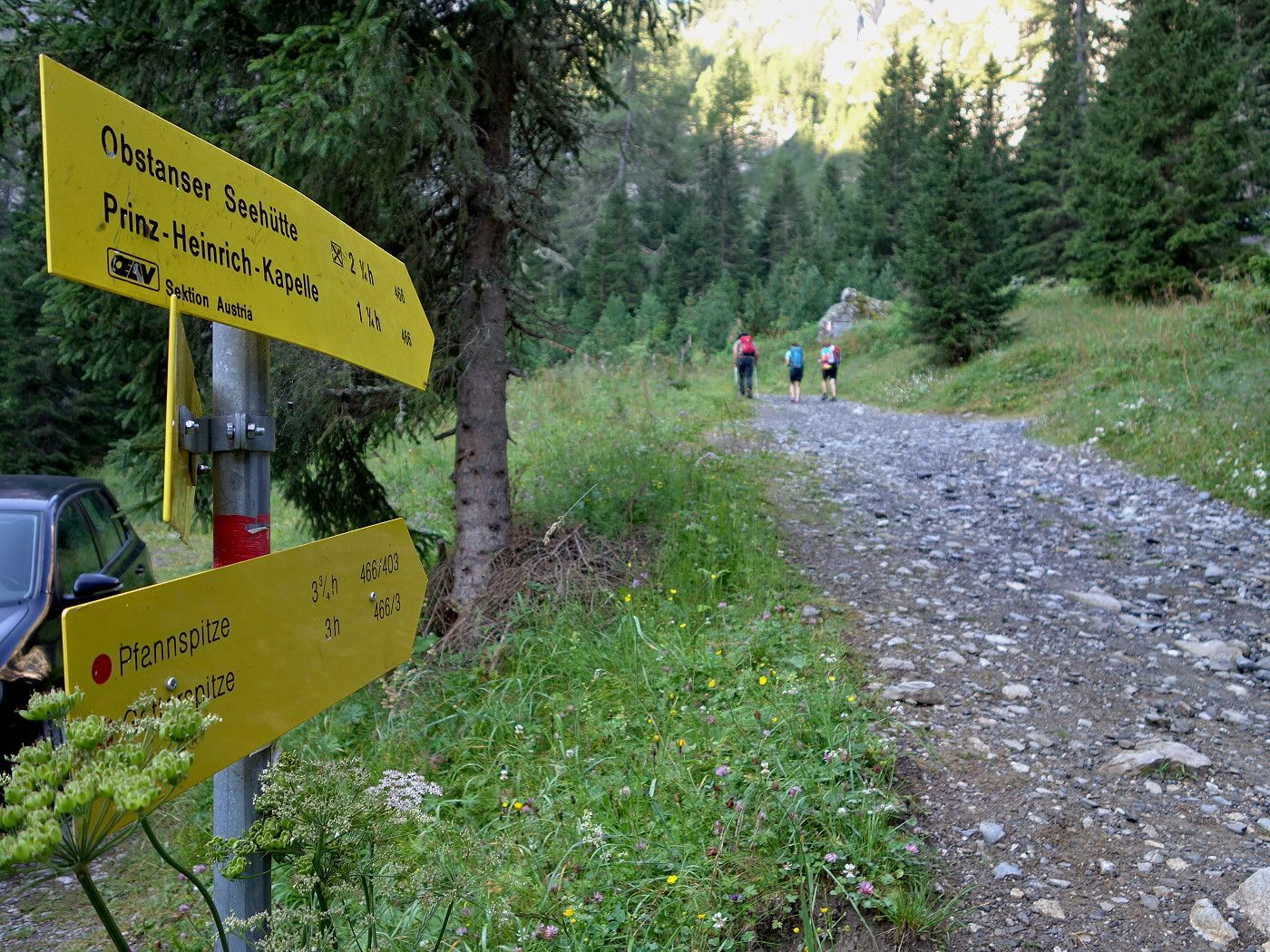 Vom kleinen Parkplatz (1550m) im Talschluss des Winklertals leitet uns der Wegweiser „Obstanser Seehütte/Pfannspitze Nr 466/403“ in ein Weglein, das uns schnell weiter nach oben bringt. Ein in den Fels gesprengter Bergweg bringt uns die Felsstufe über unzählige Holzstufen und einigen Serpentinen hoch in den weiten grünen Obstanser Boden (1962m), an dessen Beginn sich unter anderen die Prinz-Heinrich-Kapelle und eine Unterstandshütte befinden. Nun flach südostwärts vorbei an einigen kleinen Hütten direkt auf die vom Roßskopf herabfallenden Geröllfelder zu. Durch diese leitet uns der Steig weiter hoch bis zur Obstanser Seehütte (2304m) mit dem wunderschönen Obstanser See. Zur Pfannspitze zweigen wir bei der Schutzhütte linkerhand ab und folgen dem Steig Nr 403 zunächst in östlicher, dann südlicher Richtung ohne nennenswerte Schwierigkeiten hoch zum Karnischen Kamm (2585m). Hier betritt man den vom Tourenziel herunterführenden Südwestgrat, der nochmals Trittsicherheit und an einer kurzen Passage auch Schwindelfreiheit erfordert, ehe man den Gipfel der Pfannspitze (2678m) erreicht.