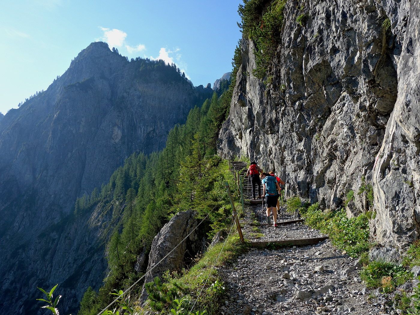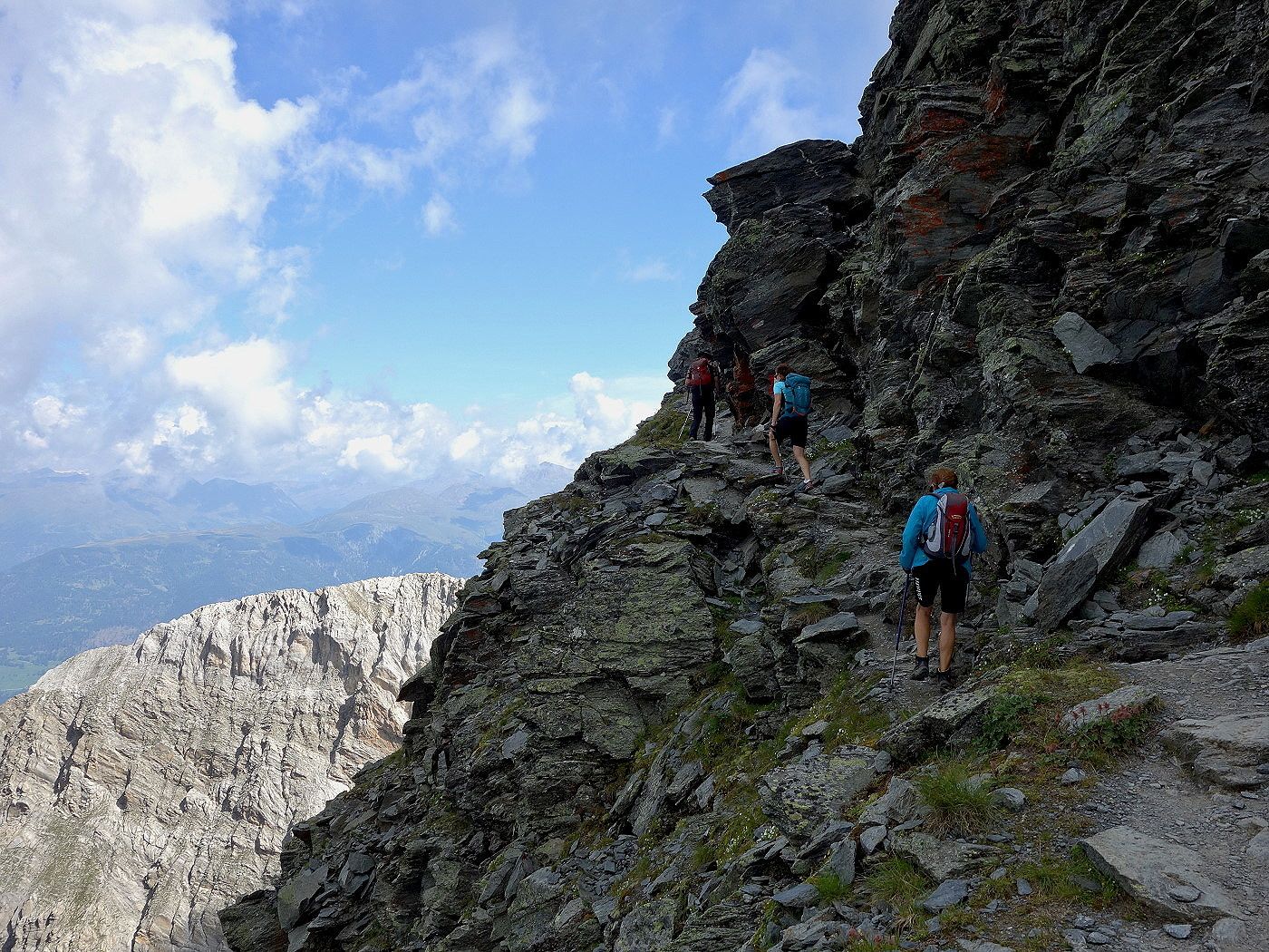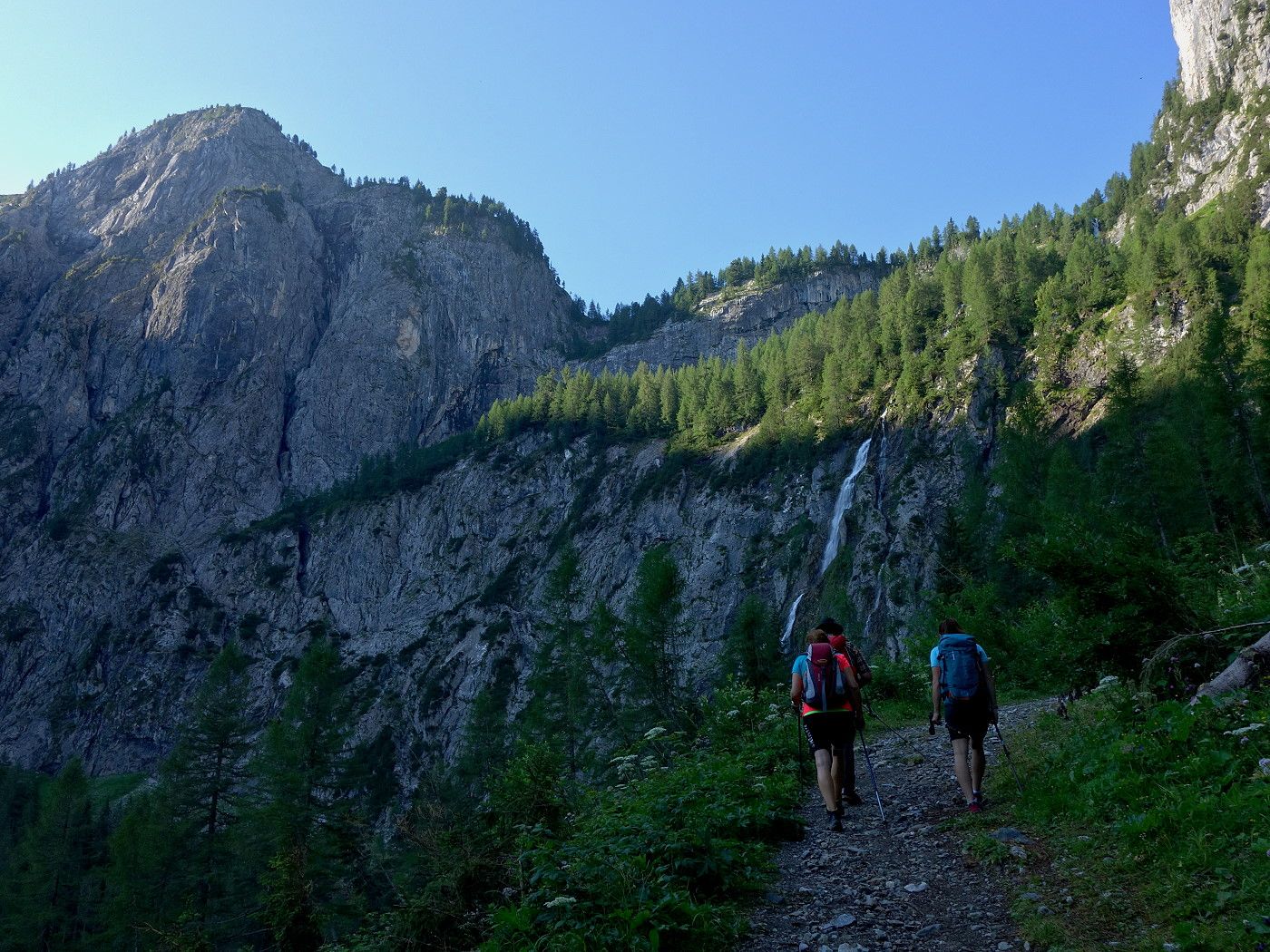 Vom kleinen Parkplatz (1550m) im Talschluss des Winklertals leitet uns der Wegweiser „Obstanser Seehütte/Pfannspitze Nr 466/403“ in ein Weglein, das uns schnell weiter nach oben bringt. Ein in den Fels gesprengter Bergweg bringt uns die Felsstufe über unzählige Holzstufen und einigen Serpentinen hoch in den weiten grünen Obstanser Boden (1962m), an dessen Beginn sich unter anderen die Prinz-Heinrich-Kapelle und eine Unterstandshütte befinden. Nun flach südostwärts vorbei an einigen kleinen Hütten direkt auf die vom Roßskopf herabfallenden Geröllfelder zu. Durch diese leitet uns der Steig weiter hoch bis zur Obstanser Seehütte (2304m) mit dem wunderschönen Obstanser See. Zur Pfannspitze zweigen wir bei der Schutzhütte linkerhand ab und folgen dem Steig Nr 403 zunächst in östlicher, dann südlicher Richtung ohne nennenswerte Schwierigkeiten hoch zum Karnischen Kamm (2585m). Hier betritt man den vom Tourenziel herunterführenden Südwestgrat, der nochmals Trittsicherheit und an einer kurzen Passage auch Schwindelfreiheit erfordert, ehe man den Gipfel der Pfannspitze (2678m) erreicht.