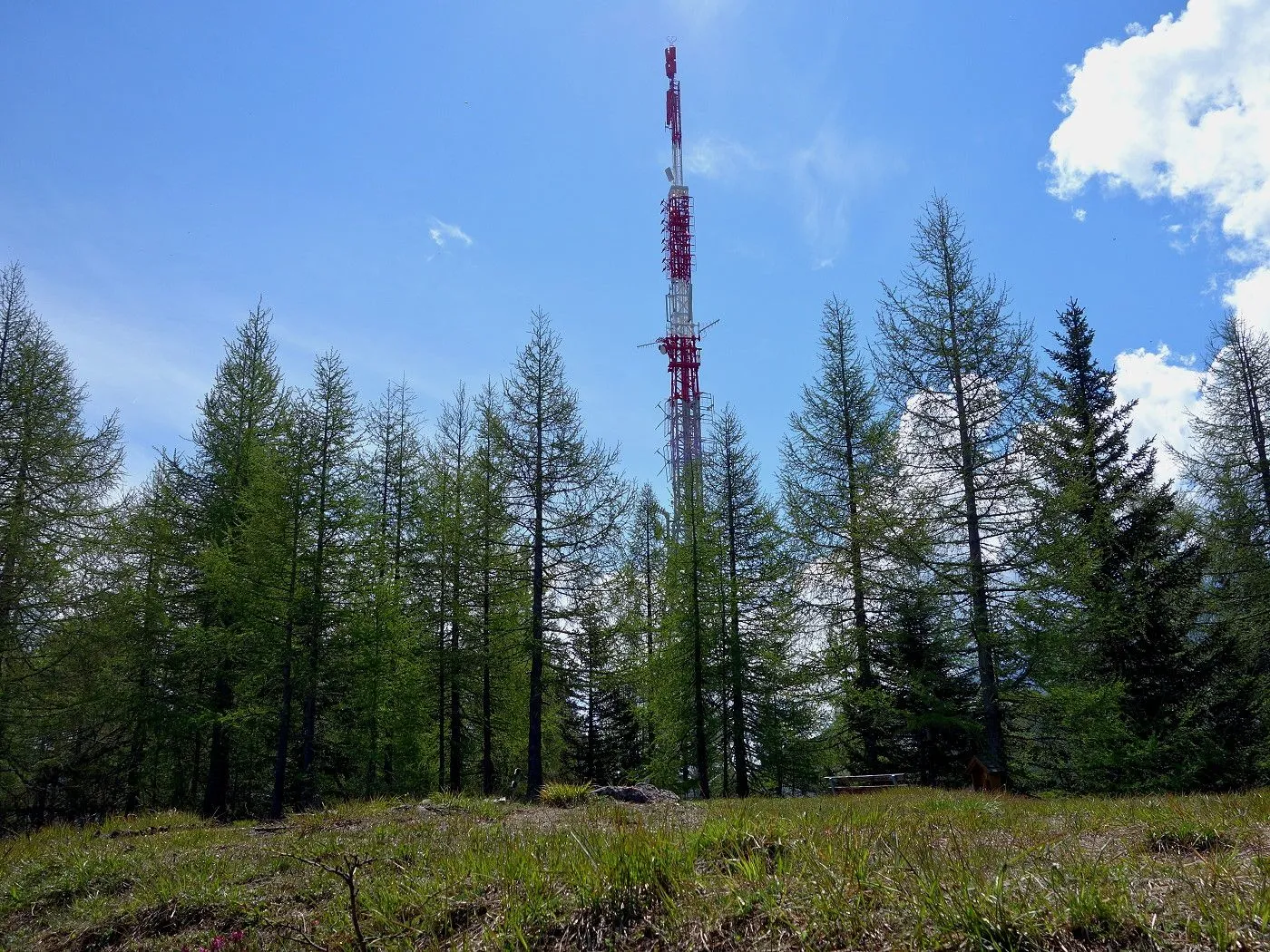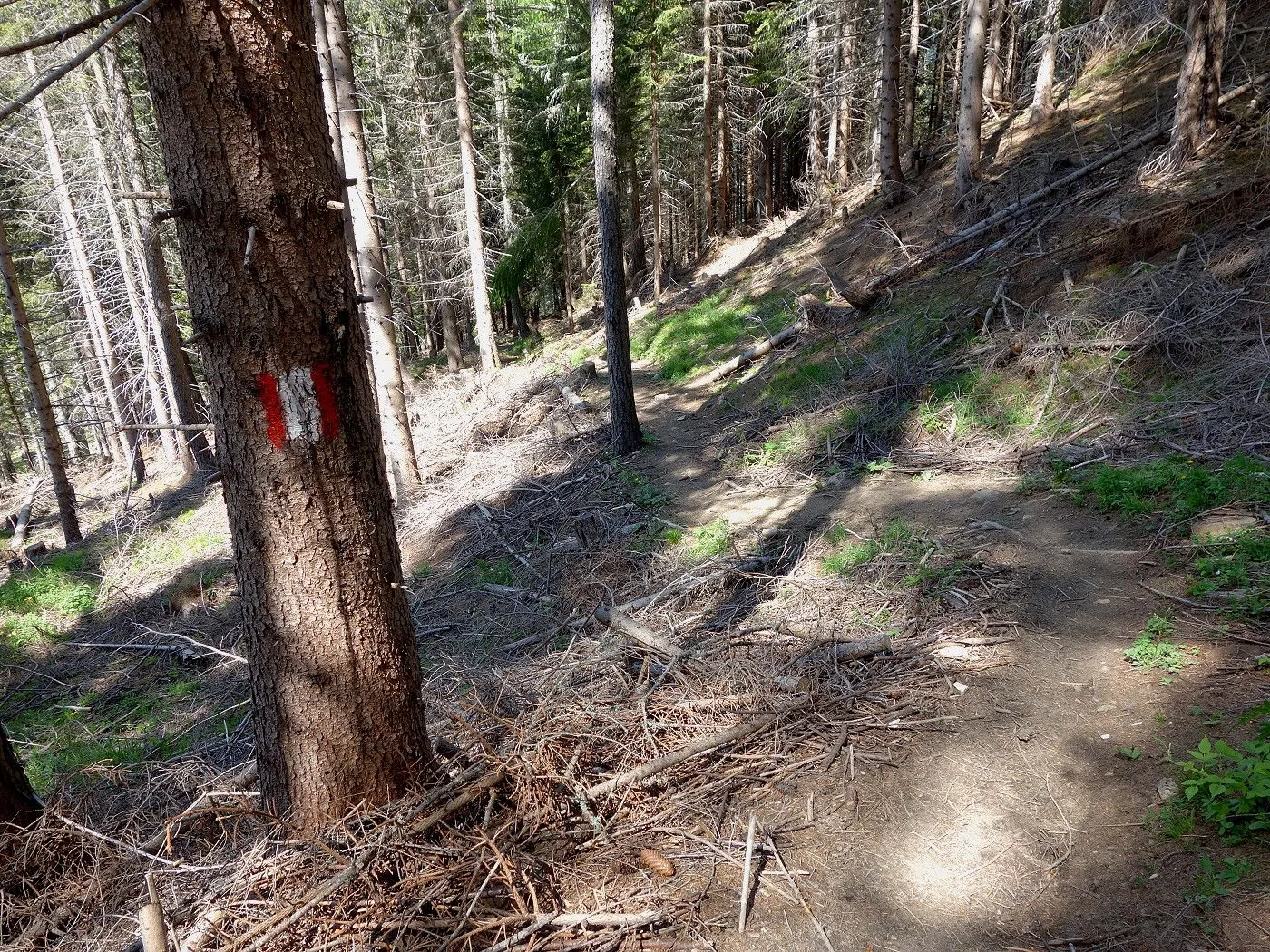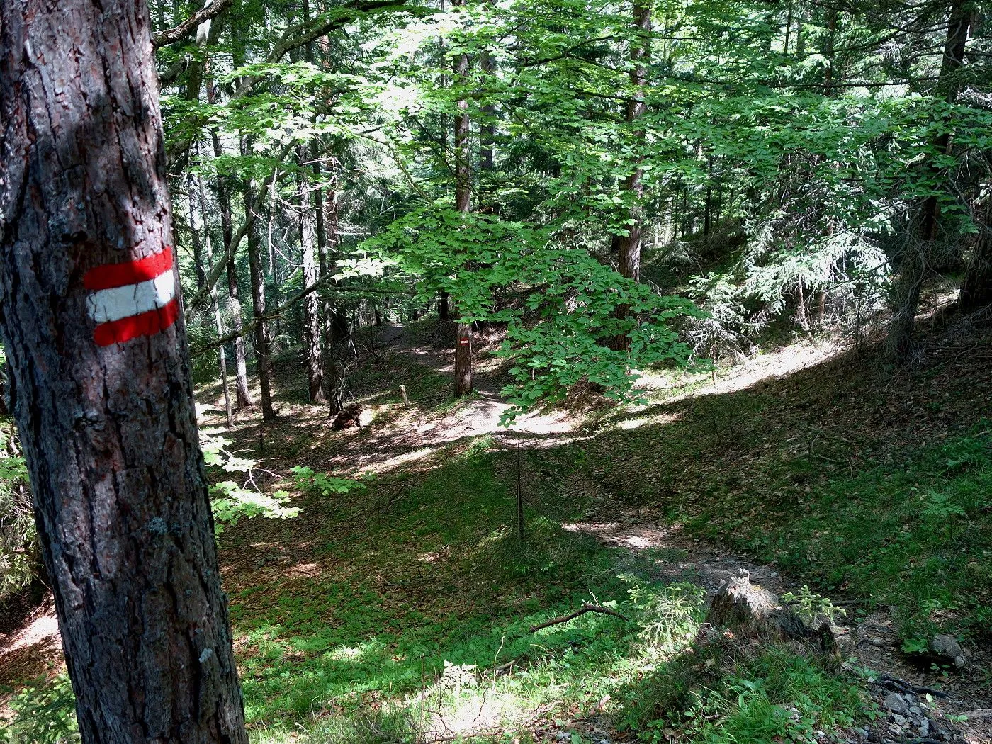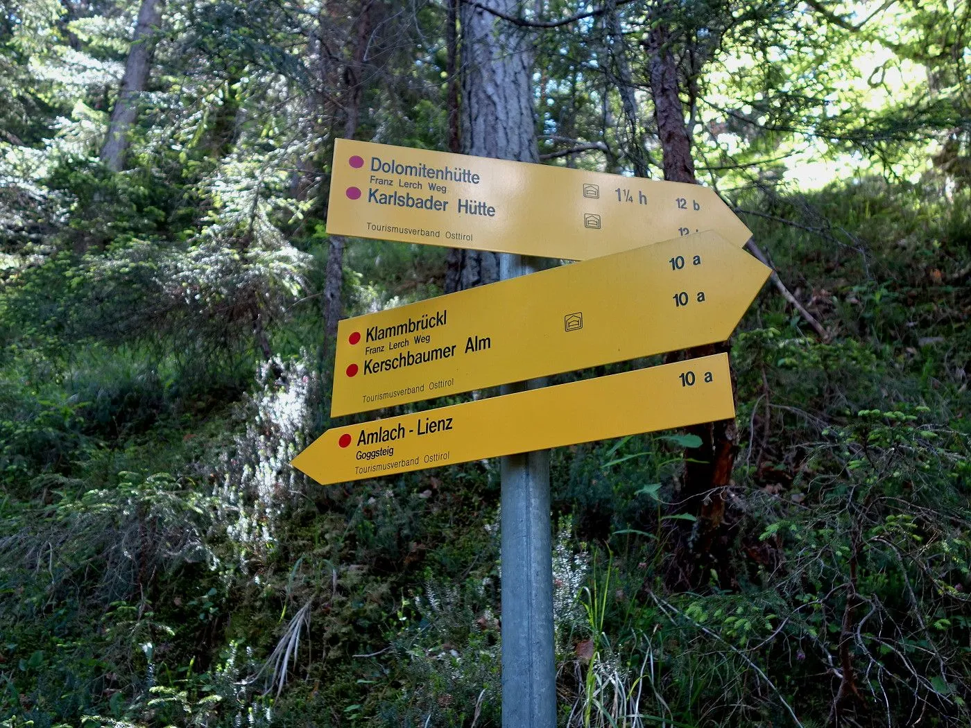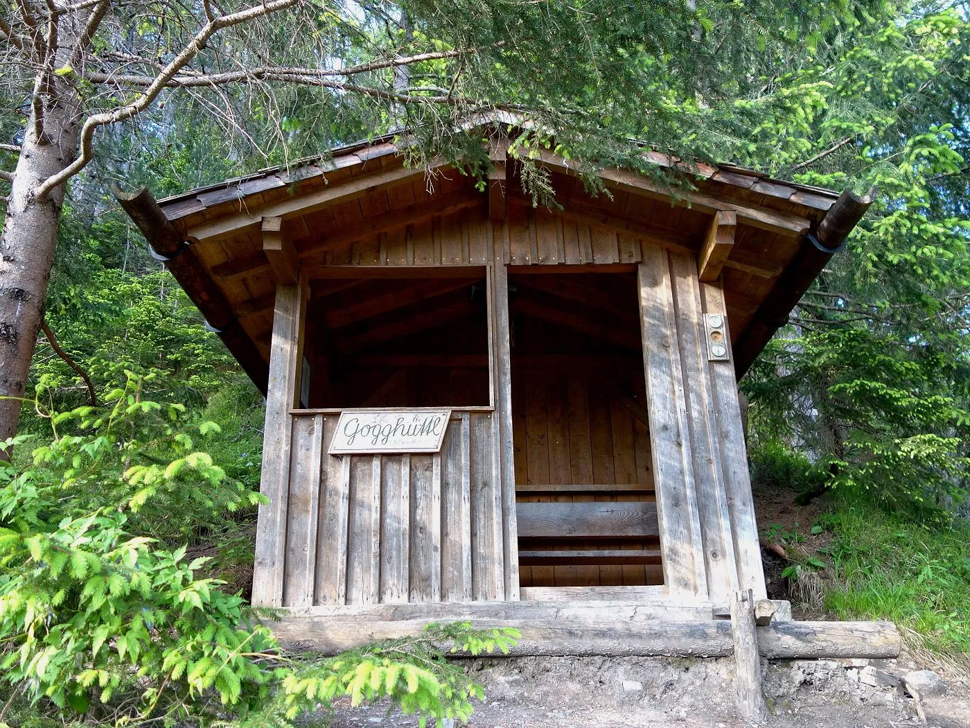 Zuerst ein kurzes Stück Richtung Osten, am Sendemasten vorbei, bis uns ein Hinweisschild den Abstieg Richtung Dolomitenhütte weist. Recht schnell an Höhe verlierend, erreicht man bald schön gelegene Almböden, wo sich auch die Talstation der Materialseilbahn (1580m) befindet. An dieser vorbei entlang eines Schotterweges bis zur Wiesenhütte (1560m). Dort weist uns erneut ein Wegweiser den weiteren Abstieg über einen Steig durch bewaldetes Gebiet. Auf Höhe 1120m stößt man auf einen schmalen Weg, dem man rechts, am Blasbründl vorbei, bis zum Gogghüttl (1060m) folgt. Von dort wie beim Aufstieg über den Goggsteig abwärts bis zum Ausgangspunkt (700m).