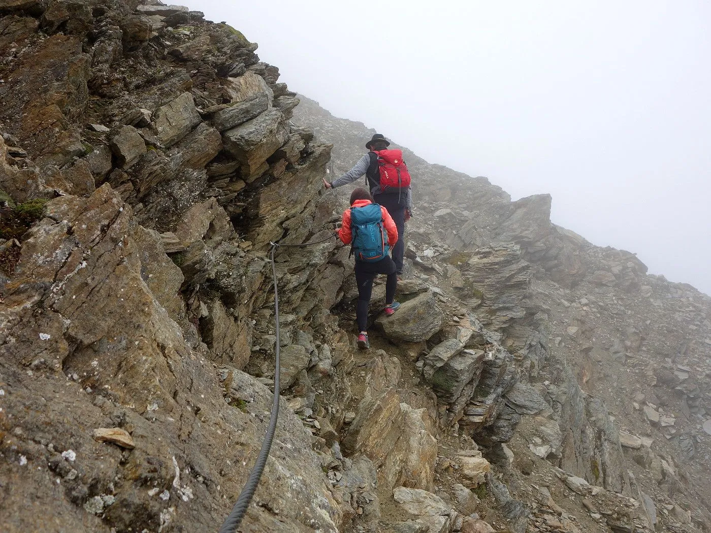 Schlüsselstelle: Der Grat ist mit Stahlseilen versichert, dennoch erfordert der Abschnitt am Schuttkar und Grat besondere Vorsicht. Bei Nässe und Schnee wird der Anstieg deutlich anspruchsvoller. |