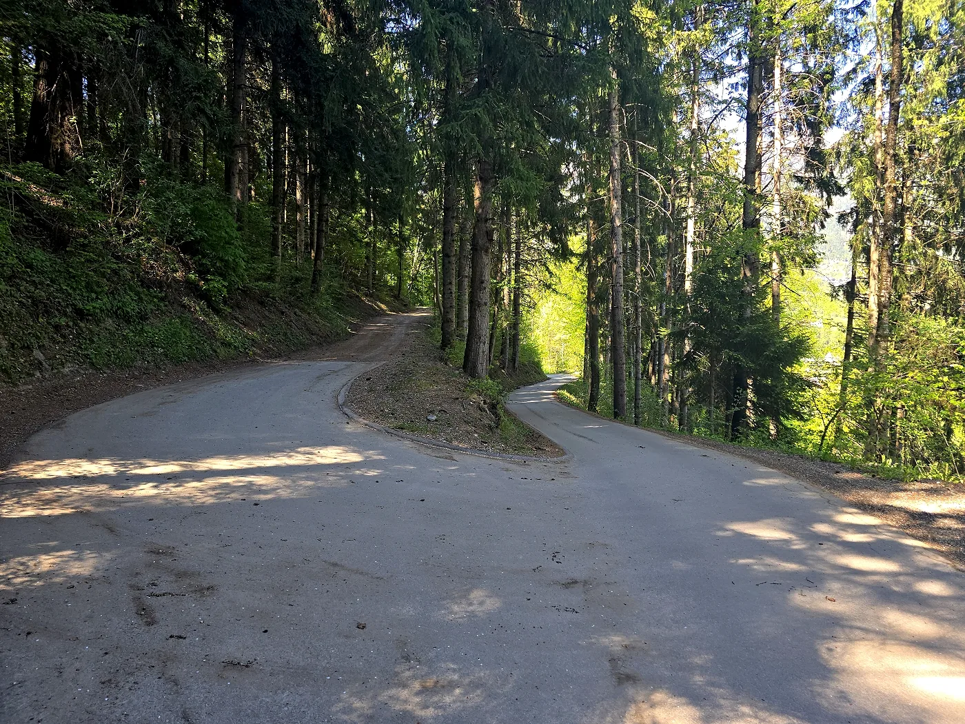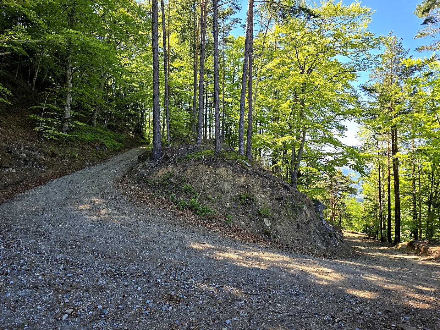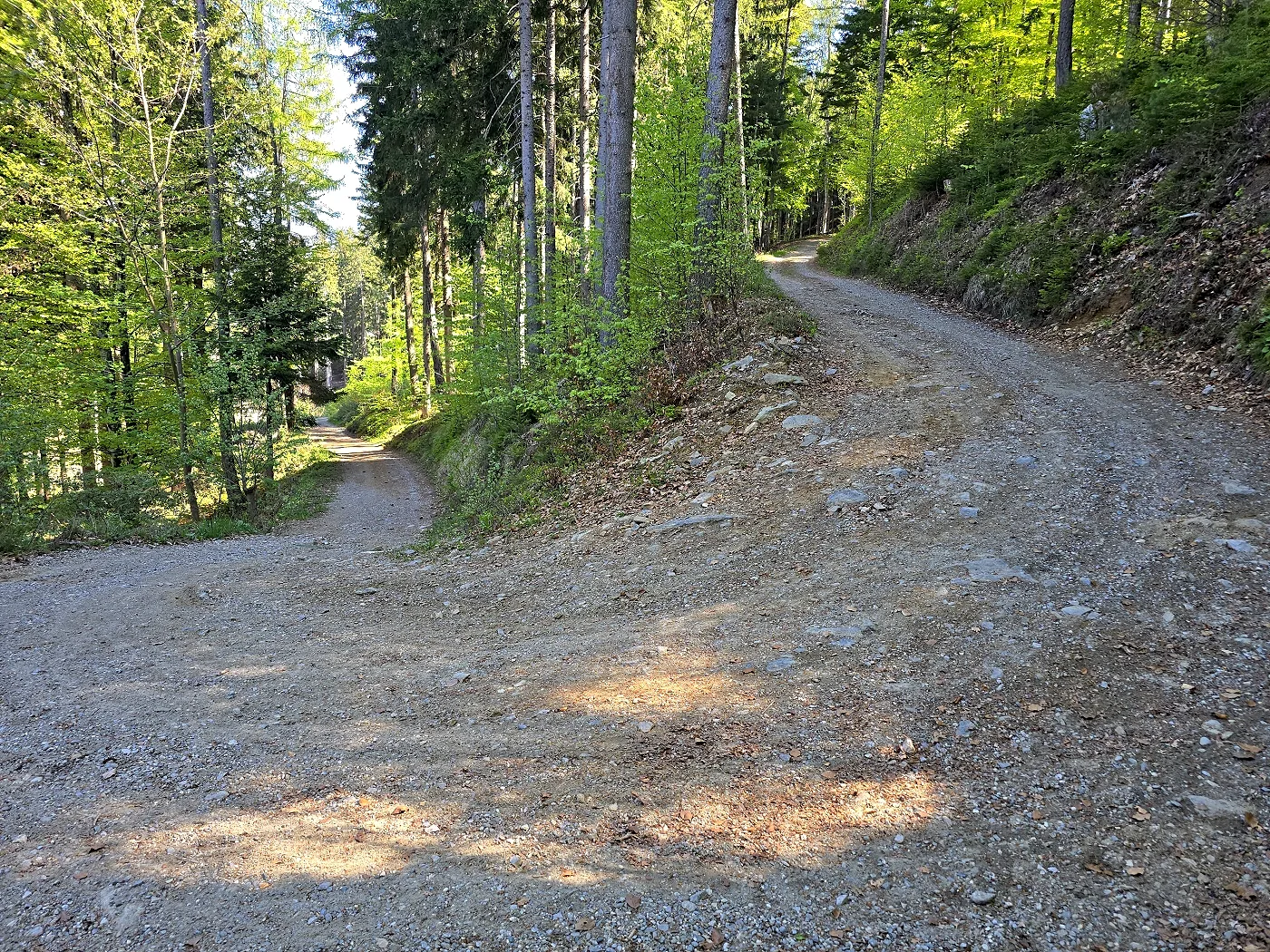Hinter den Häusern betreten wir einen Waldweg, dem wir unkompliziert in den Bereich der Moosalm folgen. Bei einer markanten Weggabelung (1000m) marschieren wir geradeaus am Waldrand entlang hoch bis zu unserem Tourenziel, dem Speicherteich Taxermoos (1062m).