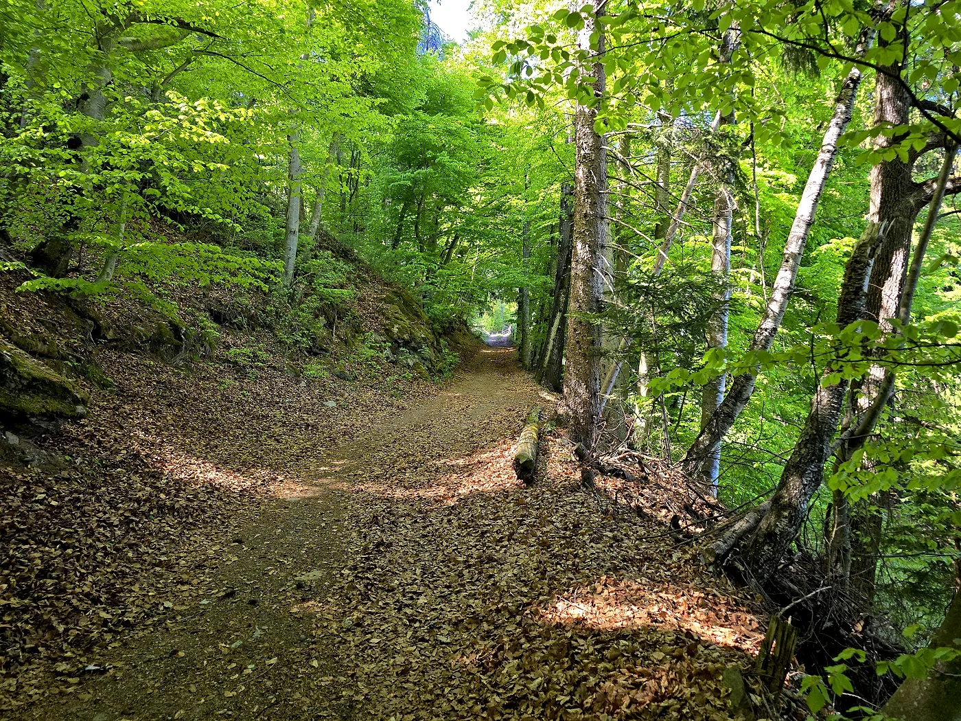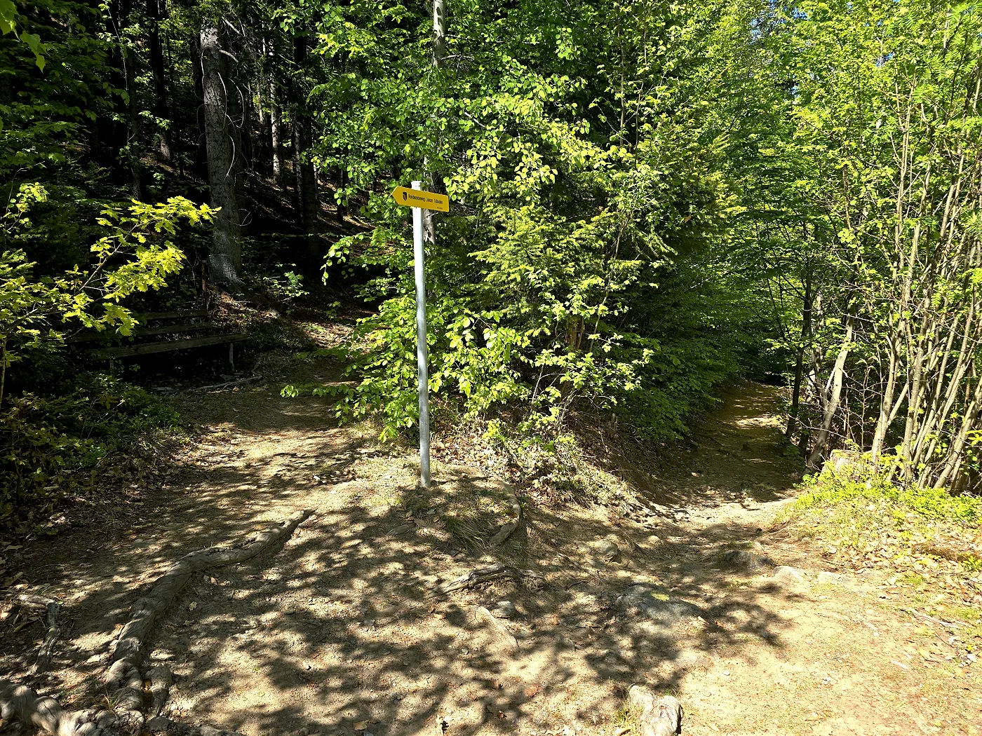 Wegbeschaffenheit: Wechsel zwischen breiten Wanderwegen, Lehrpfad-Stationen und wurzeligen Waldsteigen im Abstieg. |
