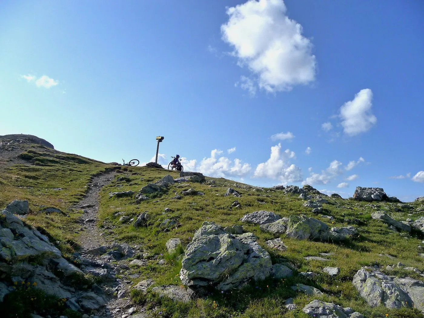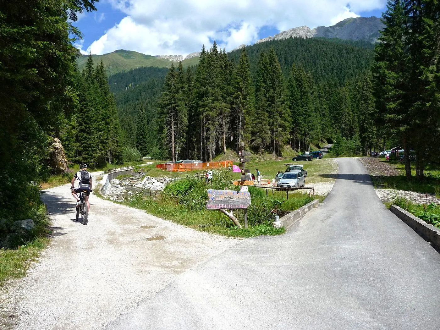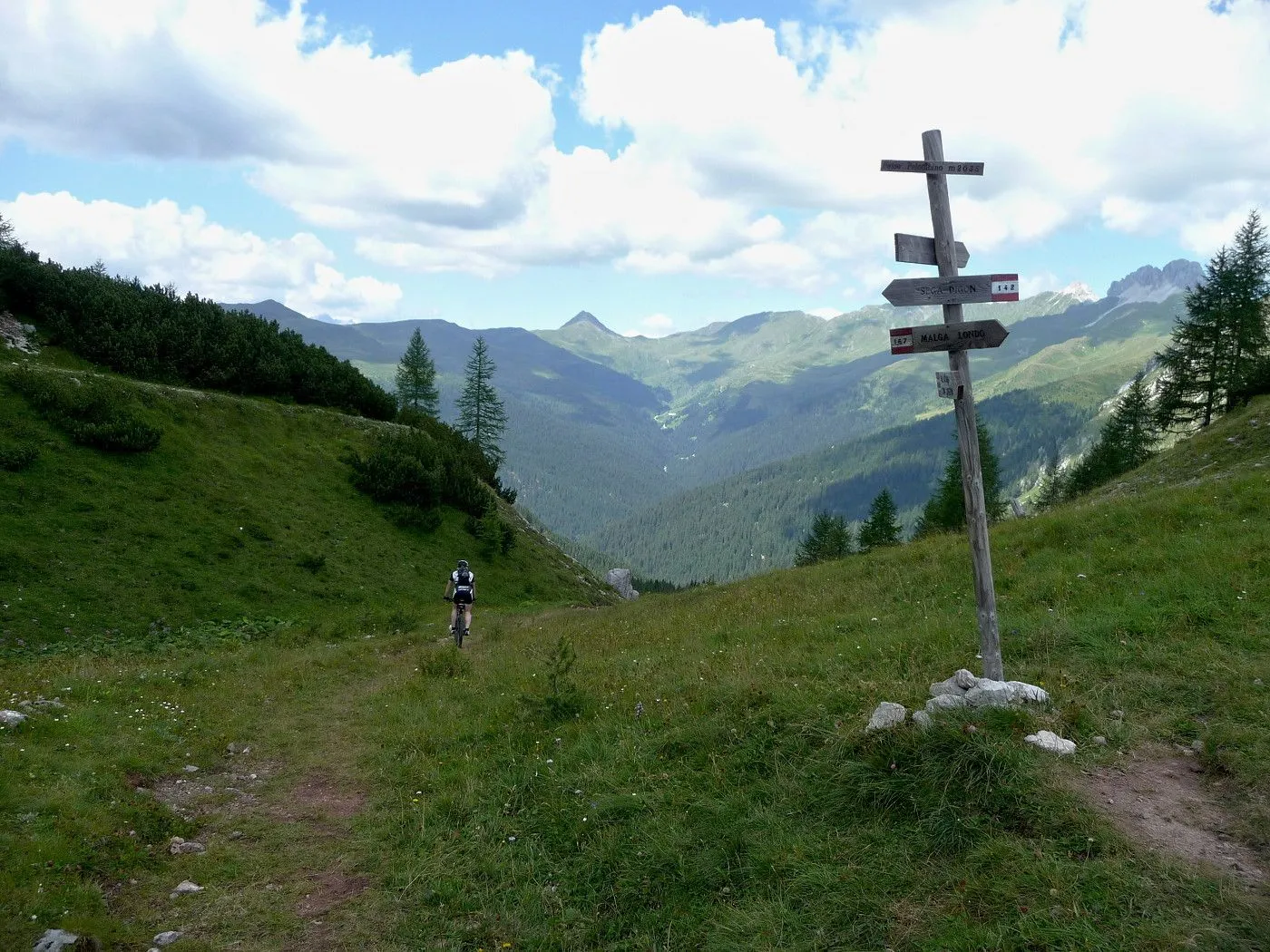 Von Lienz (680m) über den Radweg bis Tassenbach. Von Tassenbach auf der Landesstraße hoch zum Kartitscher Sattel (1540m) und dann hinab bis zum Biathlonzentrum (1370m) bei Obertilliach. Dort beginnt der Schotterweg, der durchwegs in einem sehr guten Zustand und somit einfach zu befahren ist. Richtung Süden diesem Weg folgend, erreicht man unschwierig die Porzehütte (1942m). Diese fährt man nicht an, sondern folgt einem Karrenweg Richtung Tillacher Joch. Dieser Weg ist anfangs noch gut zu befahren, bis man zur Schiebepassage gelangt. Diese ist aber recht kurz und man erreicht schlussendlich das Tilliacher Joch (2094m). Von dort schiebt man das Rad noch ein kurzes Stück hoch Richtung Porze, bis man Forcella Dignas (2115m) erreicht. Vorbei an Kriegsstellungen fährt man nun über eine alte Militärstraße abwärts. Vor allem im oberen Bereich ist diese Straße extrem steinig und hohe Konzentration ist gefordert. Erst ab Malga Dignas wird die Straße deutlich besser und ist sogar teilweise asphaltiert. Bei Bivio Ciadon (1466m) ist der tiefste Punkt erreicht und von dort geht es wieder aufwärts. Die Straße ist anfangs noch sehr gut, aber mit ein paar recht steilen Passagen recht fordernd. Ab der Malga Londo wird der Weg aber deutlich schlechter. Anfangs noch befahrbar, geht der Weg später nur noch in einen Steig über. Spätestens dort muss man das Bike schieben. Beschwerlich erreicht man schlussendlich den Passo Palombino (2035m), von wo man bereits den nächsten, schweren Touranstieg (den Kniebergsattel) sehen kann. Zunächst führt uns ein steil abfallender Steig abwärts, der dann später in einen recht gut befahrbaren Weg übergeht. Vorbei an der Malga Melin fährt man über eine gute Straße weiter bis man zu einer markanten Wegkreuzung (1460m) gelangt. Von dort fährt man durch das Val Digon Richtung Casera Silvella. Diese erreicht man schließlich über eine sehr gute Schotterstraße. Nun wird der Weg deutlich ruppiger. Trotzdem ist er immer befahrbar und nach beschwerlichen Höhenmetern erreicht man schließlich den Passo Silvella (Kniebergsattel) (2329m). Bis dorthin hat man bereits knapp 3000 Höhenmeter im Aufstieg überwunden! Vom Passo Silvella führt ein recht steiniger Trail abwärts, der später in einen sehr guten Weg übergeht. Über diesen erreicht man die Alpe-Nemes-Hütte (1877m). Nach kurzer Stärkung zunächst abwärts zu einer Weggabelung (1770m), wo man rechts hoch zur Klammbachalm (1944m) fährt. Dieser Weg ist zwar recht steil, aber sehr gut befahrbar. Ab der Klammbachalm wird der Weg extrem schwierig. Durch Grasbewuchs und dem steinigen Untergrund können sich nur geübte Biker im Sattel halten. Spätesten auf einer Höhe von 2300m muss man das Bike schieben bzw. tragen. Unterhalb der Hollbrucker Spitze vorbei auf einen Sattel (2500m), wo man auf den Karnischen Höhenweg stößt. Nun hat man das Tourdach dieser Mountainbiketour erreicht und insgesamt 3750Hm in den Beinen! Von dort folgt man in westlicher Richtung dem schmalen, aber durchwegs befahrbaren Steig bis zur Sillianer Hütte (2450m). Weiter über einen steilen Weg hinunter zur Leckfeldhütte (1918m), der durch groben Untergrund gekennzeichnet ist. Daher ist vor allem bis dorthin nochmals hohe Konzentration gefordert. Danach über eine sehr gut befahrbare Forststraße hinunter bis nach Sillian (1103m) und von dort über den Radweg zurück nach Lienz (675m).