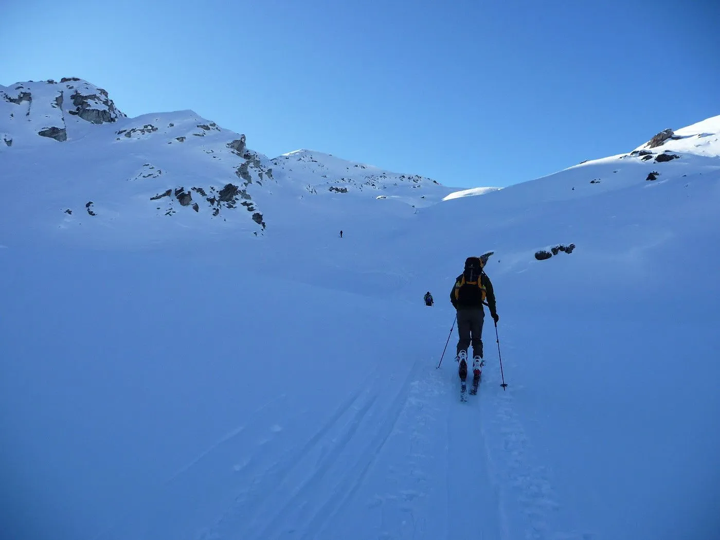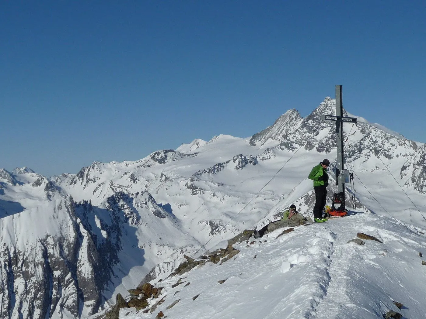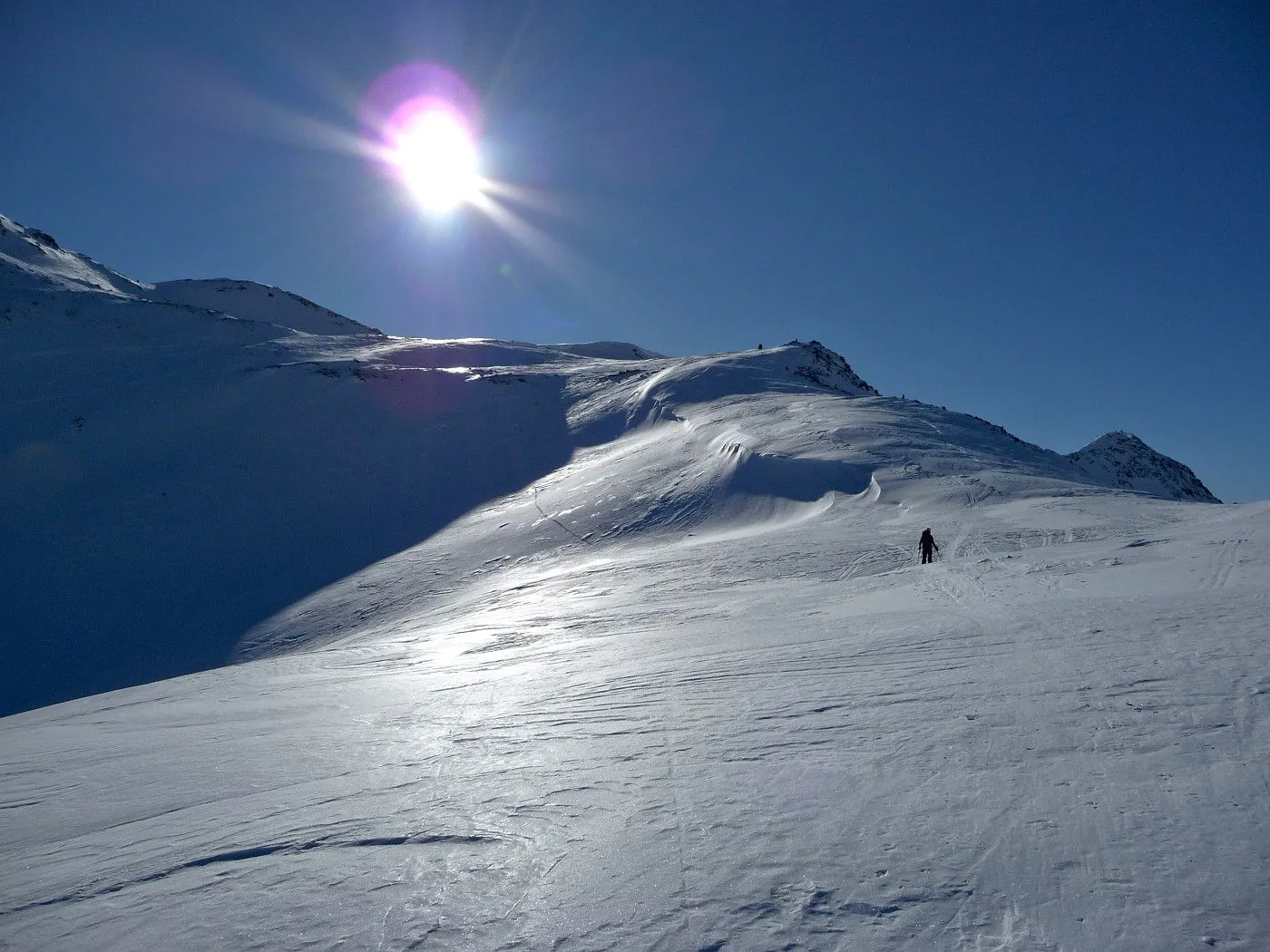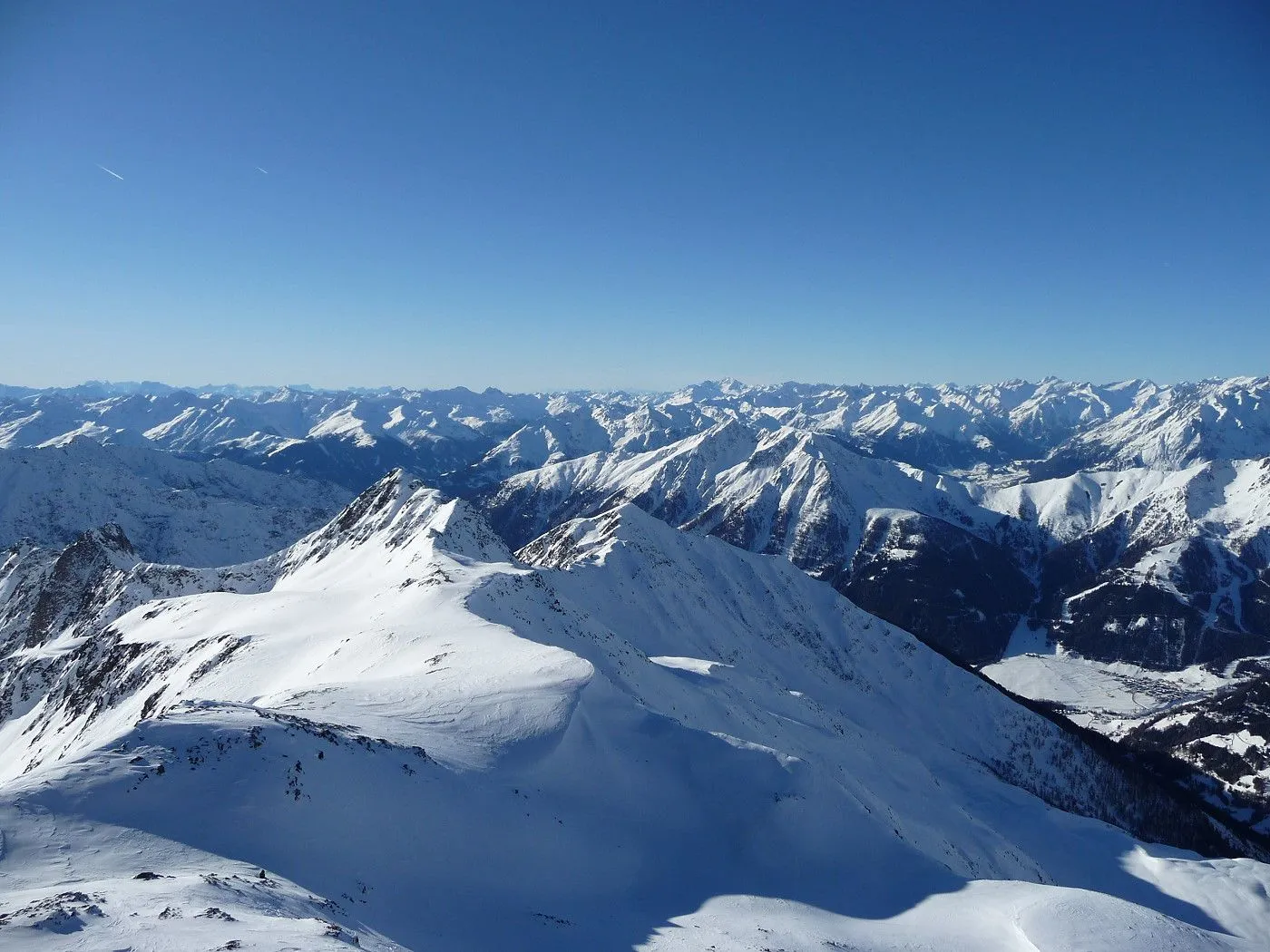 Variante 2: 1800Hm und ca. 10km Abfahrt!! Die Abfahrt ist an Länge und Schönheit kaum zu überbieten. Allerdings ist ein 2 PKW notwendig, da man von Unterlesach bzw. Oberlesach wieder zum Ausgangsort gelangen muss. Zuerst über den letzten Steilhang zum Tschadinsattel (2993m). Nun immer linkshaltend über schöne Mulden bis zum P. 2543 der ÖK. Die folgende Steilstufe (Achtung unten Felsabbrüche) wieder linkshaltend abfahren und über einen Graben weiter in den Talboden bis zu den Hütten der Lesachalm (1818m). Sehr gute Schifahrer können entlang des Sommersteigs, dem Bachbett folgend, bis Unterlesach (1320m) weiter abfahren. Diese Variante ist allerdings ziemlich schwierig und man benötigt noch genügend Kraft in den Beinen! Außerdem muss man im Frühjahr auf genügend Schneelage und am Nachmittag auf die erhöhte Lawinengefahr achten! Die andere Variante führt ab der Lesachalm entlang der Zufahrtsstraße bergauf bis zu einer Weggabelung (1880m) und von da an bergab über die Straße bis Oberlesach (1415m).