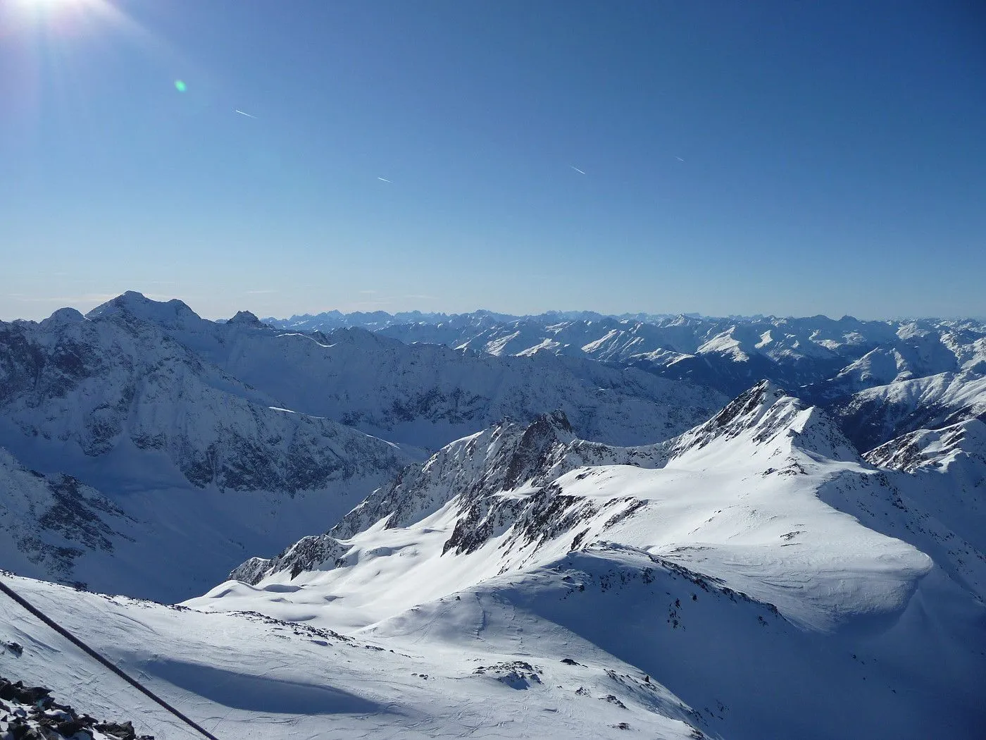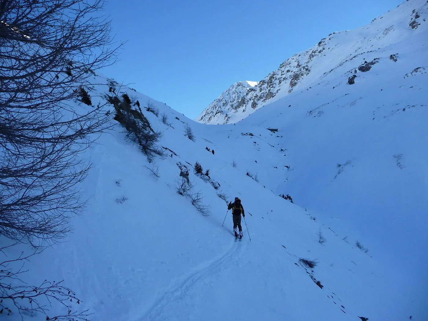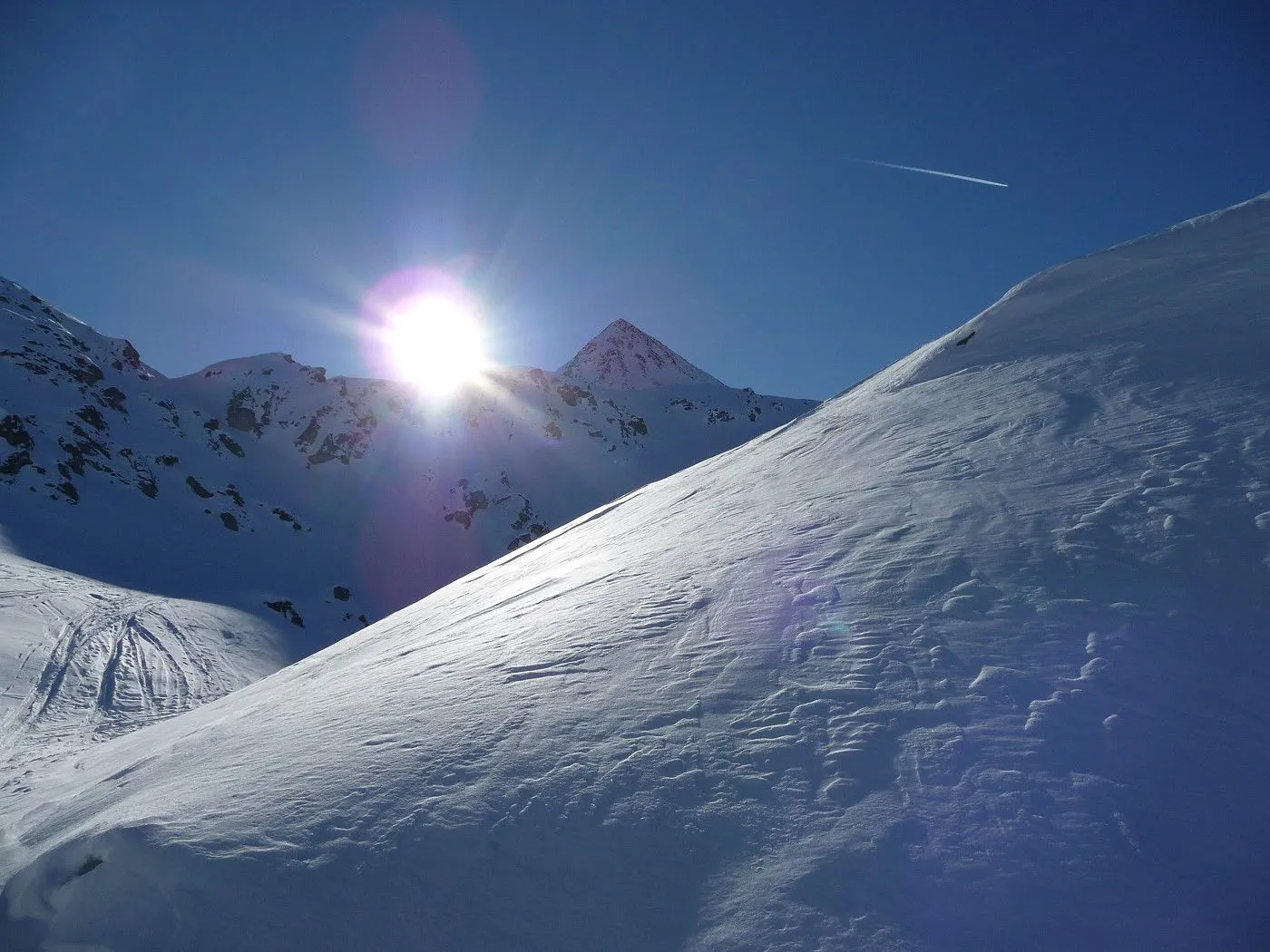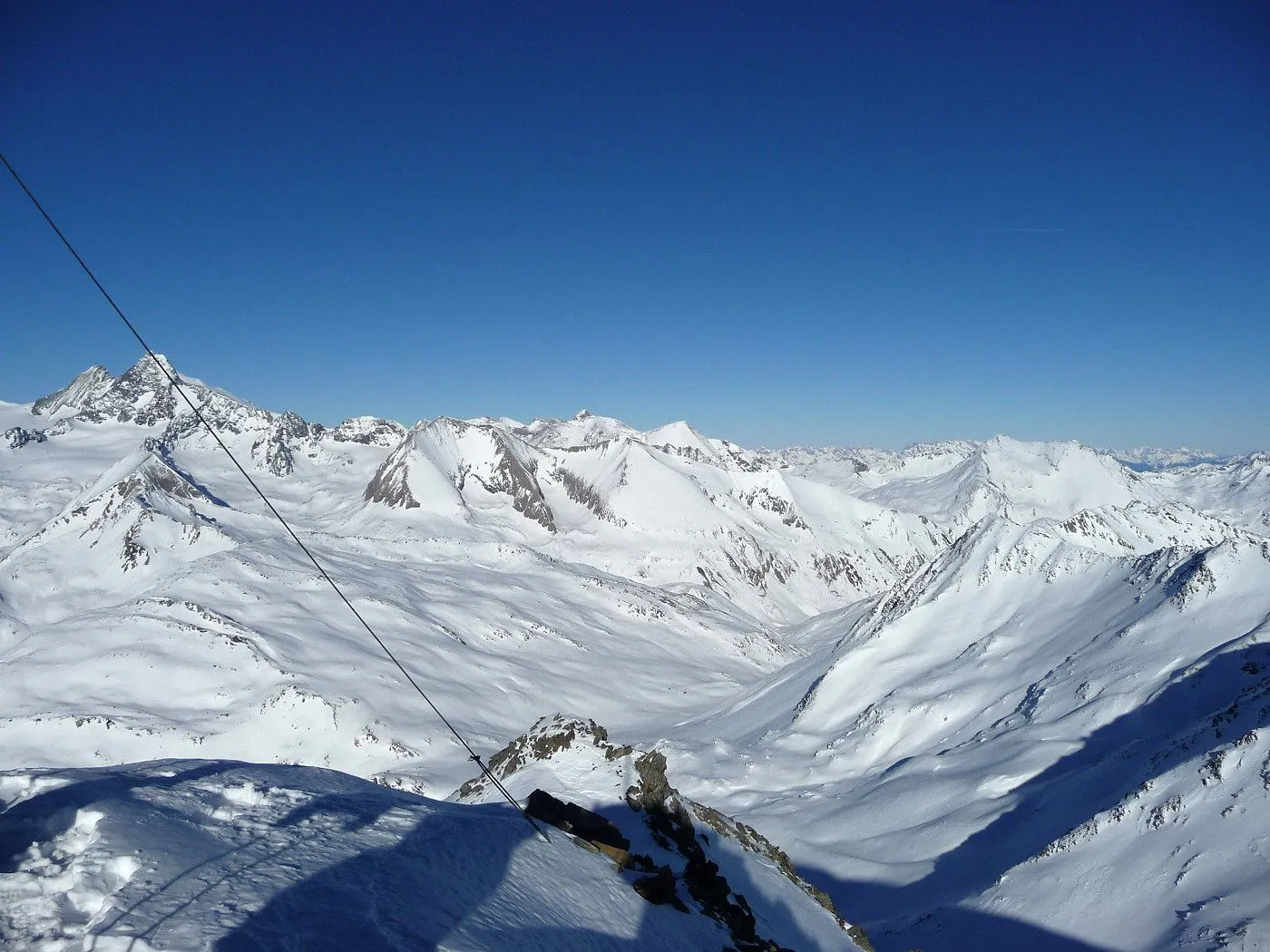 Variante 2: 1800Hm und ca. 10km Abfahrt!! Die Abfahrt ist an Länge und Schönheit kaum zu überbieten. Allerdings ist ein 2 PKW notwendig, da man von Unterlesach bzw. Oberlesach wieder zum Ausgangsort gelangen muss. Zuerst über den letzten Steilhang zum Tschadinsattel (2993m). Nun immer linkshaltend über schöne Mulden bis zum P. 2543 der ÖK. Die folgende Steilstufe (Achtung unten Felsabbrüche) wieder linkshaltend abfahren und über einen Graben weiter in den Talboden bis zu den Hütten der Lesachalm (1818m). Sehr gute Schifahrer können entlang des Sommersteigs, dem Bachbett folgend, bis Unterlesach (1320m) weiter abfahren. Diese Variante ist allerdings ziemlich schwierig und man benötigt noch genügend Kraft in den Beinen! Außerdem muss man im Frühjahr auf genügend Schneelage und am Nachmittag auf die erhöhte Lawinengefahr achten! Die andere Variante führt ab der Lesachalm entlang der Zufahrtsstraße bergauf bis zu einer Weggabelung (1880m) und von da an bergab über die Straße bis Oberlesach (1415m).