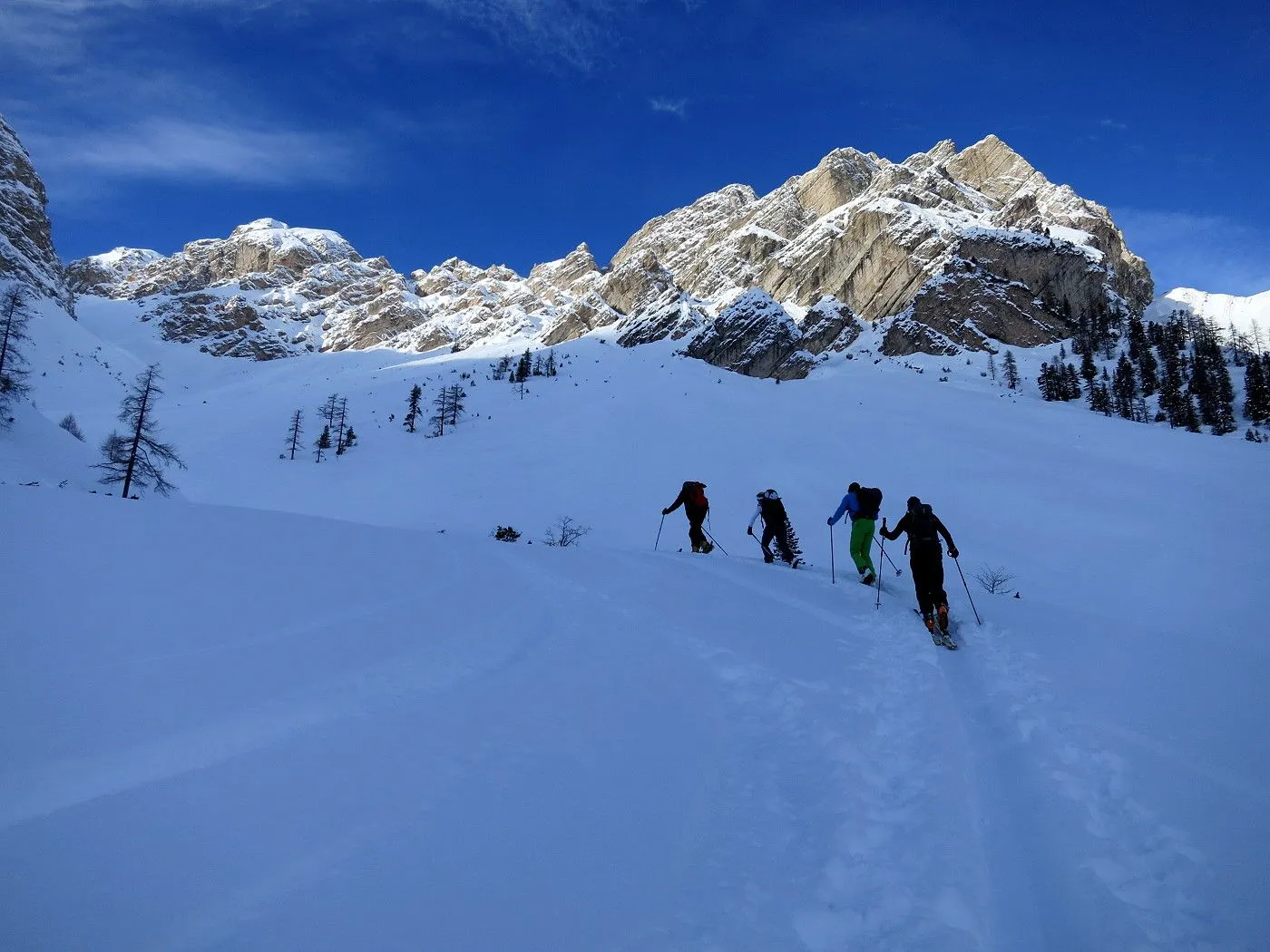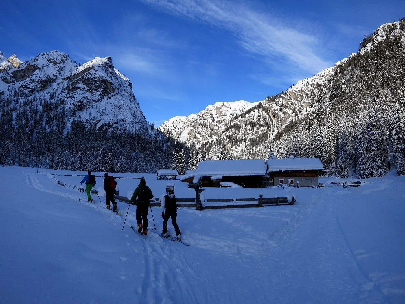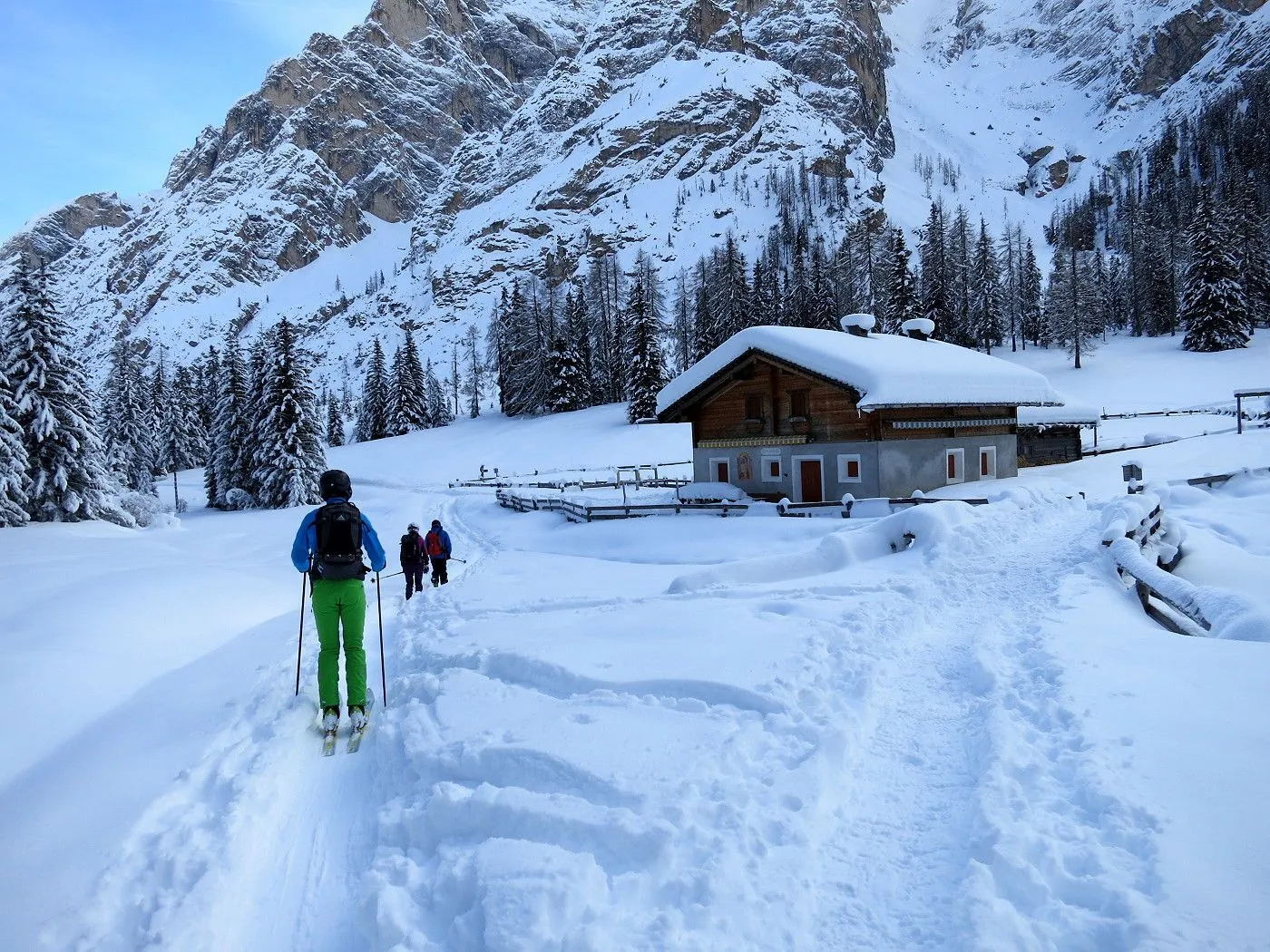 Die Skitour auf den Col di Riciogogn gehört zu den schönsten Touren in den Pragser Dolomiten. Technisch ist die Tour recht einfach und nur wenige etwas anspruchsvollere Passagen sind zu überwinden. Allerdings sind am Gipfelgrat Harscheisen sehr ratsam, da dieser sehr steil ist und bei ungünstigen Bedingungen Abrutschgefahr besteht! Vom Gipfel hat man einen wunderschönen Blick auf den Naturpark Fanes-Sennes und die rundumliegende Bergwelt. Die Abfahrt durch das Lärchental bzw. Grünwaldtal bietet sehr schöne Hänge, die man allerdings nur bei sehr sicheren Bedingungen befahren kann! Auch bei der heutigen Tour waren einige Lawinenabbruchstellen zu sehen! Von der Alten Kaser bis zum Ausgangspunkt sollte man einen gut gewachsten Ski haben, da das Gelände ziemlich flach wird. Auch die letzten Meter entlang des Pragser Wildsees sind nur mit Stockeinsatz und Skatingschritt zu überwinden! Daher ist diese Skitour erst am Auto wirklich zu ende und man sollte bis zum Schluss noch über genügend Kraftreserven verfügen! Erwähnenswert ist auch, dass vor allem bei der Abfahrt durch das Grünwaldtal auf die zahlreichen Schneeschuhwanderer zu achten ist und man mit der notwendigen Aufmerksamkeit abfahren sollte!