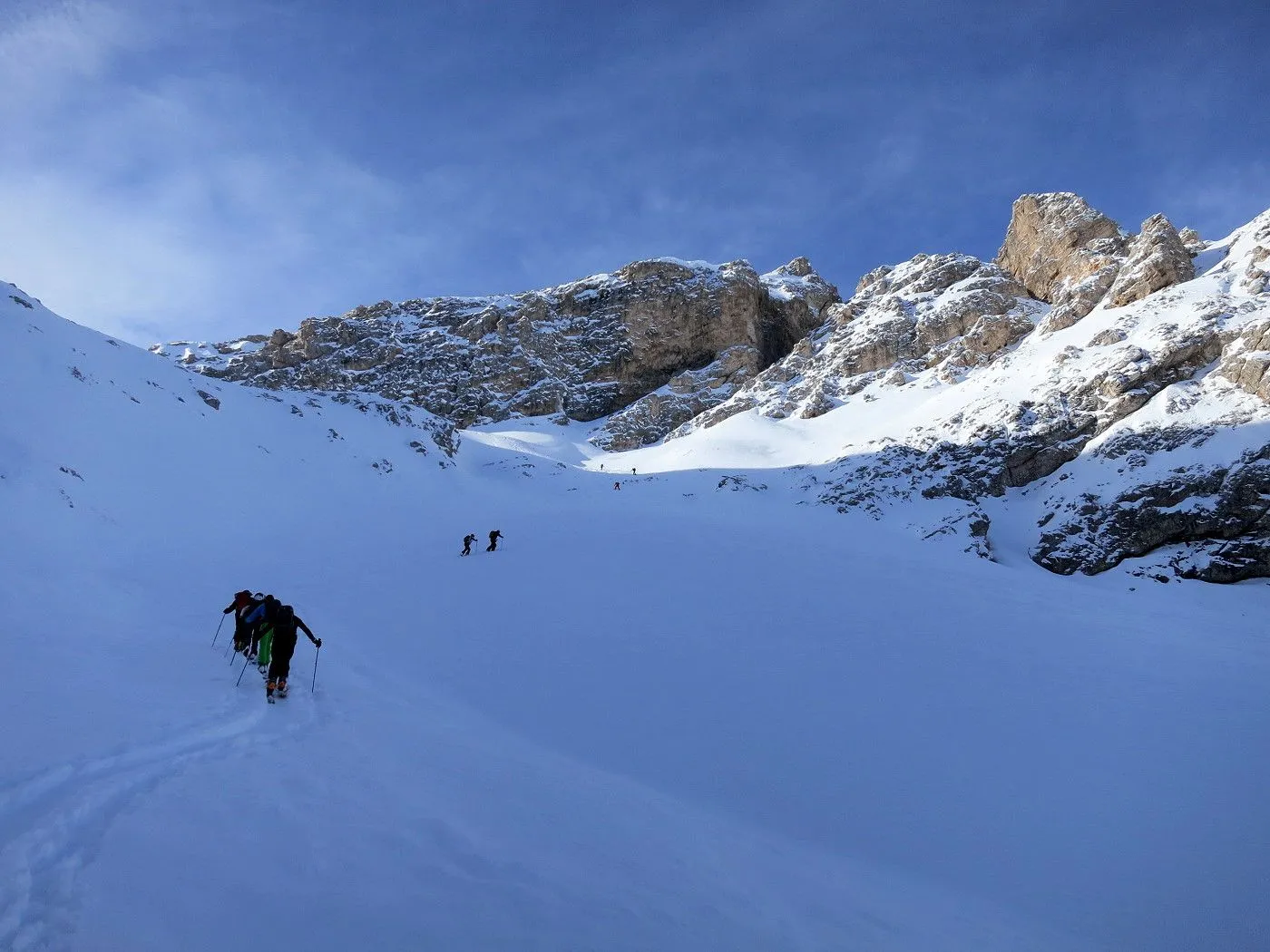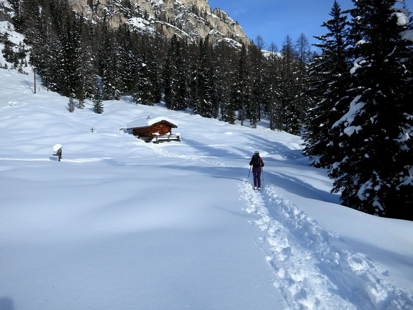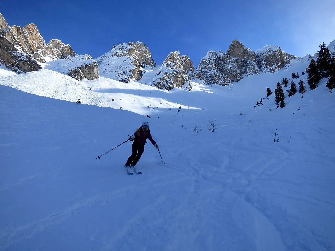 Die Skitour auf den Col di Riciogogn gehört zu den schönsten Touren in den Pragser Dolomiten. Technisch ist die Tour recht einfach und nur wenige etwas anspruchsvollere Passagen sind zu überwinden. Allerdings sind am Gipfelgrat Harscheisen sehr ratsam, da dieser sehr steil ist und bei ungünstigen Bedingungen Abrutschgefahr besteht! Vom Gipfel hat man einen wunderschönen Blick auf den Naturpark Fanes-Sennes und die rundumliegende Bergwelt. Die Abfahrt durch das Lärchental bzw. Grünwaldtal bietet sehr schöne Hänge, die man allerdings nur bei sehr sicheren Bedingungen befahren kann! Auch bei der heutigen Tour waren einige Lawinenabbruchstellen zu sehen! Von der Alten Kaser bis zum Ausgangspunkt sollte man einen gut gewachsten Ski haben, da das Gelände ziemlich flach wird. Auch die letzten Meter entlang des Pragser Wildsees sind nur mit Stockeinsatz und Skatingschritt zu überwinden! Daher ist diese Skitour erst am Auto wirklich zu ende und man sollte bis zum Schluss noch über genügend Kraftreserven verfügen! Erwähnenswert ist auch, dass vor allem bei der Abfahrt durch das Grünwaldtal auf die zahlreichen Schneeschuhwanderer zu achten ist und man mit der notwendigen Aufmerksamkeit abfahren sollte!