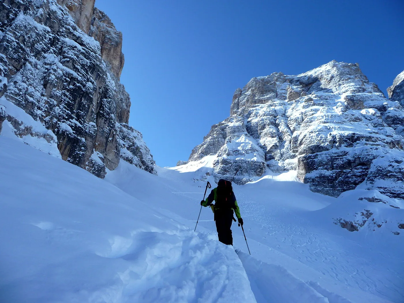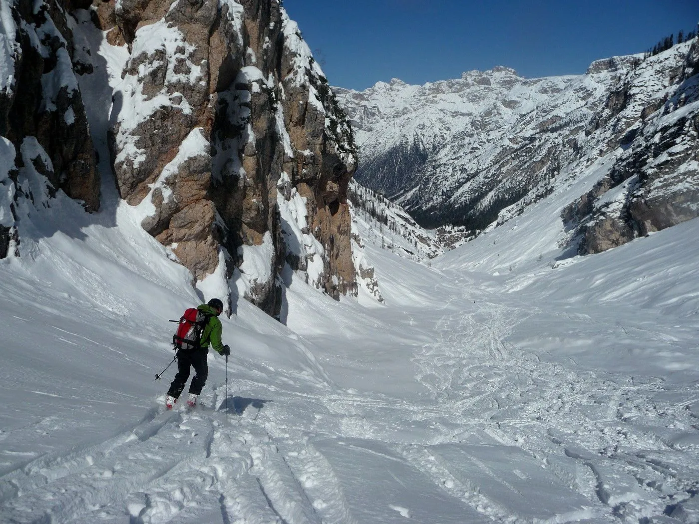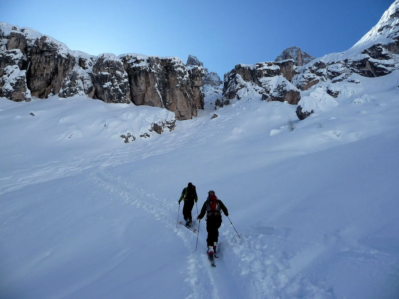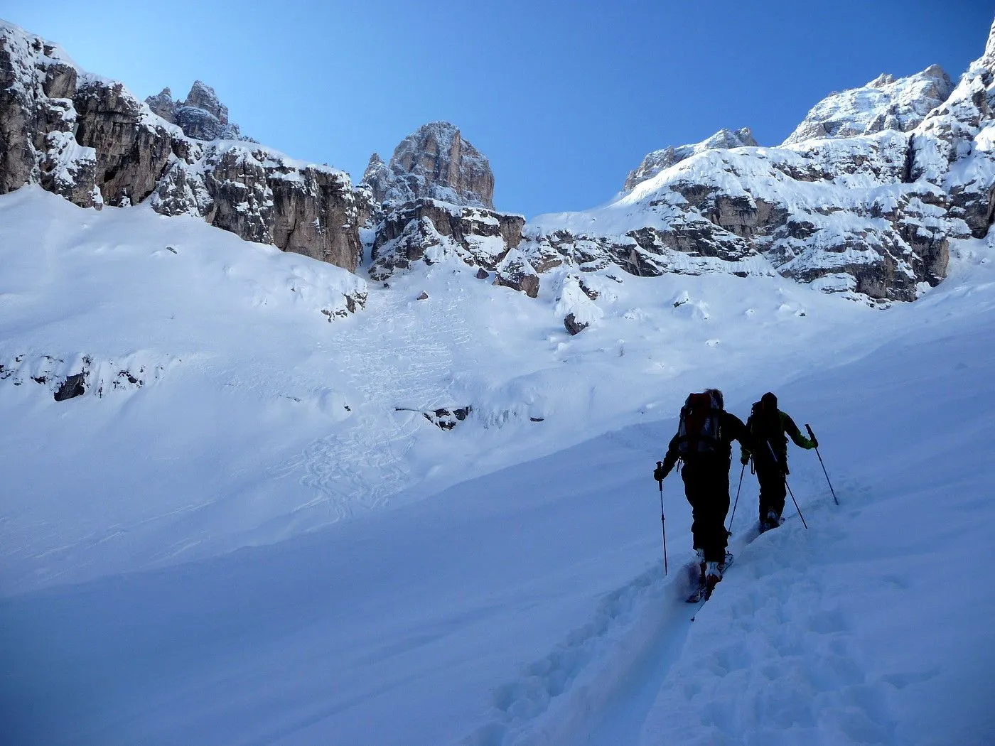 Die Skitour zur Cristallo Scharte (2808m) ist ein absoluter Hochkaräter in den Ampezzaner Dolomiten und besticht durch ihre dramatische, hochalpine Szenerie. Das Erlebnis beginnt im tief eingeschnittenen Val Fonda, das sich wie ein gewaltiger Canyon zwischen den massiven Felswänden hindurchzieht, bevor es sich in das beeindruckende Kar "Circo del Cristallo" öffnet. Konditionell ist die Tour aufgrund der 1300 Höhenmeter fordernd; technisch liegt die größte Hürde am zentralen Felsriegel. Dieser Durchschlupf erfordert bei harten Verhältnissen absolute Trittsicherheit und oft den Einsatz von Steigeisen oder Harscheisen im Stapf-Aufstieg. Dank der schattigen Nordlage ist die Tour oft ein Garant für exzellenten Pulverschnee bis weit in das Frühjahr hinein, setzt jedoch eine sehr sichere Lawinenlage voraus. Zusammenfassend ist die Cristallo Scharte eine technisch wie landschaftlich grandiose Unternehmung für erfahrene Skibergsteiger, die alpine Einsamkeit in einer der spektakulärsten Felskulissen der Alpen suchen.