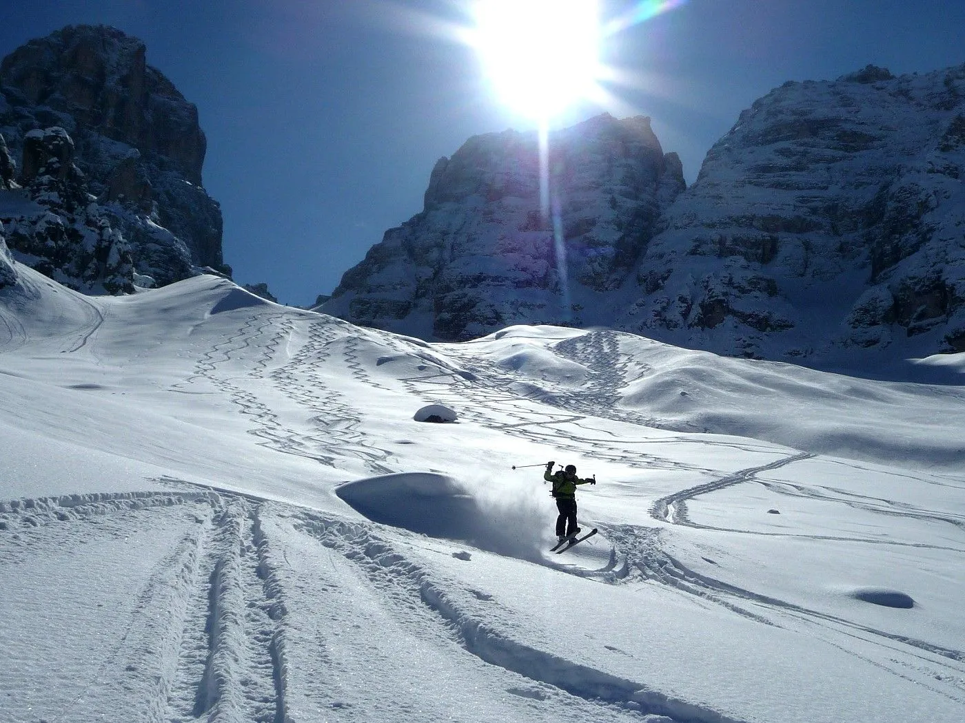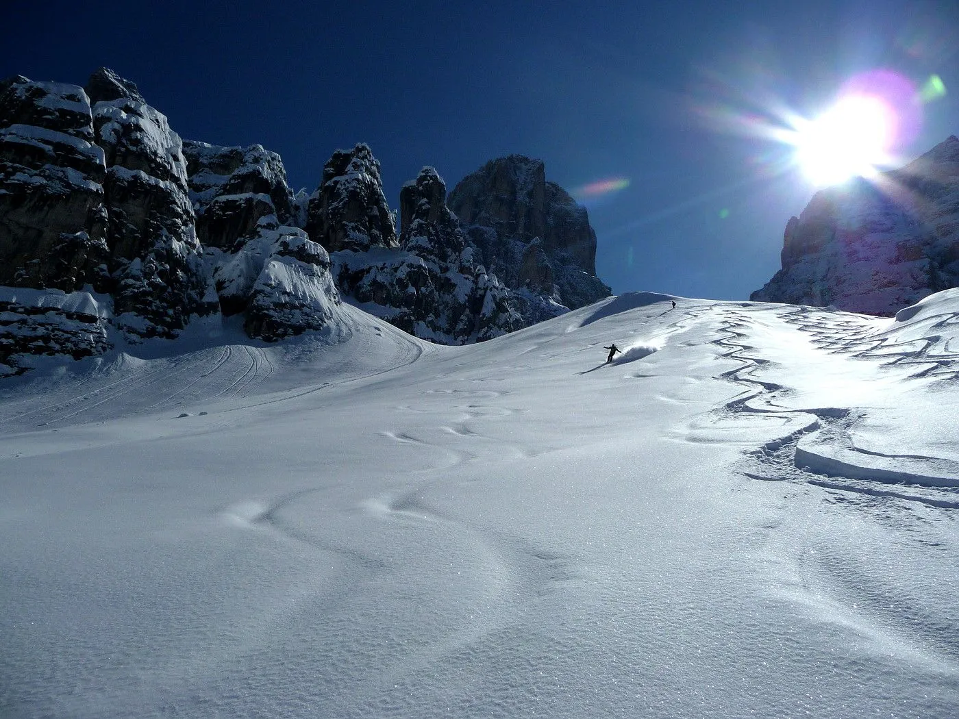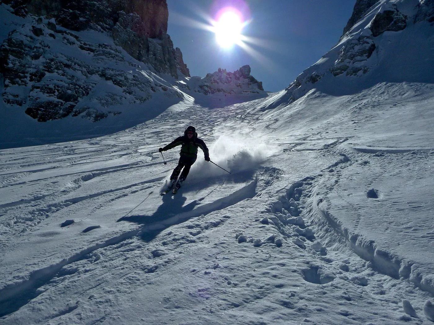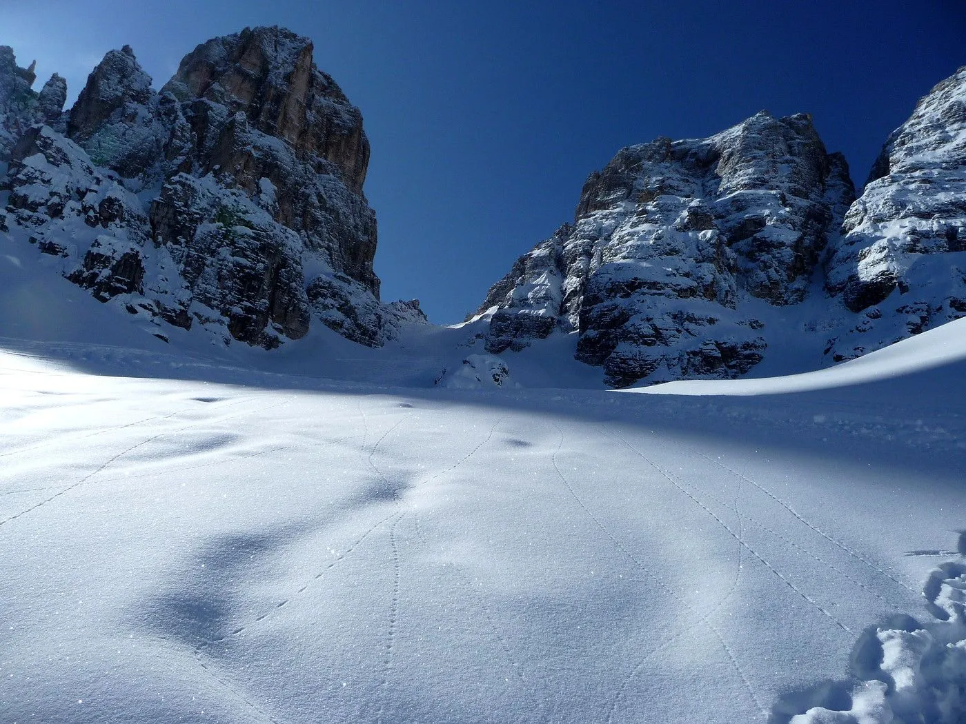 Die Skitour zur Cristallo Scharte (2808m) ist ein absoluter Hochkaräter in den Ampezzaner Dolomiten und besticht durch ihre dramatische, hochalpine Szenerie. Das Erlebnis beginnt im tief eingeschnittenen Val Fonda, das sich wie ein gewaltiger Canyon zwischen den massiven Felswänden hindurchzieht, bevor es sich in das beeindruckende Kar "Circo del Cristallo" öffnet. Konditionell ist die Tour aufgrund der 1300 Höhenmeter fordernd; technisch liegt die größte Hürde am zentralen Felsriegel. Dieser Durchschlupf erfordert bei harten Verhältnissen absolute Trittsicherheit und oft den Einsatz von Steigeisen oder Harscheisen im Stapf-Aufstieg. Dank der schattigen Nordlage ist die Tour oft ein Garant für exzellenten Pulverschnee bis weit in das Frühjahr hinein, setzt jedoch eine sehr sichere Lawinenlage voraus. Zusammenfassend ist die Cristallo Scharte eine technisch wie landschaftlich grandiose Unternehmung für erfahrene Skibergsteiger, die alpine Einsamkeit in einer der spektakulärsten Felskulissen der Alpen suchen.
