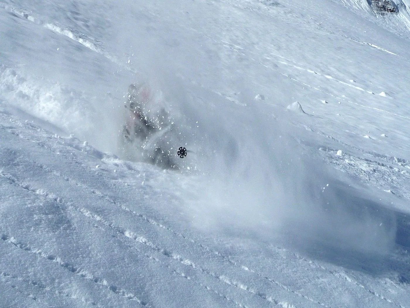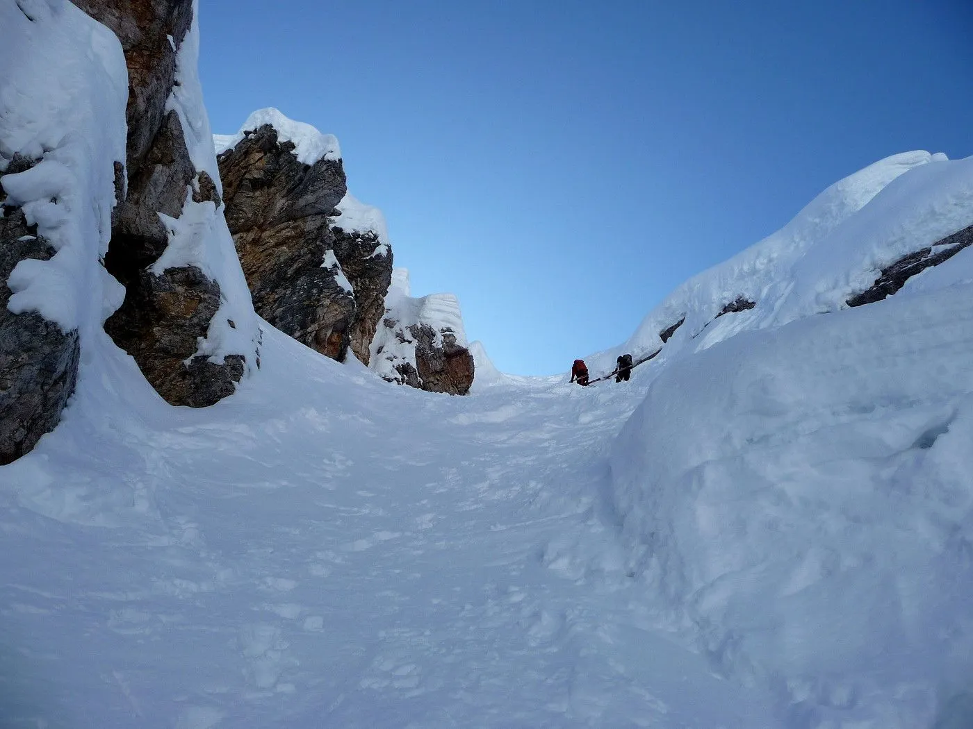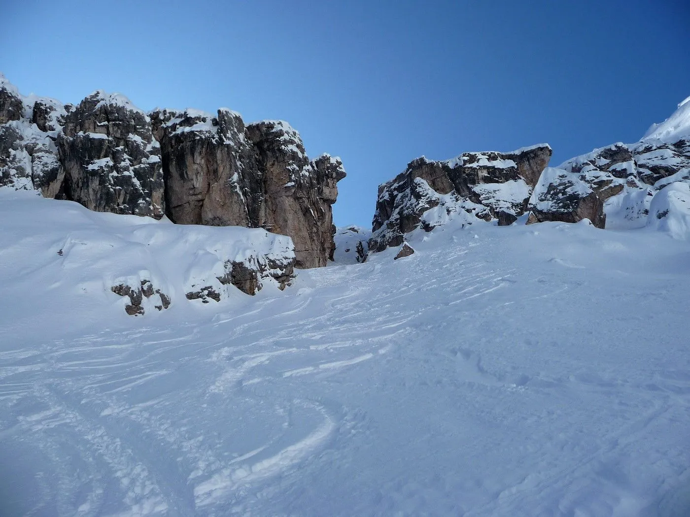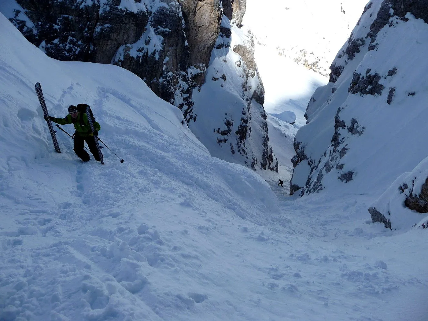 Sanft ansteigend erreicht man einen eindrucksvollen Kessel und erspäht auch schon linkerhand die Schlüsselstelle dieser Tour: den Durchschlupf durch den sperrenden Felsriegel (Schlüsselstelle) (2350m). Über den zunehmend steiler und enger werdenden Hang steigt man mit Ski so weit wie möglich hinauf. Achtung: Sobald das Gelände für Ski zu steil oder harschig wird, stapft man zu Fuß durch die jetzt sehr steile Rinne empor (bei ungünstigen Verhältnissen können hier Harscheisen oder sogar Steigeisen zwingend notwendig sein!).